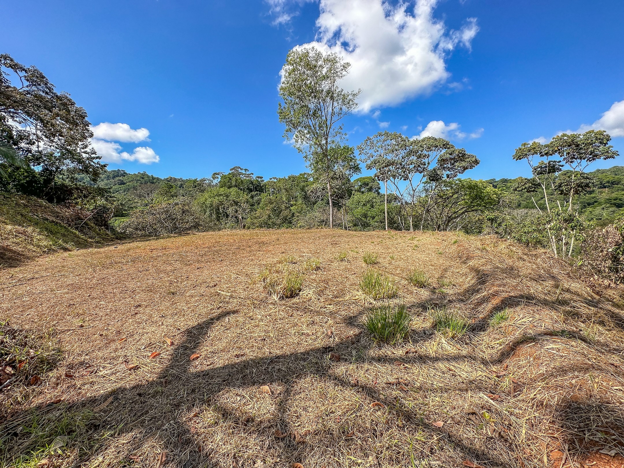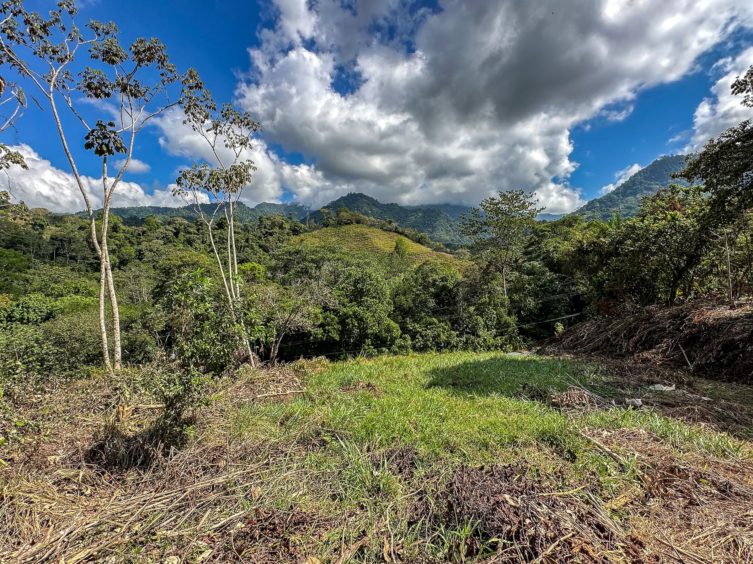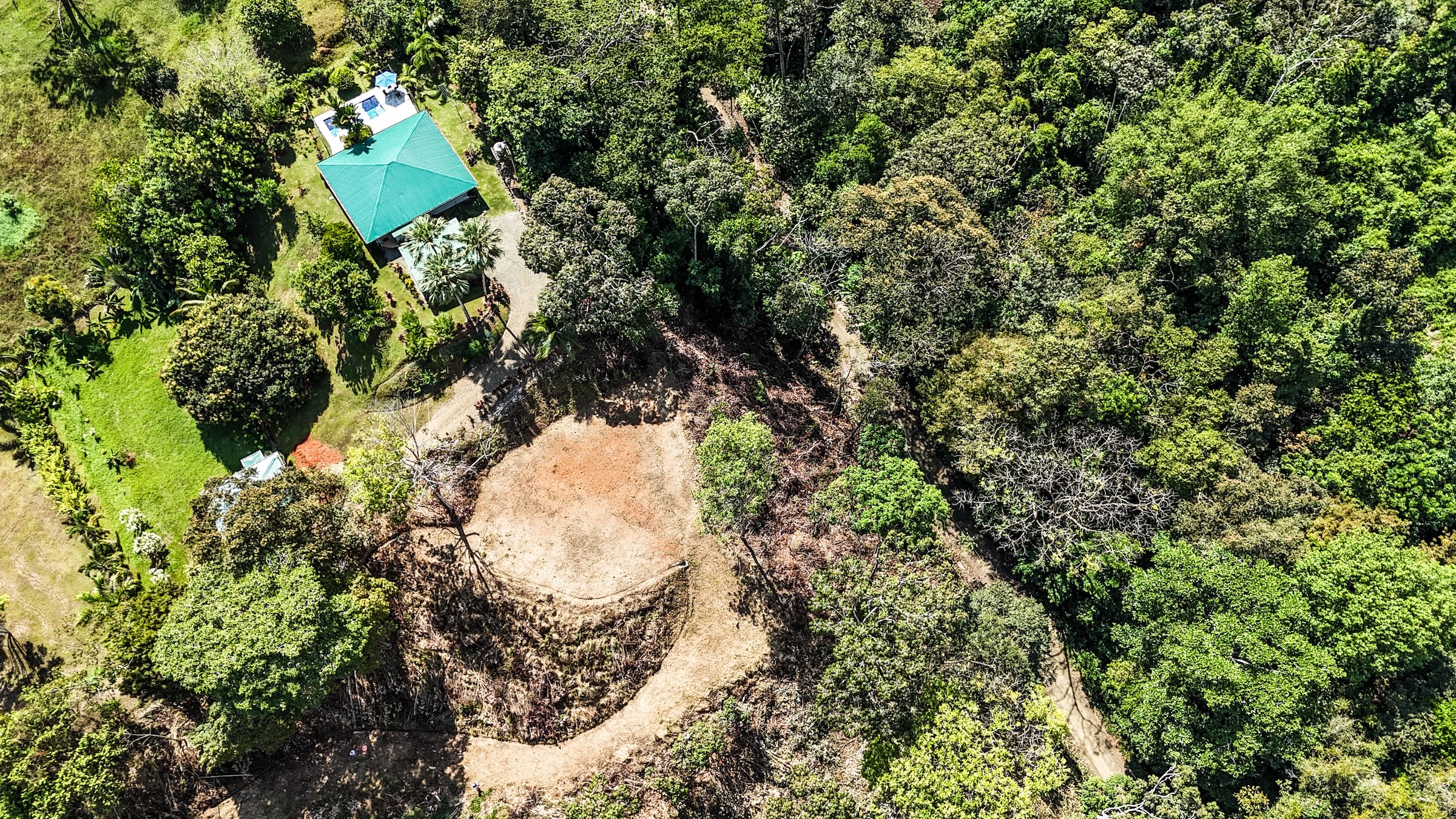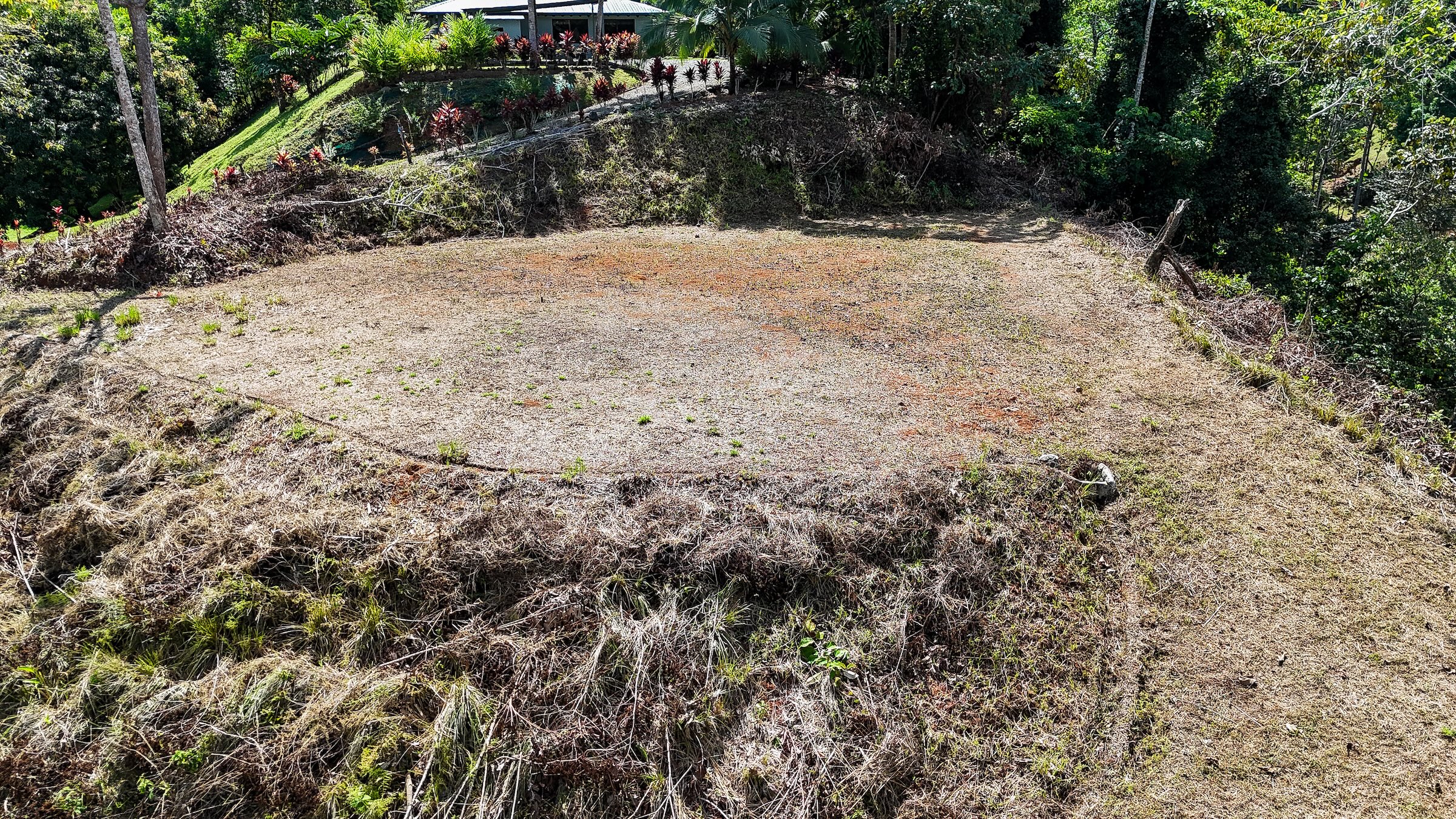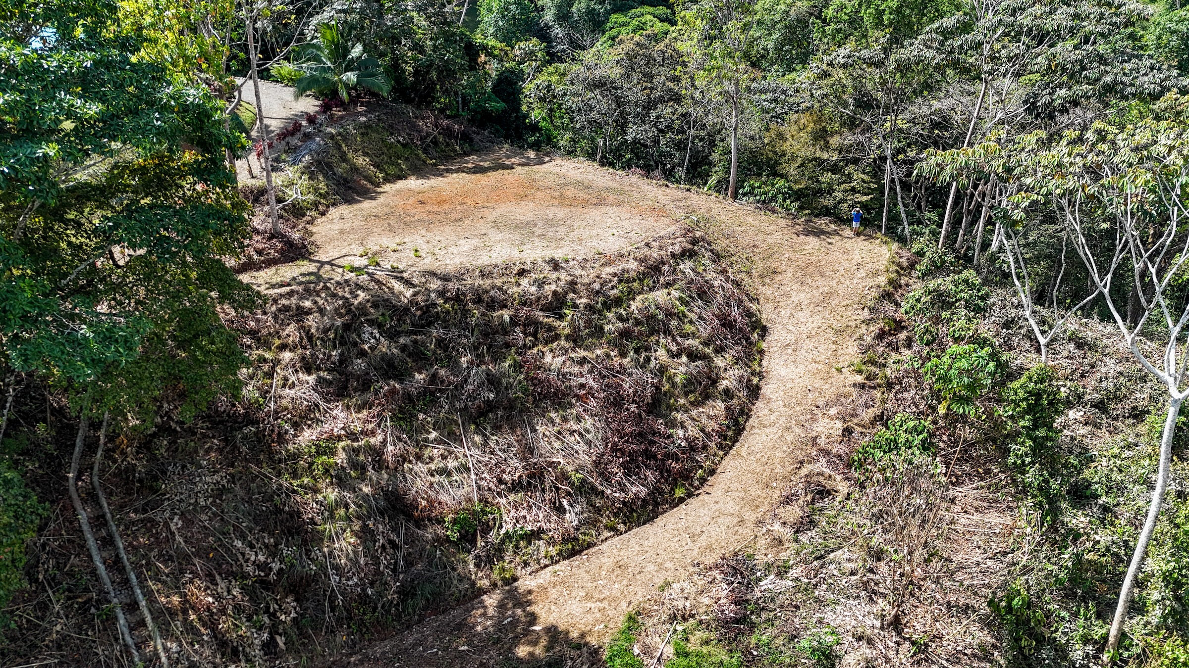 Ambas áreas son planas y ofrecen hermosas vistas hacia las colinas, la selva y las montañas costeras que se elevan hasta más de 1300 metros sobre el Pacífico. Estas montañas suelen cubrirse de neblina y nubes que se deslizan entre los bosques, creando un paisaje espectacular donde incluso pueden observarse cascadas descendiendo por sus laderas. La zona es hogar de abundante fauna silvestre como guacamayas, tucanes, monos capuchinos y aulladores, además de mariposas morfo azules y muchas otras especies que forman parte del entorno natural. El sonido de un río cercano se puede escuchar desde cualquier punto de la propiedad, incluso durante la estación seca.