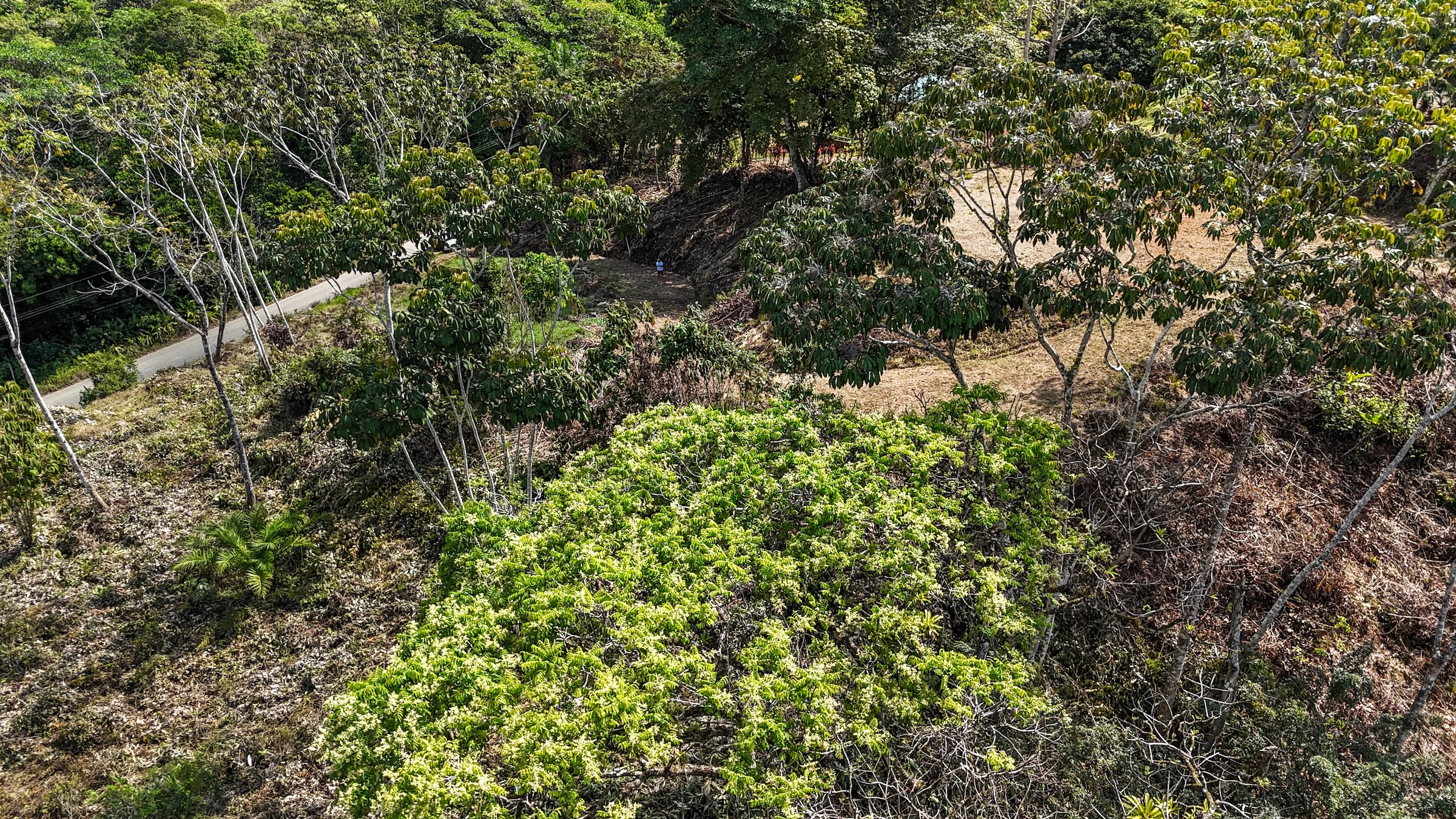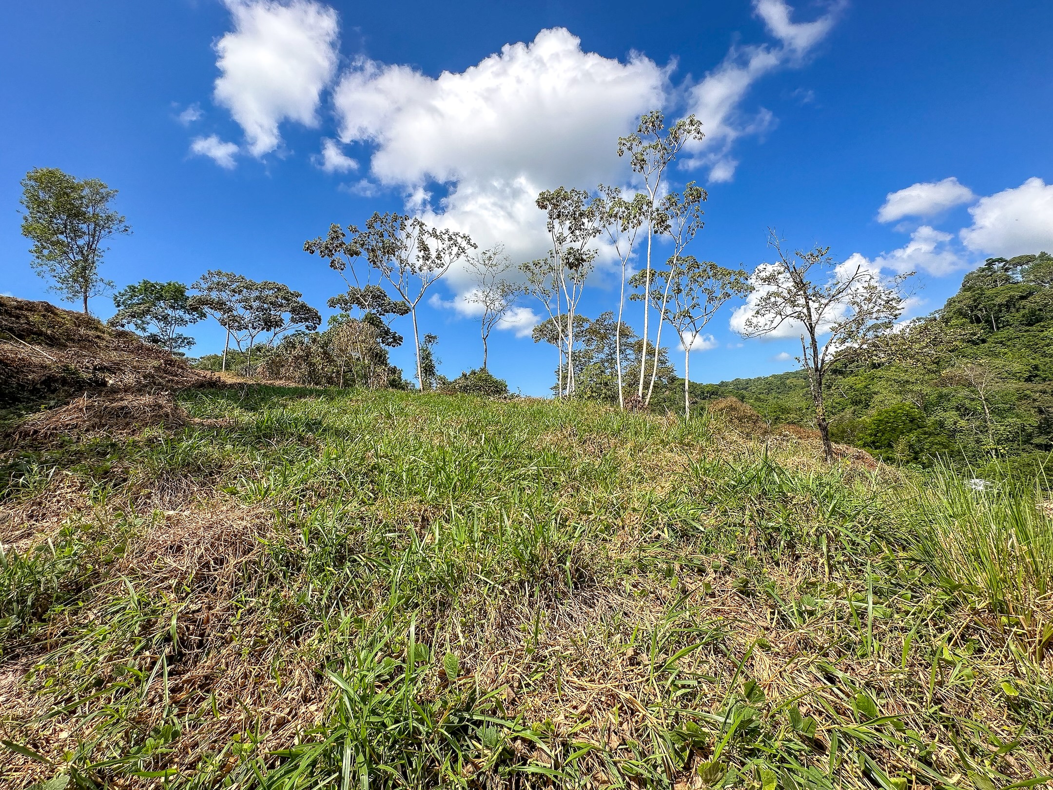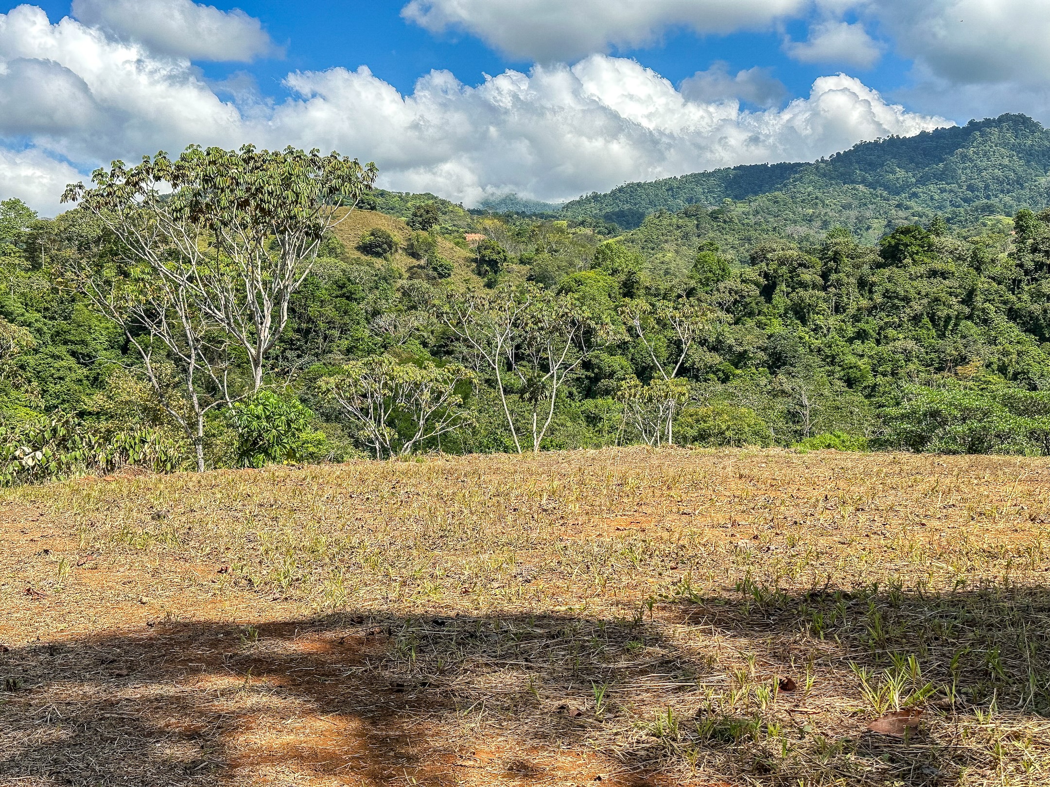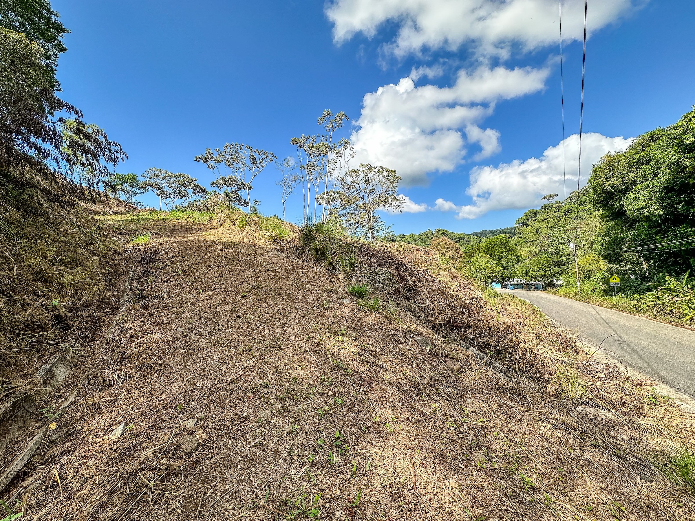Ambas áreas son planas y ofrecen hermosas vistas hacia las colinas, la selva y las montañas costeras que se elevan hasta más de 1300 metros sobre el Pacífico. Estas montañas suelen cubrirse de neblina y nubes que se deslizan entre los bosques, creando un paisaje espectacular donde incluso pueden observarse cascadas descendiendo por sus laderas. La zona es hogar de abundante fauna silvestre como guacamayas, tucanes, monos capuchinos y aulladores, además de mariposas morfo azules y muchas otras especies que forman parte del entorno natural. El sonido de un río cercano se puede escuchar desde cualquier punto de la propiedad, incluso durante la estación seca.