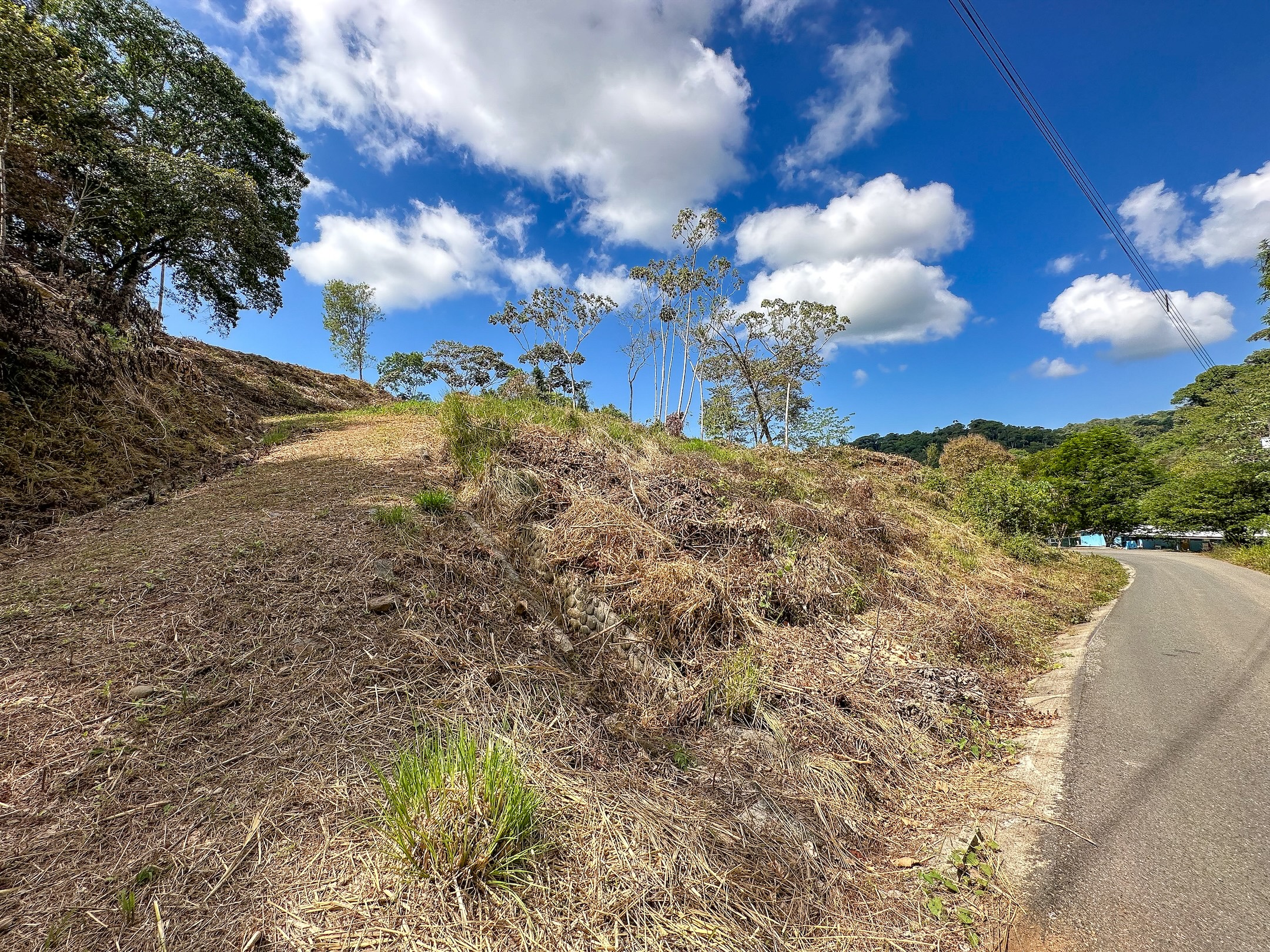 The property has frontage along a paved public road and is accessed via a well-maintained internal driveway. The road first leads to a building platform located halfway up the hillside and then continues to a second platform situated at the top of the property.