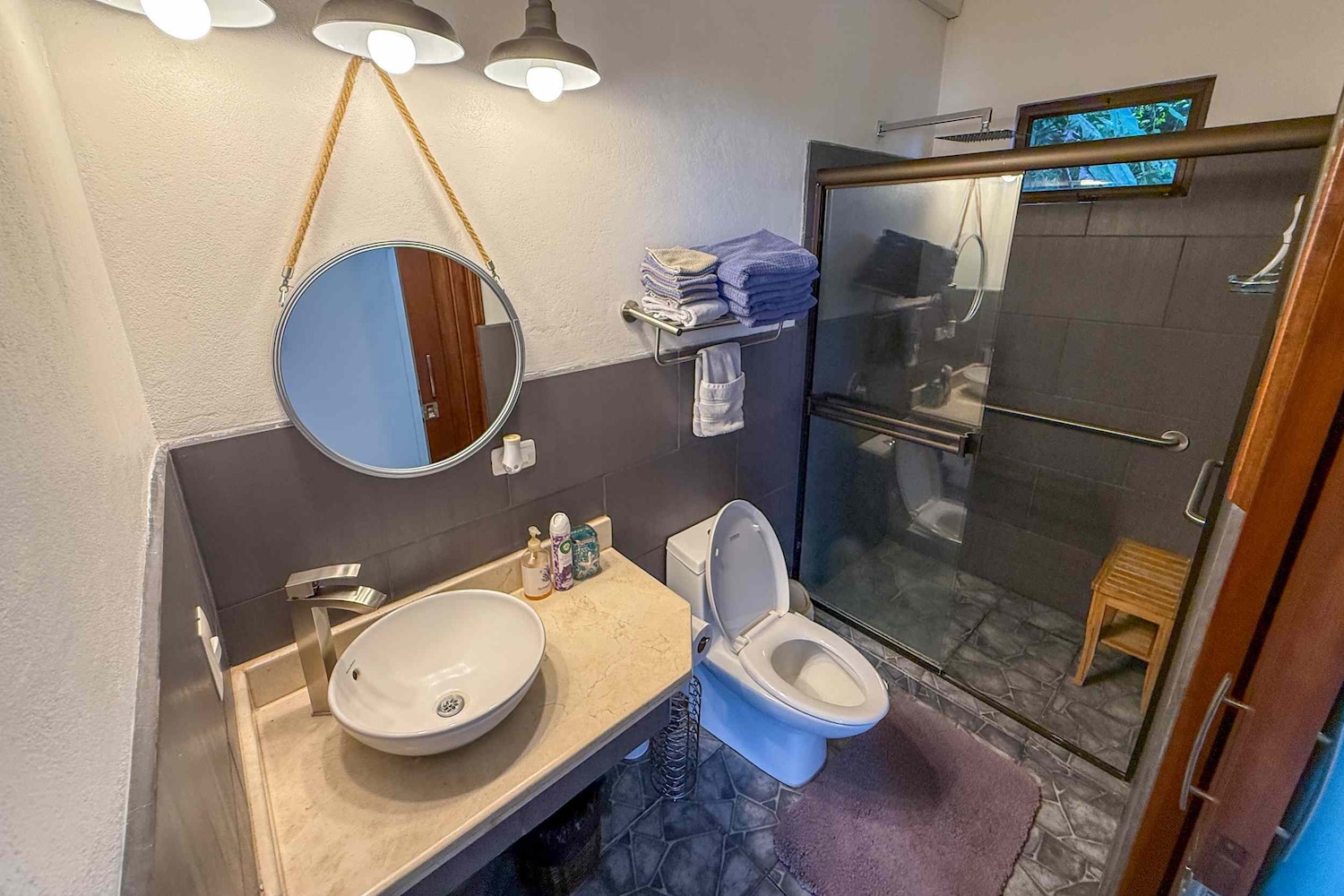 Nivel principal: Un dormitorio con baño completo brinda una opción práctica y cómoda para huéspedes, personas con movilidad reducida o quienes prefieren evitar las escaleras.