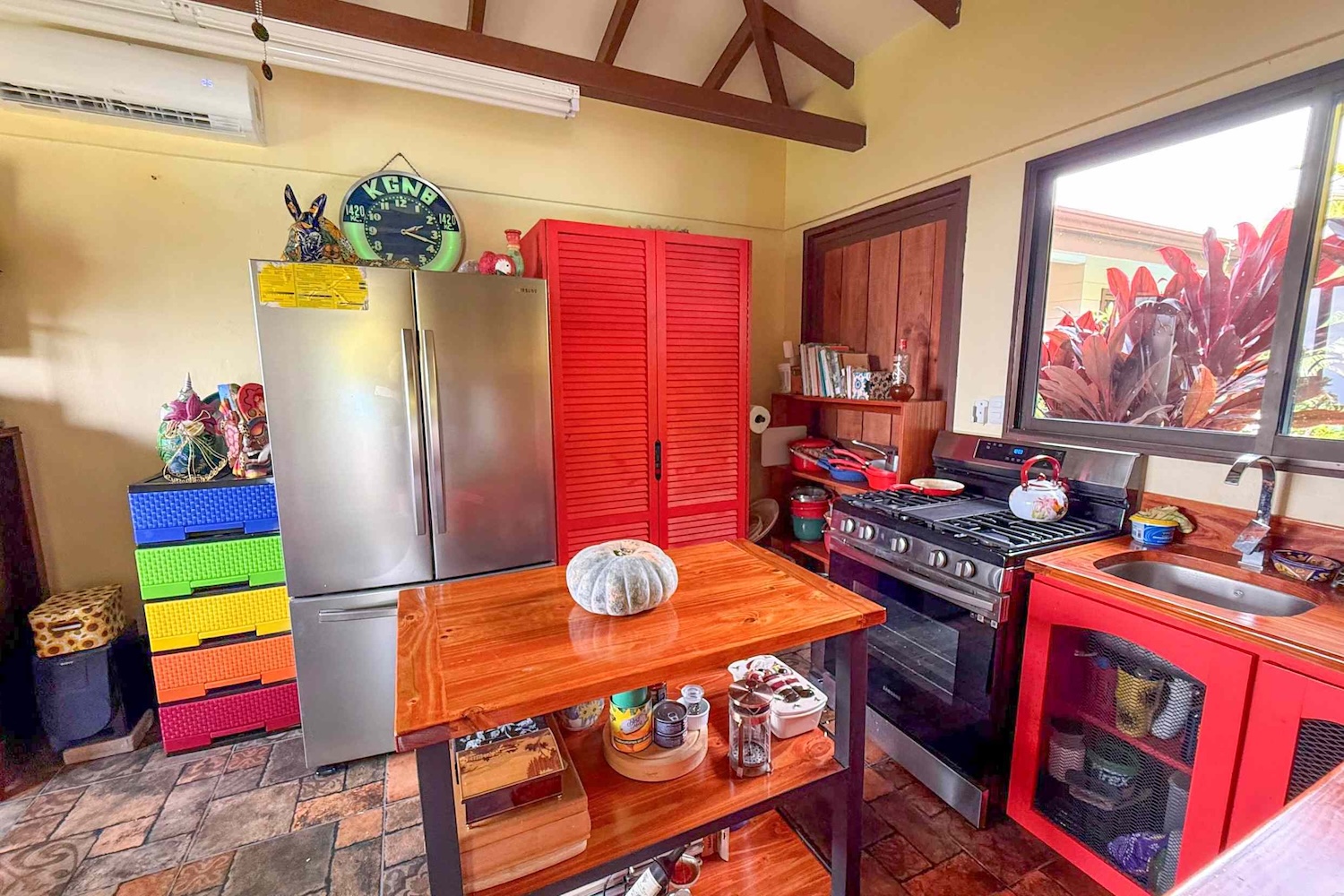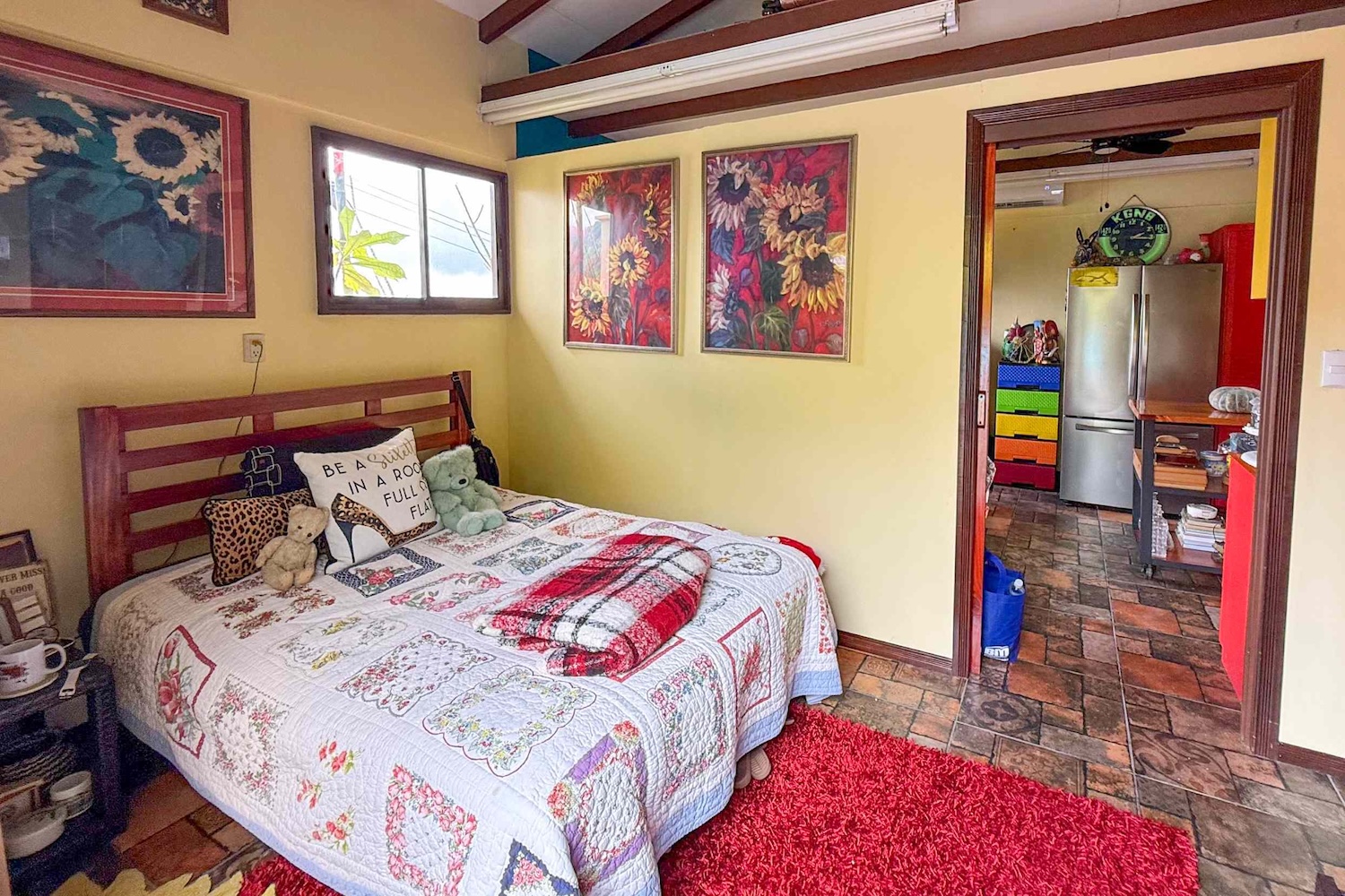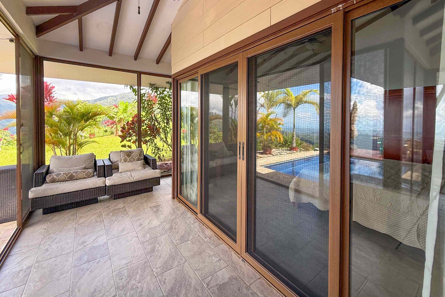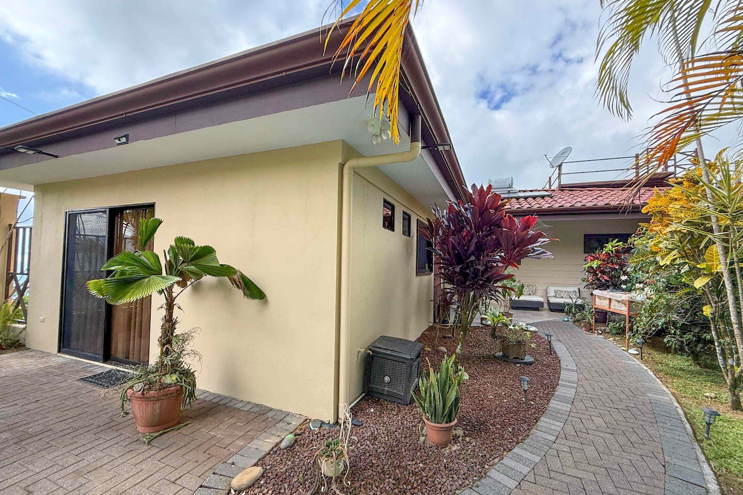 Indoor-Outdoor Connection: The living room opens to a charming covered patio, ideal for outdoor dining, morning coffee, or simply relaxing in the tropical breeze.