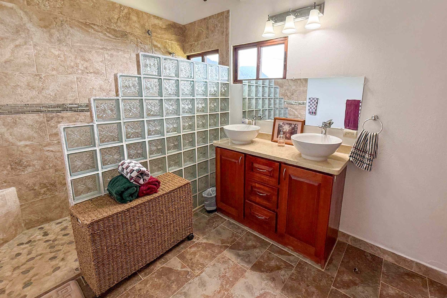Master Suites con vistas inigualables: Dos dormitorios principales cuentan con baños privados, elegantes muebles de madera local, vestidores espaciosos y acceso directo a la terraza, garantizando vistas al mar desde la cama. Los baños destacan por sus detalles en piedra y azulejos.