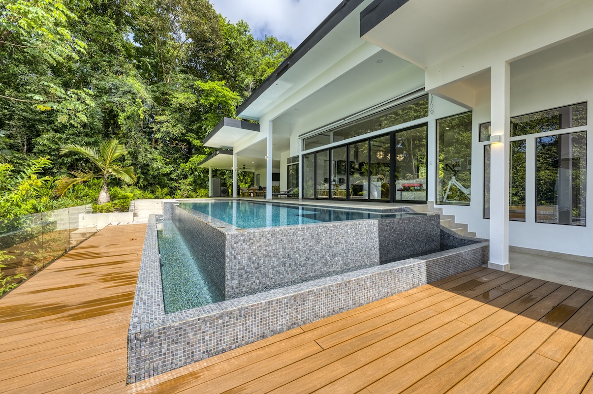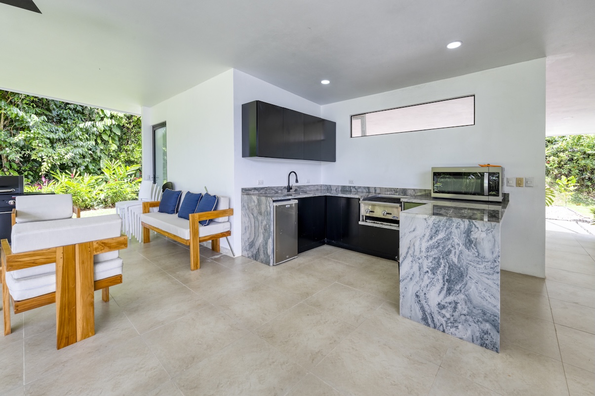 La transición entre interior y exterior es impecable gracias a puertas corredizas panorámicas que se abren hacia una amplia terraza de composite. Allí encontrará una espectacular piscina infinita de doble borde y un área de comedor y barbacoa al aire libre. El patio cubierto está completamente equipado con parrilla, refrigerador, fregadero y un baño con ducha exterior, creando un espacio ideal tanto para eventos sociales como para relajarse en completa tranquilidad.