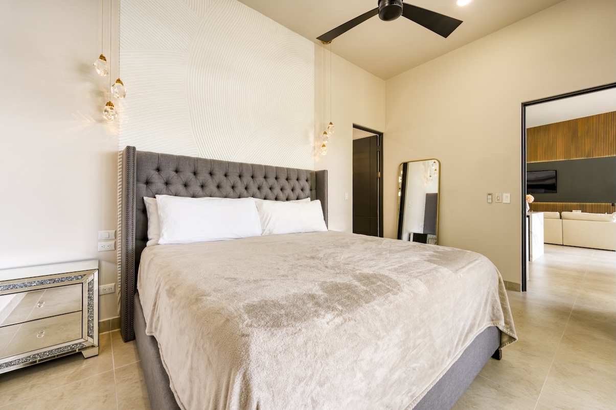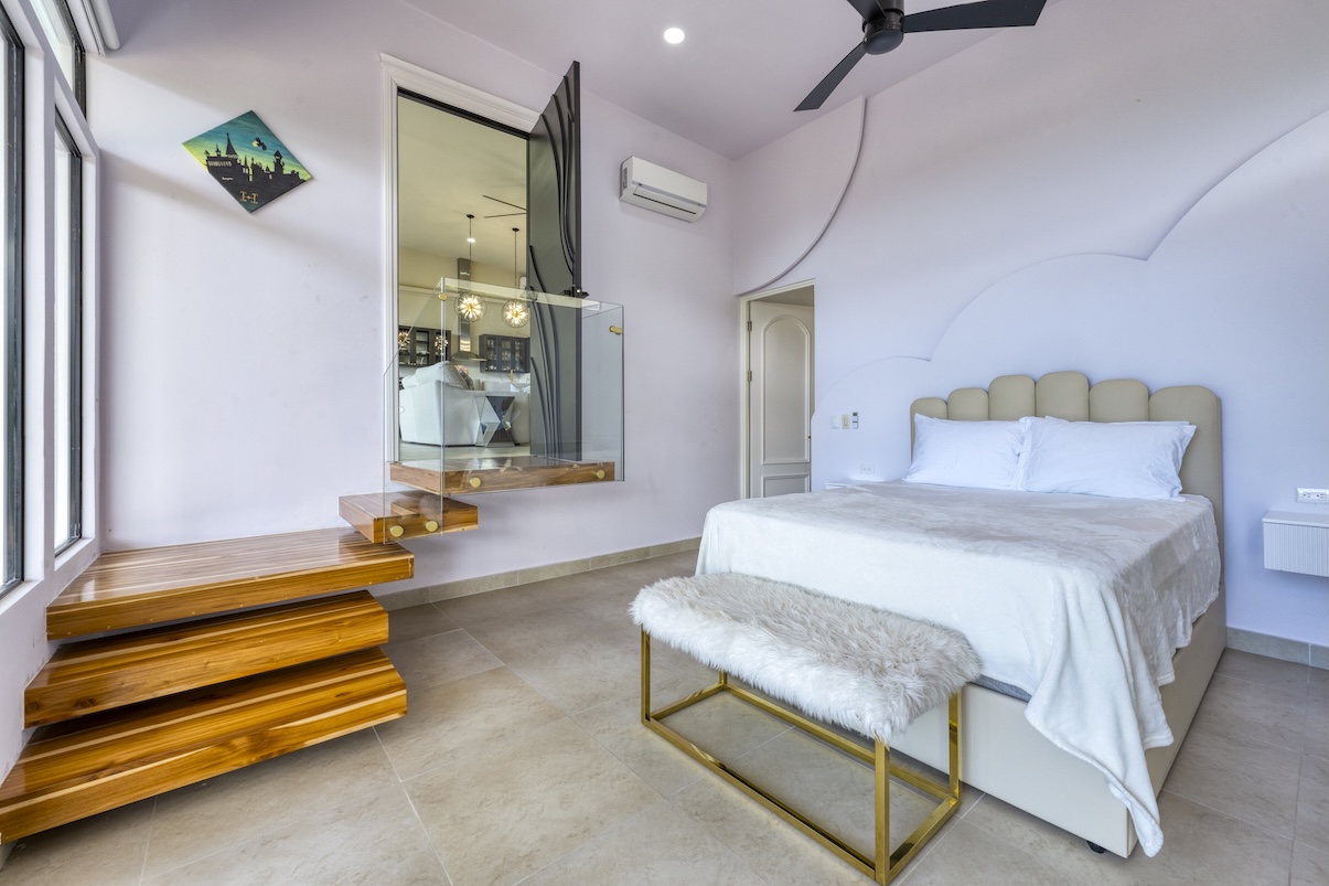 The master suite is a true private retreat with direct access to the terrace, a spa-like bathroom with a deep soaking tub, ambient LED lighting, a double vanity with natural stone surfaces, and a spacious, well-designed walk-in closet. In the opposite wing, a second suite offers breathtaking coastal views, access via a teak staircase, built-in wardrobes, and a luxurious en-suite bathroom. The third bedroom, connected by an interior hallway, opens onto the wraparound terrace and shares a full bathroom with the living room.