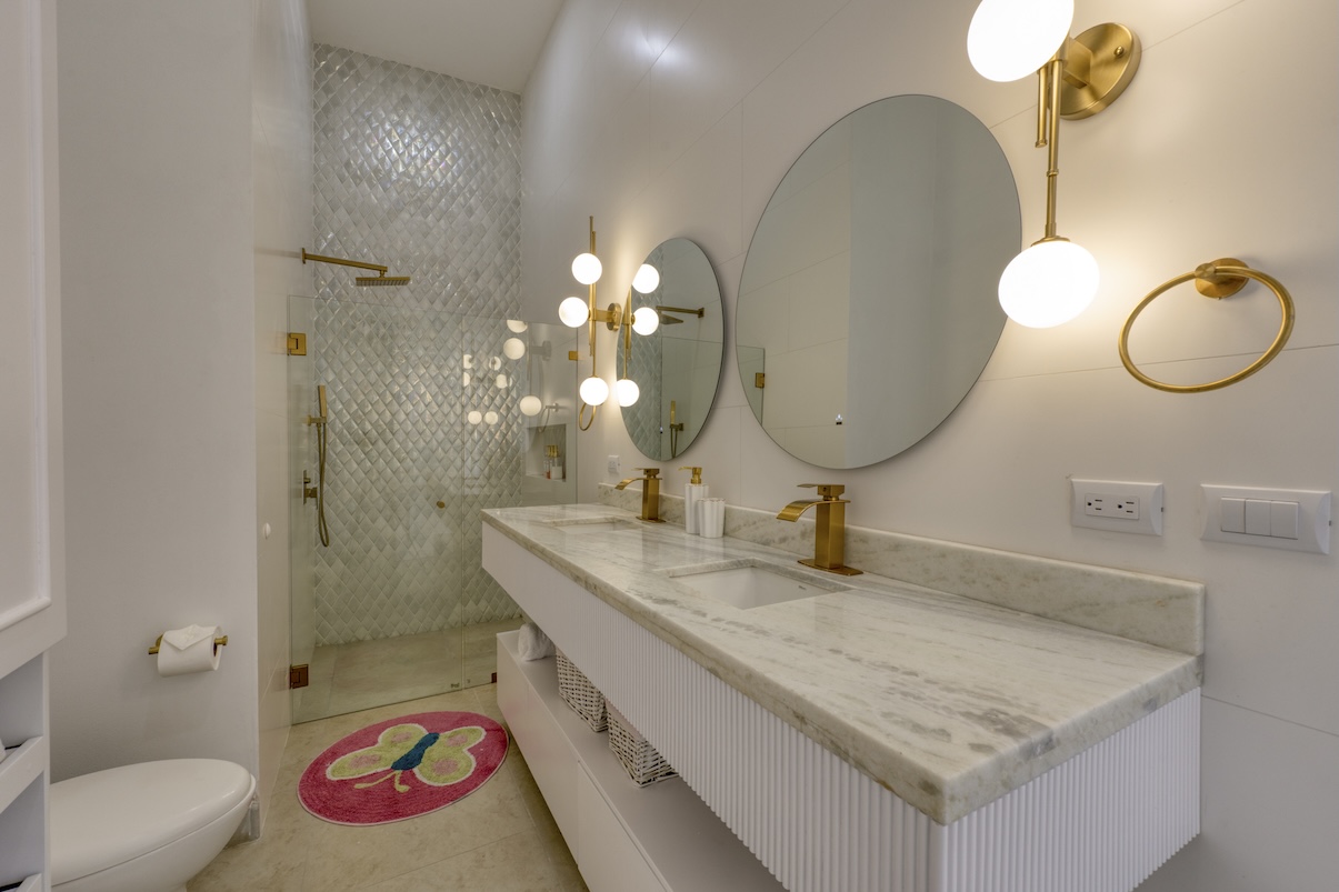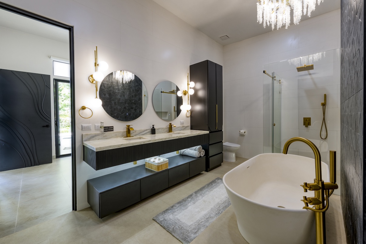 The transition between indoors and outdoors is seamless thanks to panoramic sliding doors that open onto a spacious composite deck. There you’ll find a spectacular double-edged infinity pool and an outdoor dining and barbecue area. The covered patio is fully equipped with a grill, refrigerator, sink, and an outdoor shower, creating an ideal space for both social gatherings and relaxing in complete tranquility.