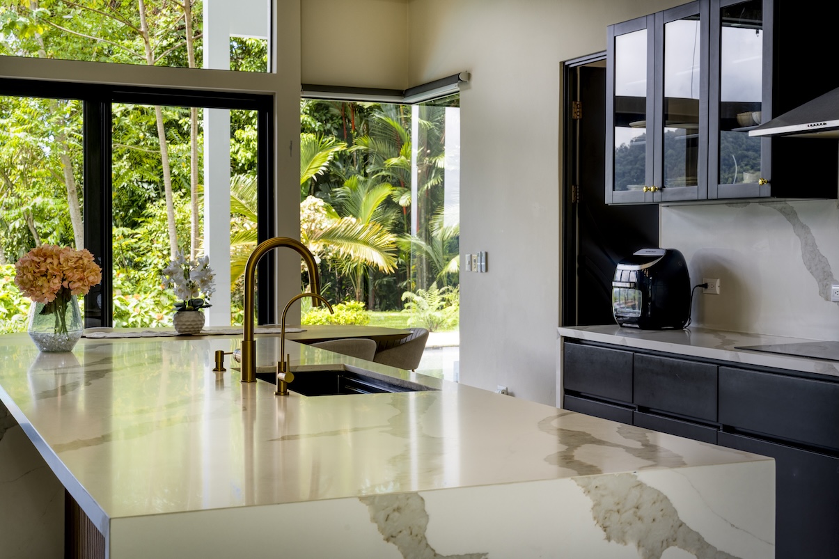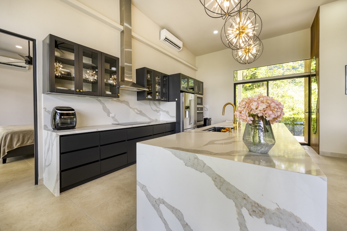El corazón de la casa es una amplia sala de concepto abierto perfecta para recibir invitados. La cocina gourmet incluye encimeras de cuarzo, una isla con borde en cascada, gabinetes a medida y electrodomésticos de alta gama: refrigerador KitchenAid de puerta francesa, lavavajillas CAFE de dos cajones, máquina de hielo bajo encimera y un set de horno y microondas empotrados.