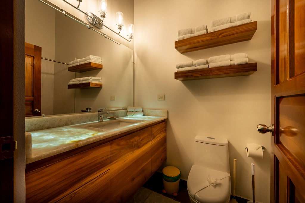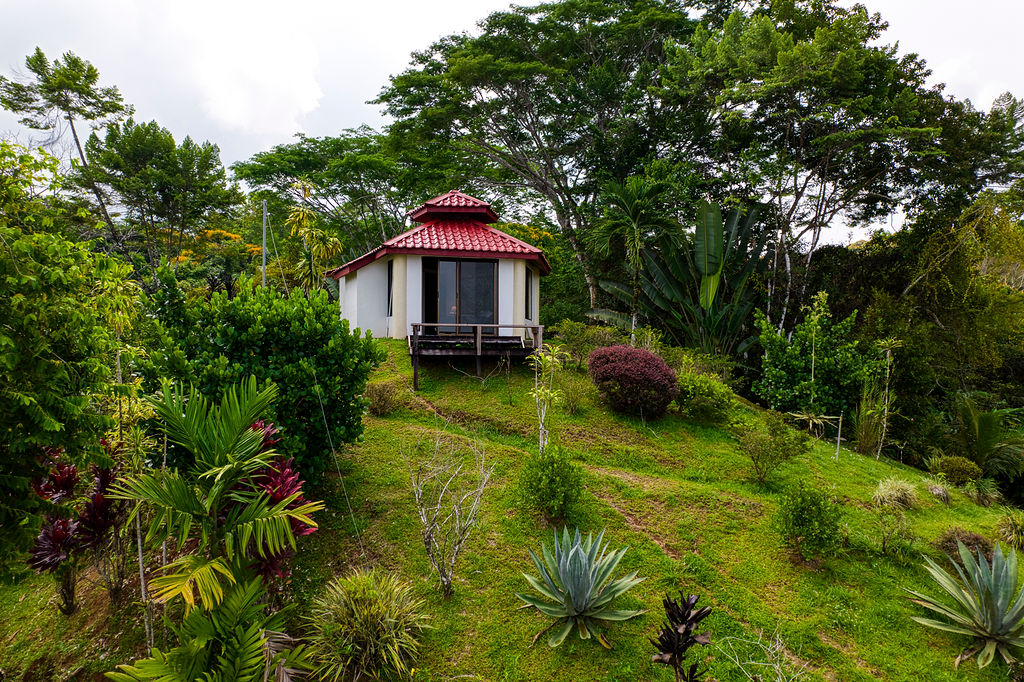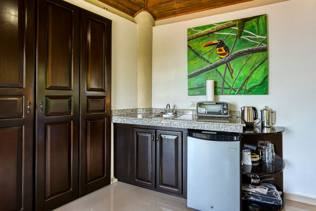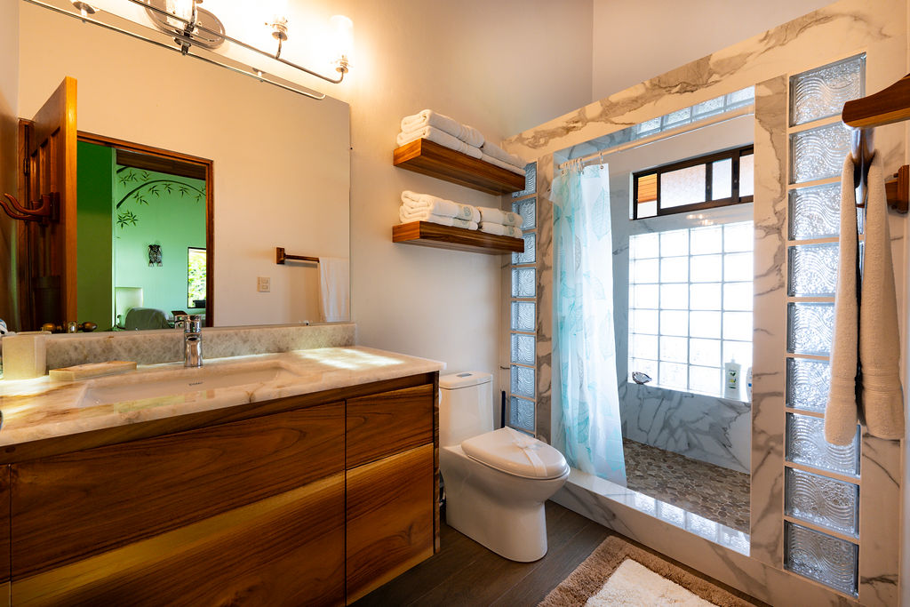 The guest casita is located above the home with concrete staircase to access for a 4th bedroom. Set up as a studio with queen bed, full bathroom, and counter with sink including coffee maker, toaster, and small dorm size fridge. This casita also enjoys outstanding ocean and mountain views.