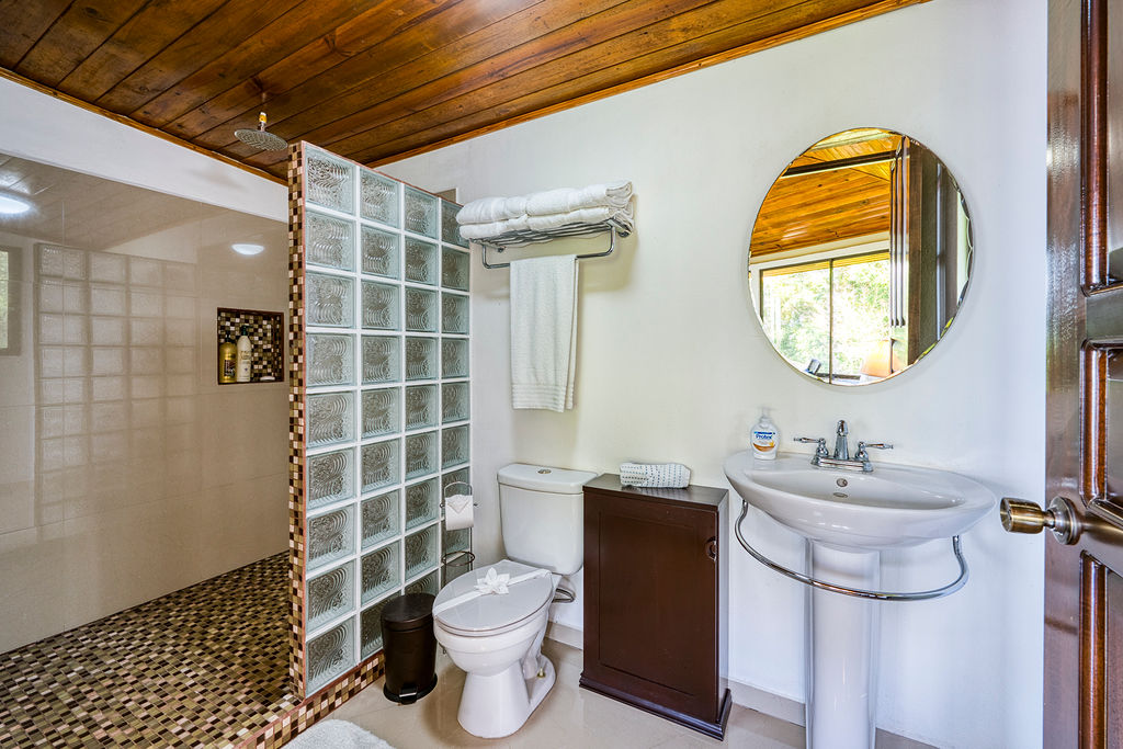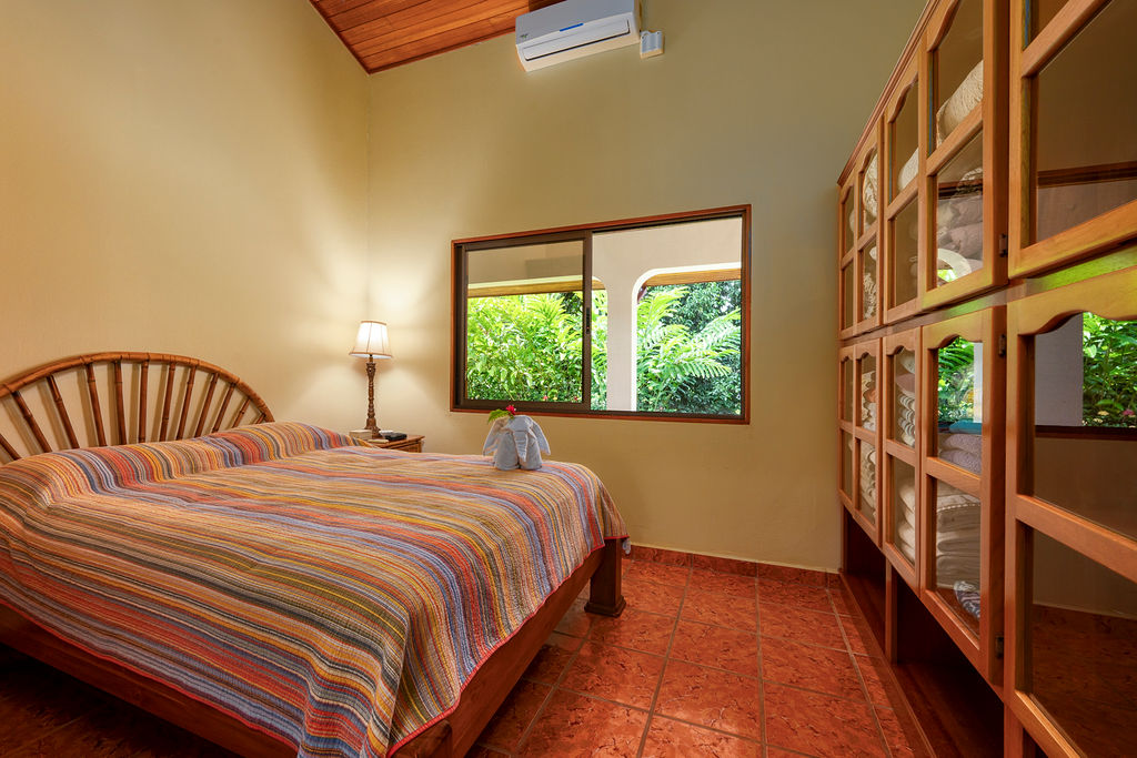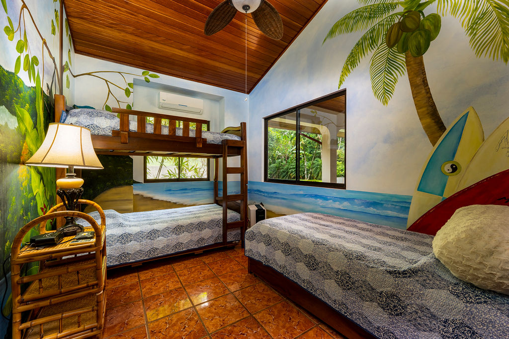 The main house has 3 bedrooms and 2 full baths. The principal suite is expansive with a king size bed and ensuite bathroom plus walk in closet. The guest bedrooms share a hallway bathroom. One room has a queen size bed and the other has bunk beds and an additional twin size bed (3 twins in total). The bedrooms in the main house have A/C, however at about 1,000 feet elevation the nightly temperatures are pleasant enough you may not need them.