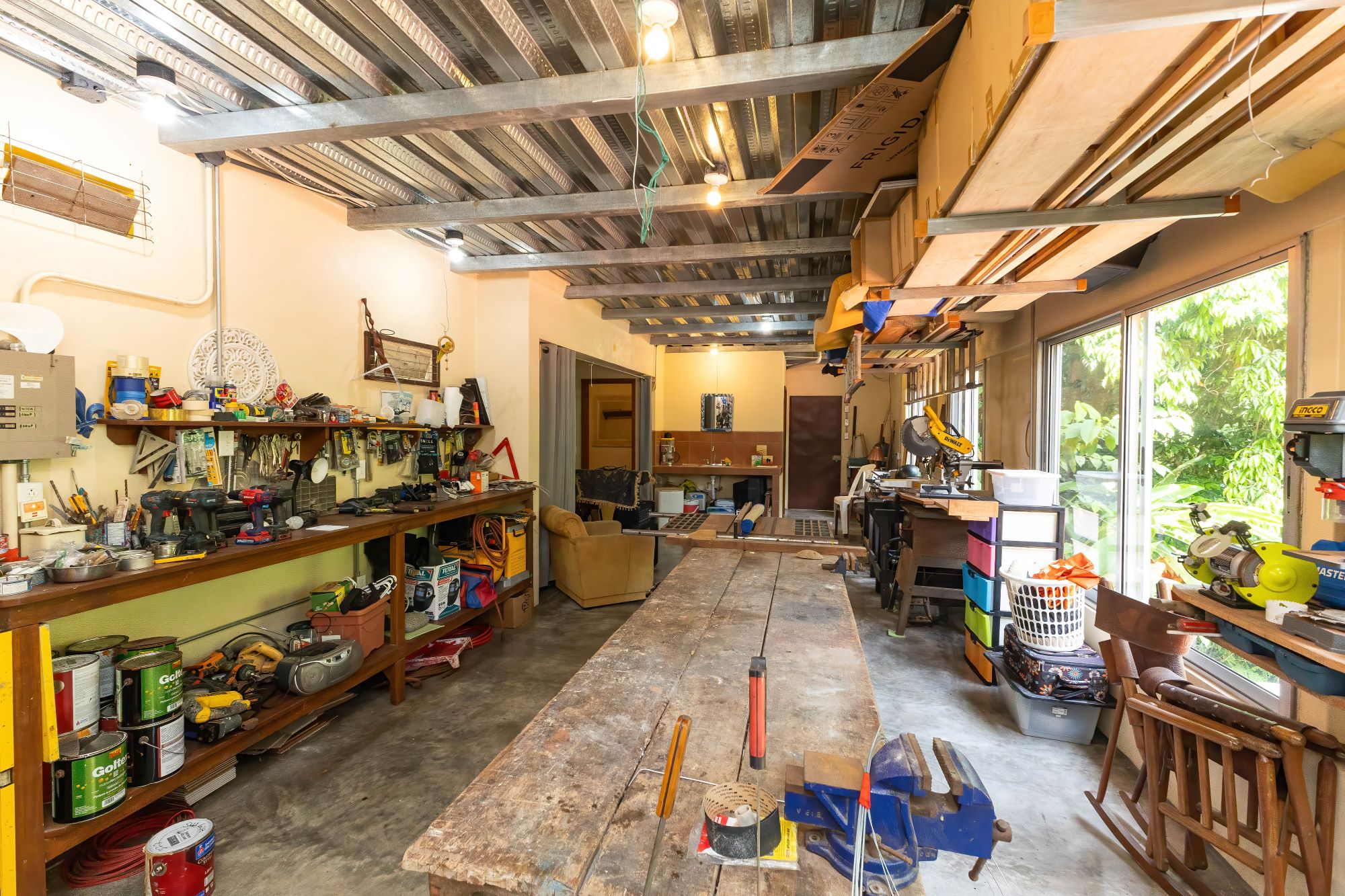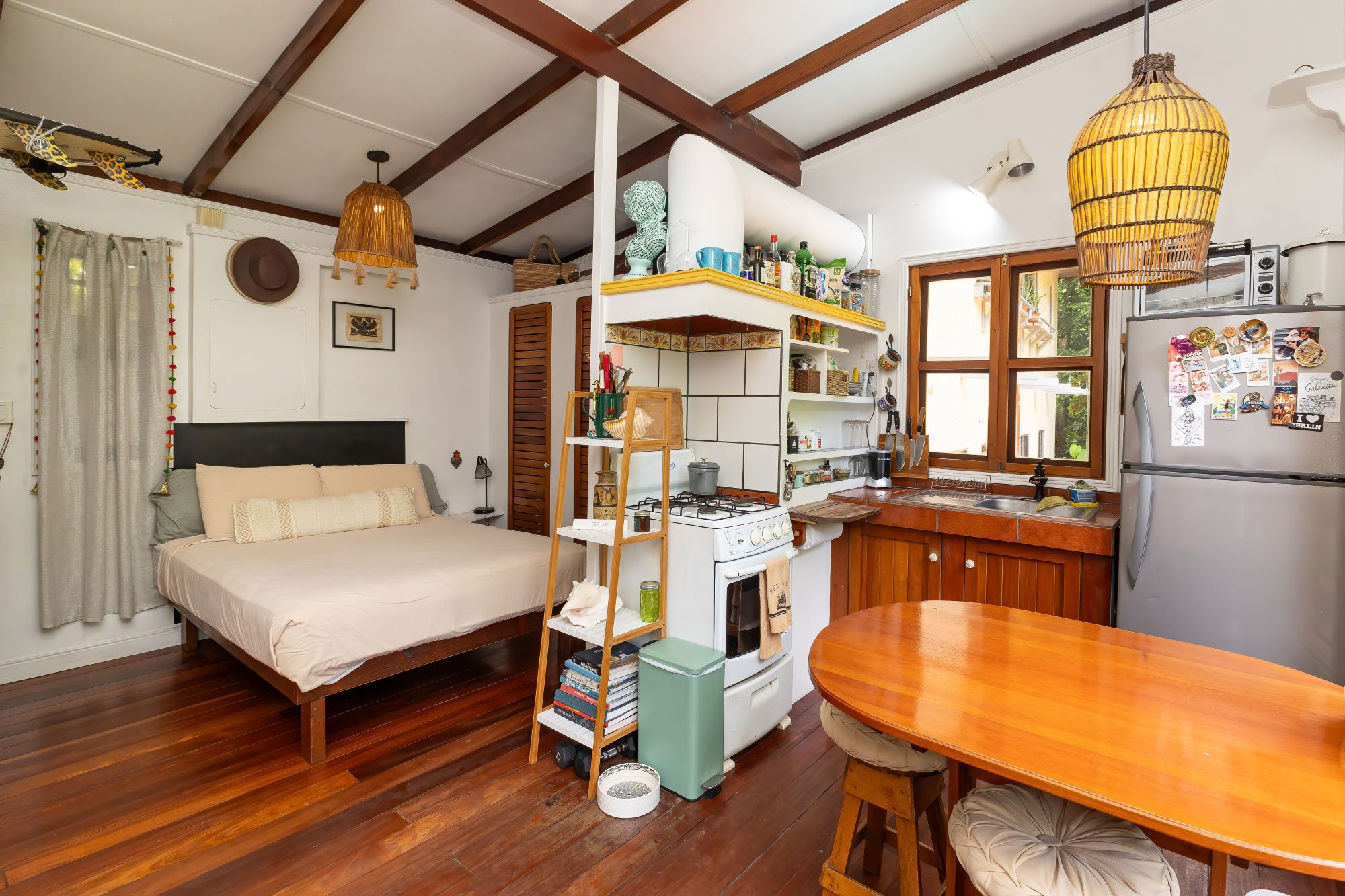 A self-contained workshop with a bedroom and bathroom, ideal for converting into an additional living unit, a private owner’s suite, or a creative studio.