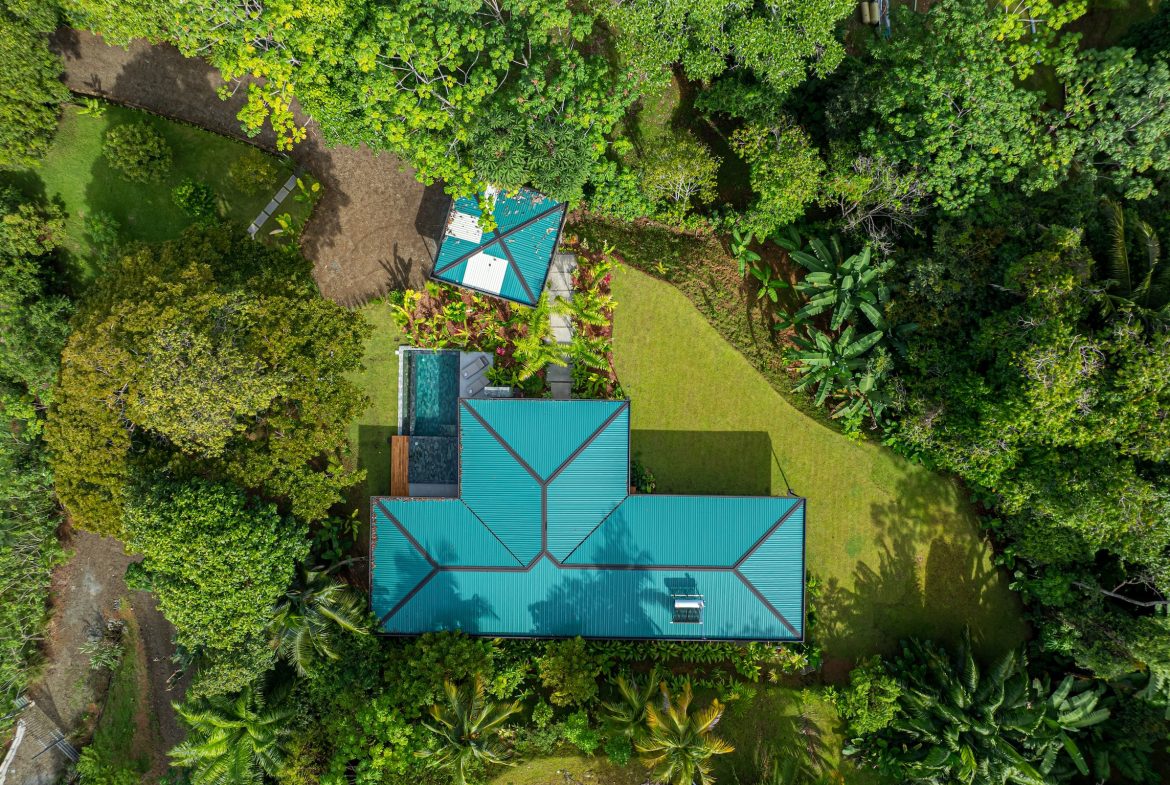 Un portón de teca con control remoto da la bienvenida a exuberantes jardines tropicales y árboles frutales que atraen aves, mariposas y fauna local cada día.