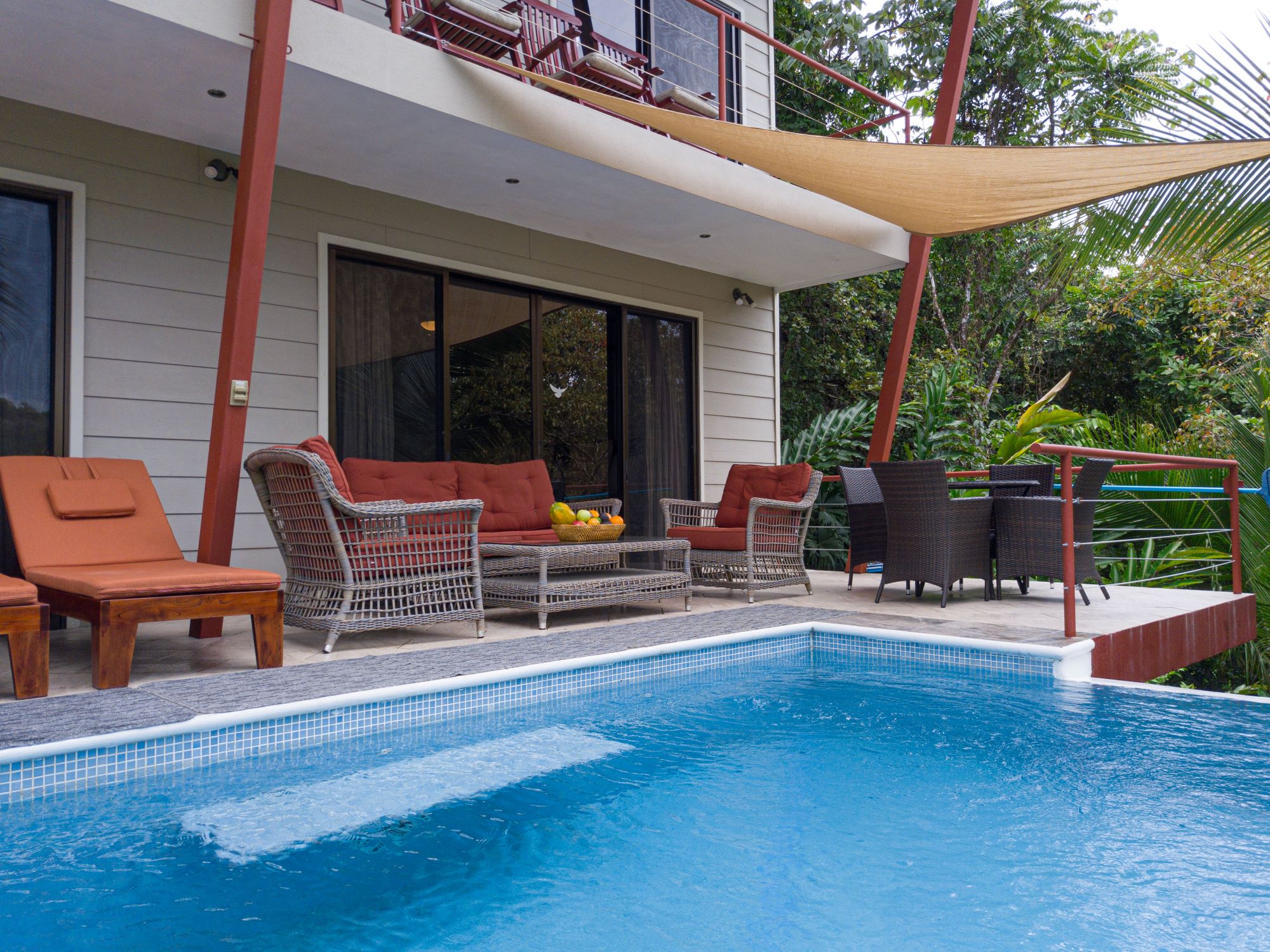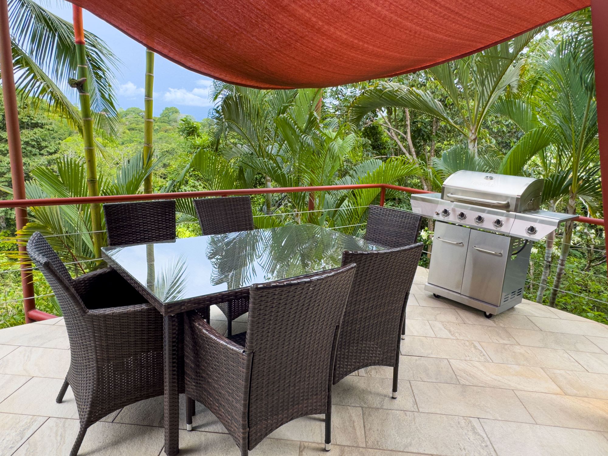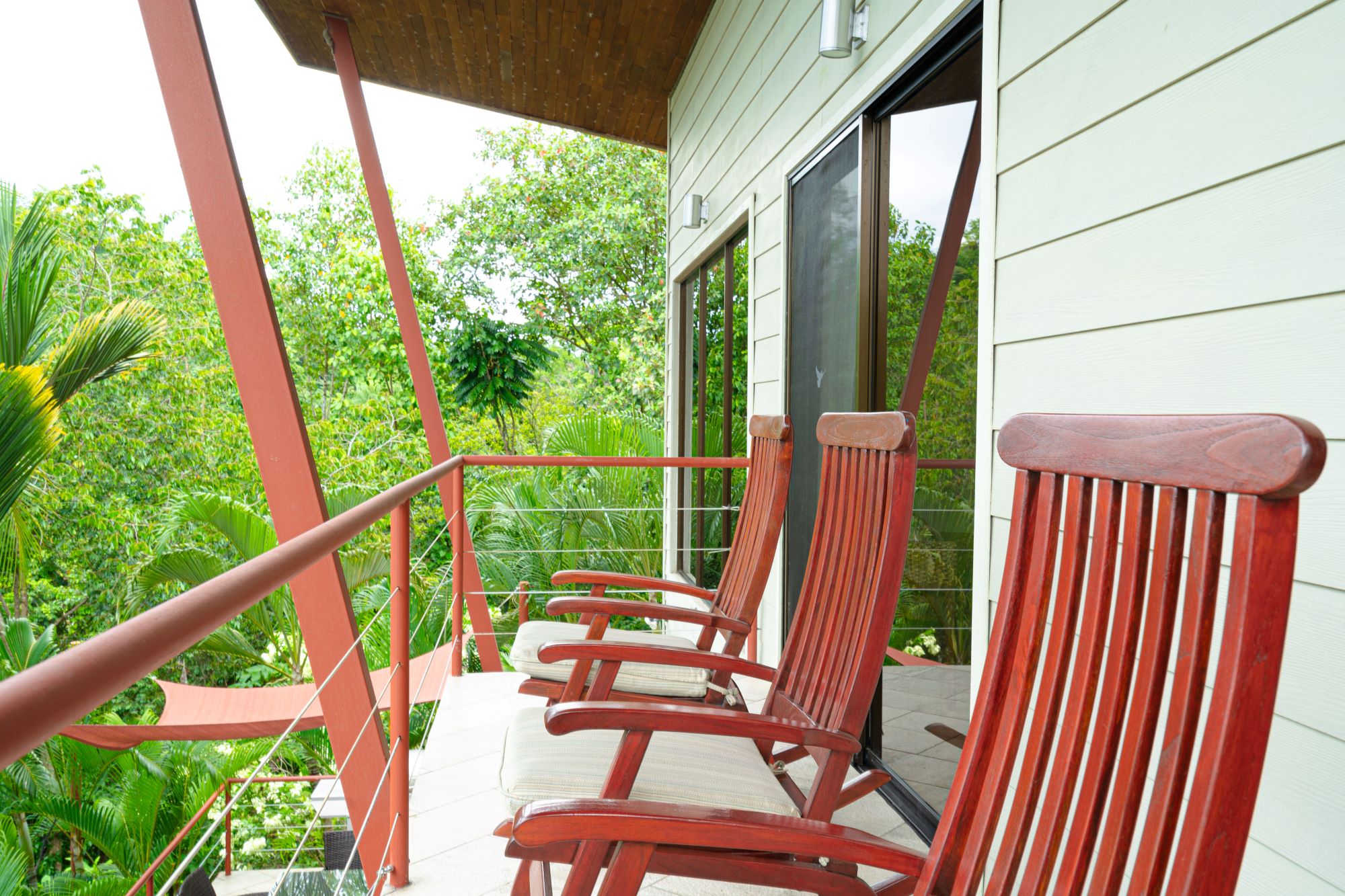 Desde la terraza del segundo piso, equipada con cómodas sillas, podrá admirar el paisaje verde y observar las frecuentes visitas de guacamayas escarlatas y monos titi, presentes en ambas plantas de la casa. -