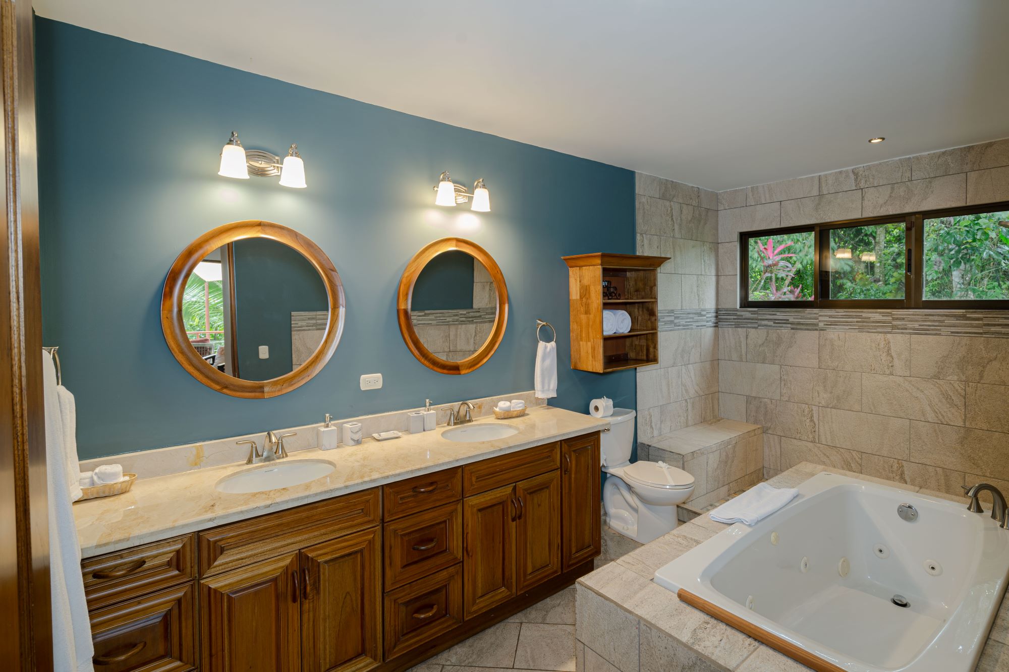 Ubicada en el nivel principal, la habitación principal cuenta con un baño privado equipado con una relajante bañera de hidromasaje, ofreciendo un oasis de descanso y privacidad. -
