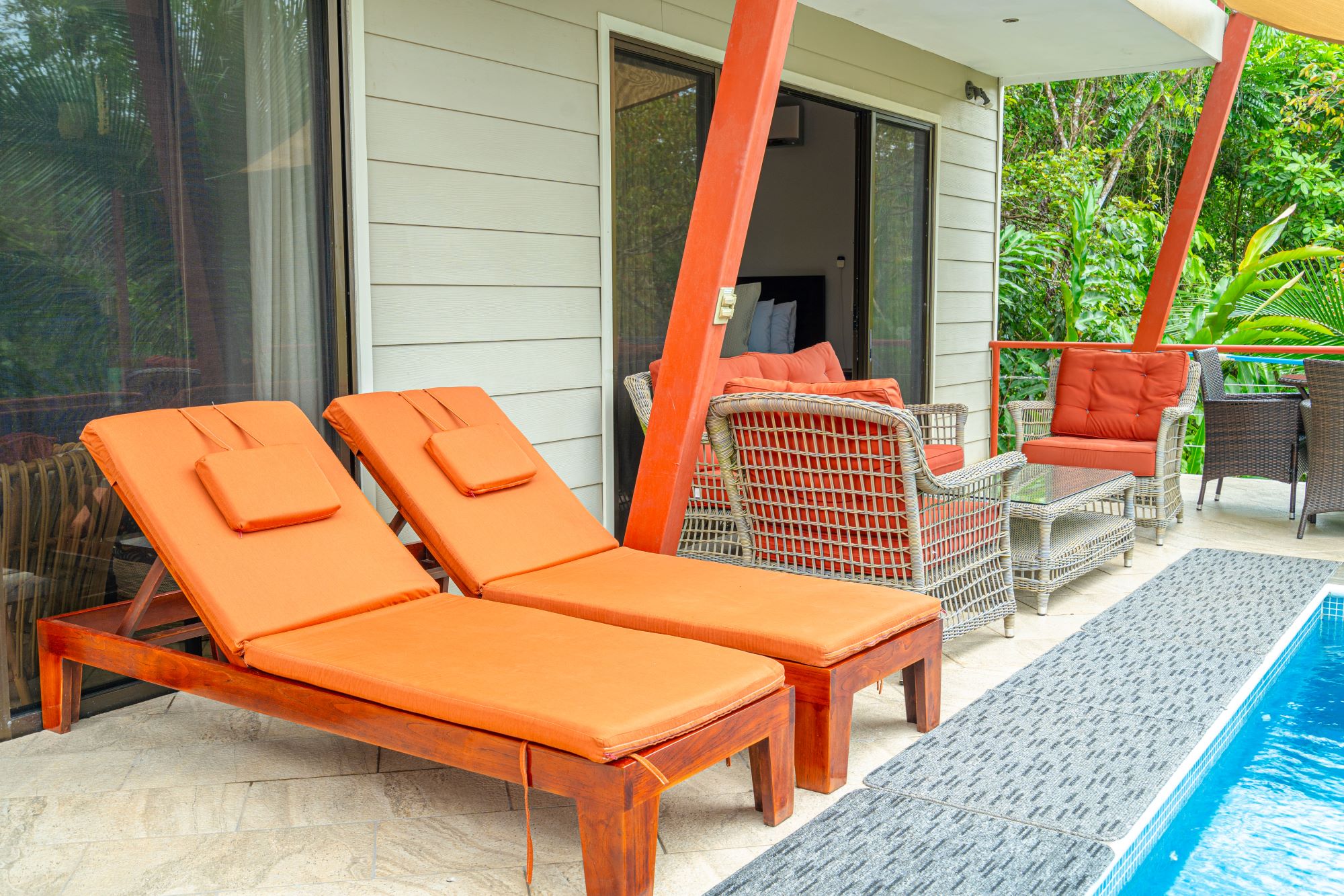 Disfrute de una acogedora zona social junto a la piscina, equipada con barbacoa, dos áreas de comedor y sillas reclinables para relajarse bajo el sol tropical. -