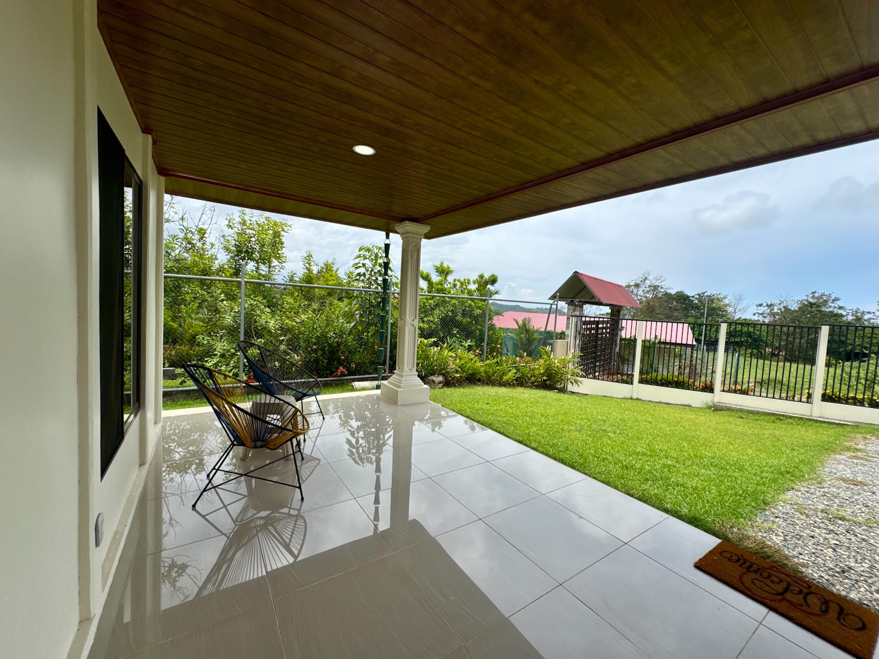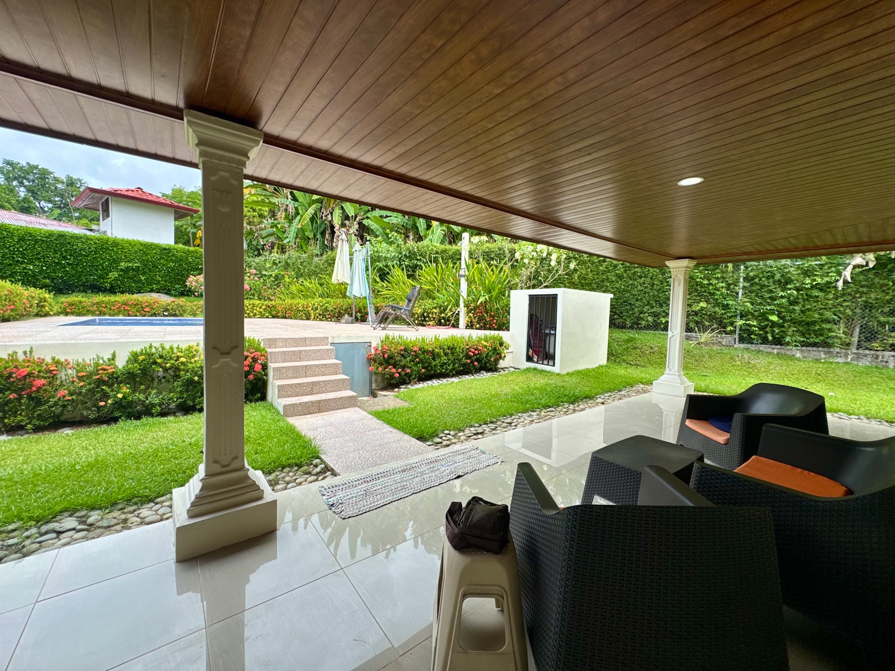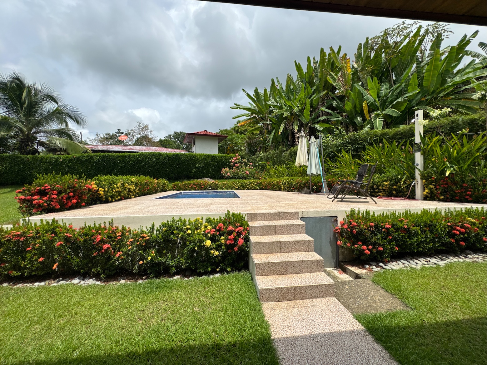 Uno de los espacios más atractivos de la casa es su gran terraza, ideal para disfrutar de cenas al aire libre, compartir con amigos o simplemente relajarse rodeado de un entorno tropical exuberante. La piscina, rodeada de vegetación y con vistas a las montañas, completa la atmósfera de serenidad que define esta propiedad.