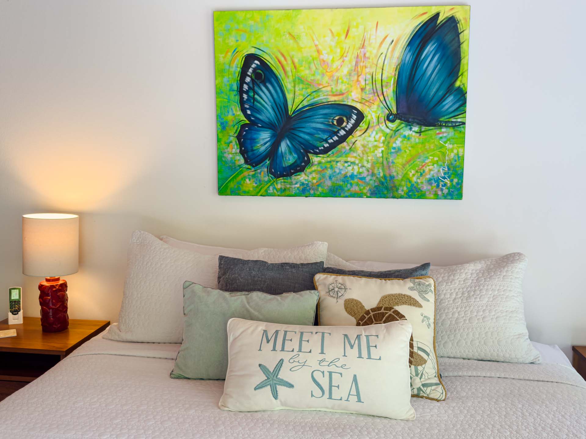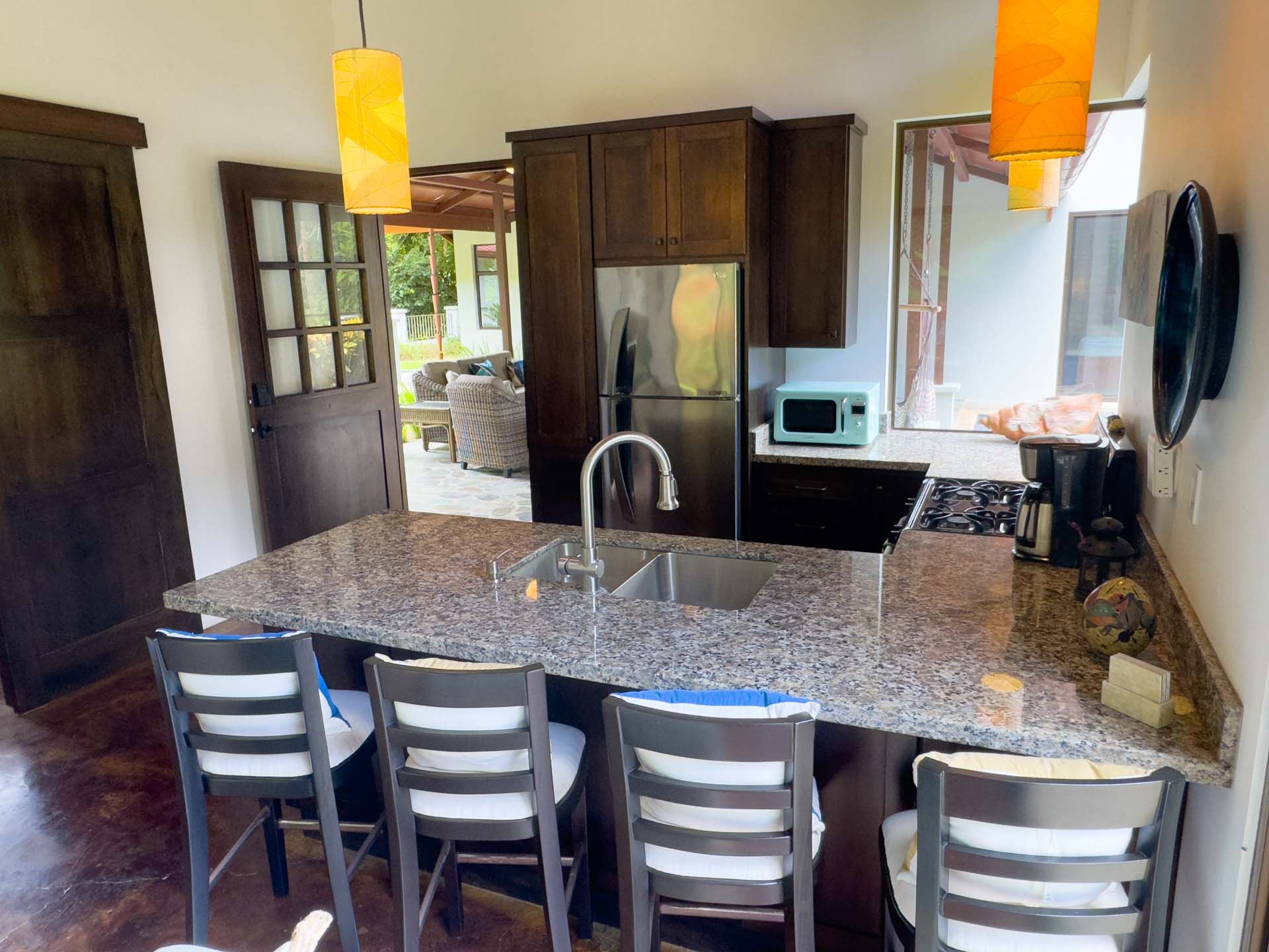 The decor is highlighted by its fine woods, custom lighting, vibrant local art, and river rock floors that run throughout the main house and hallways. -
