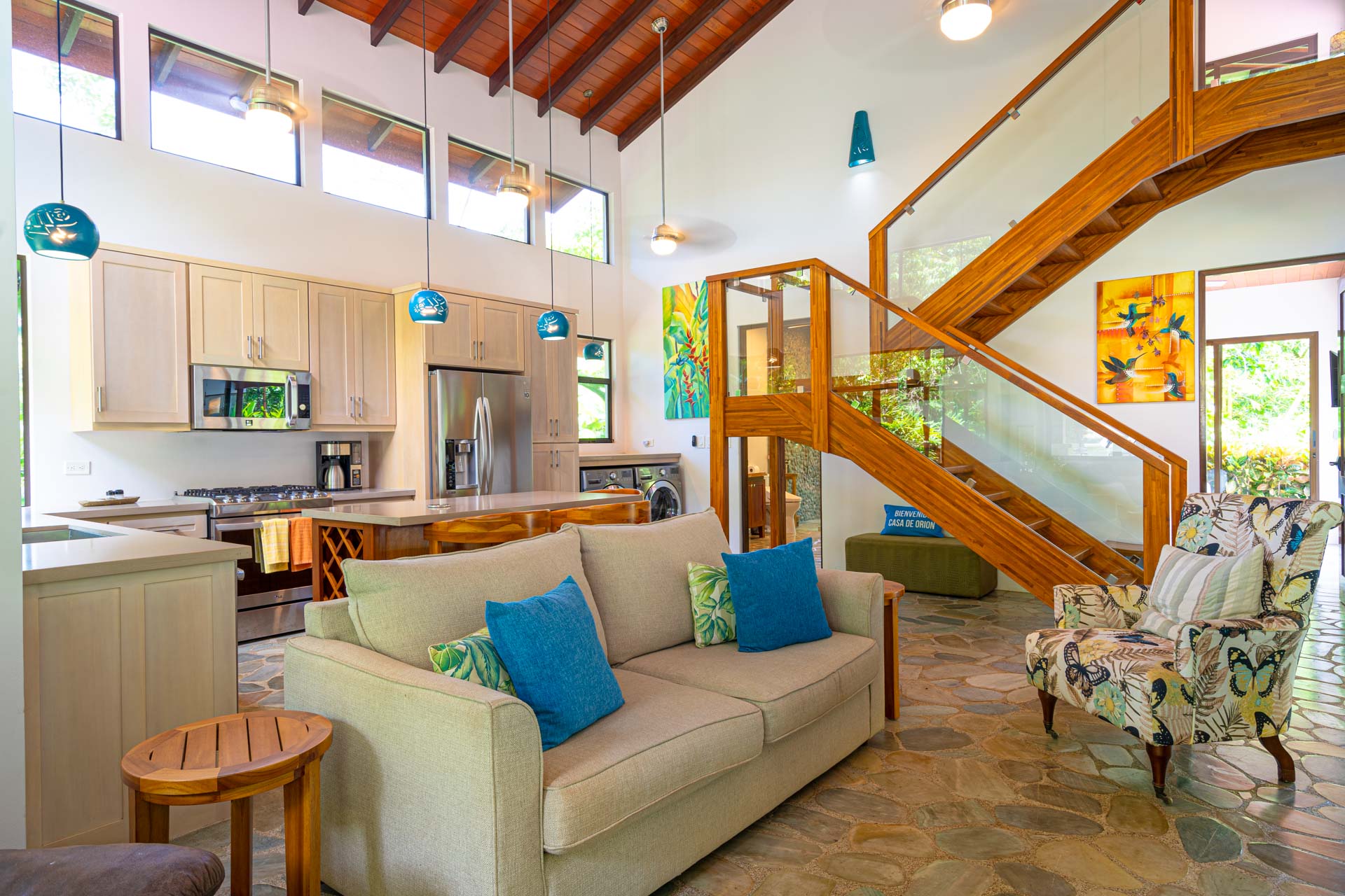 La decoración destaca por sus maderas nobles, iluminación personalizada, arte local vibrante y pisos de piedra de río que recorren toda la casa principal y los pasillos. -