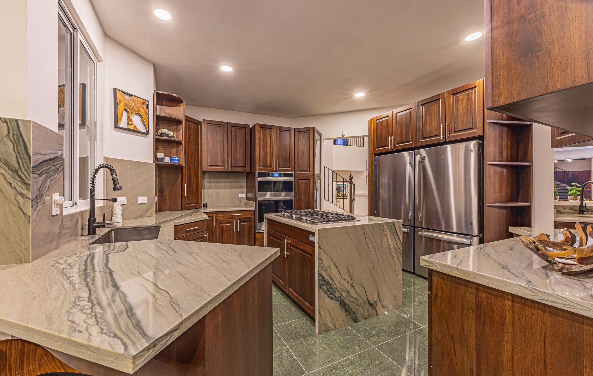 Una cocina completamente nueva, equipada para el chef más exigente, junto a un cómodo desayunador y un comedor formal.