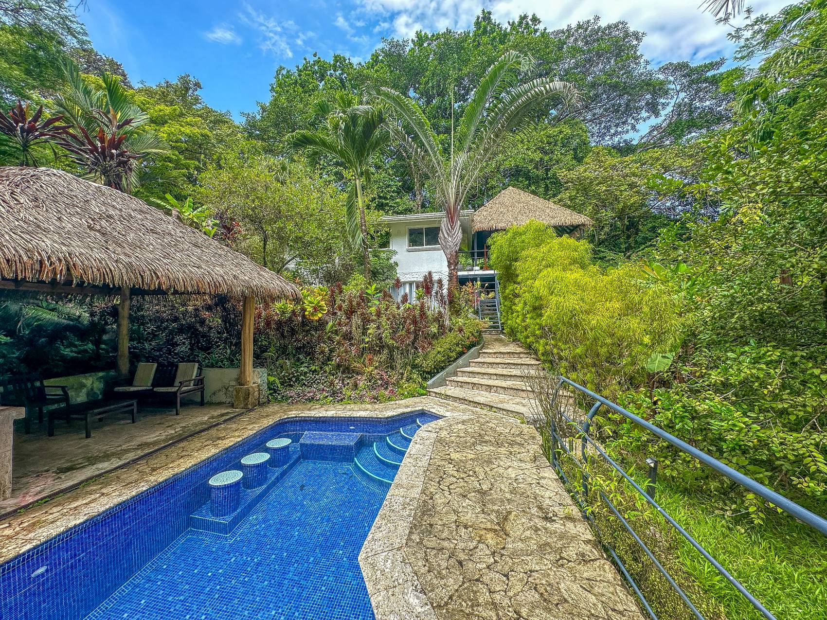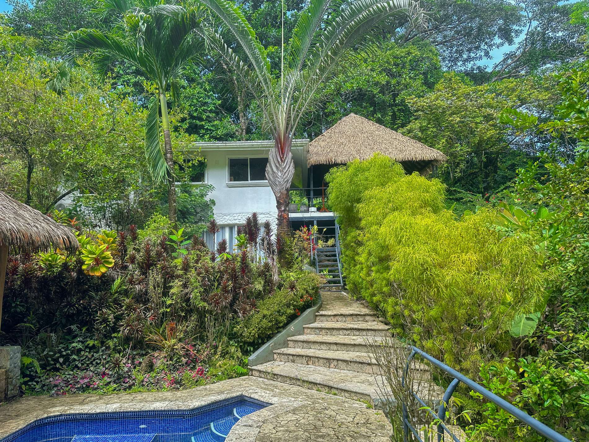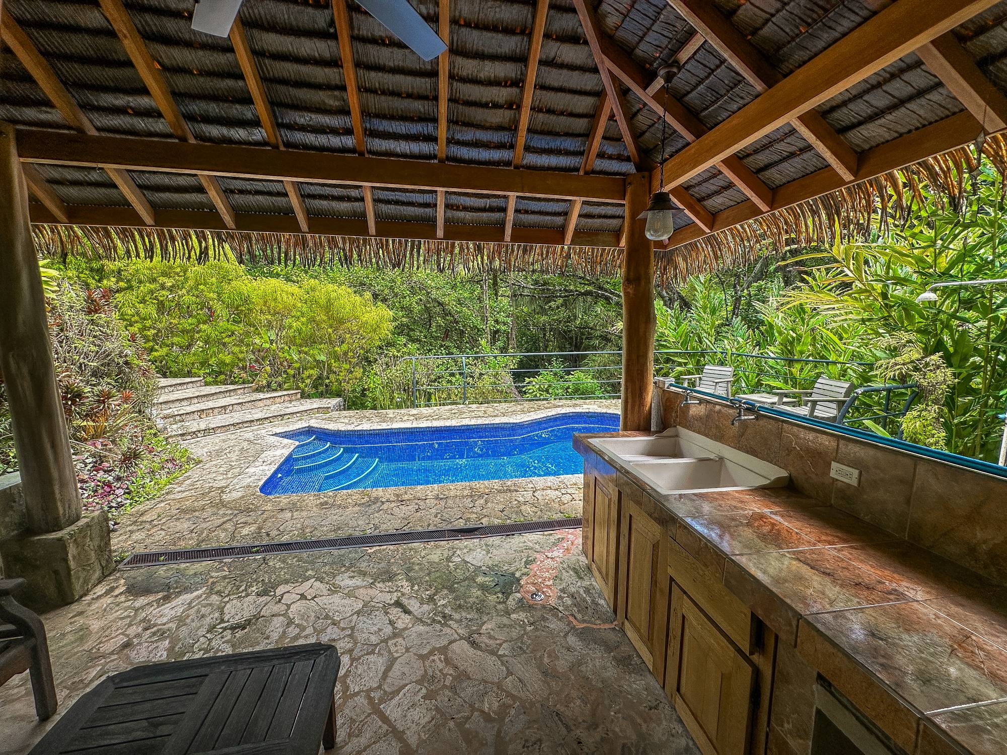 A spacious covered terrace runs along one side of the main house, offering unobstructed views of the surroundings: pristine rainforest, a crystal-clear mountain stream, a sun-drenched pool, a waterfront cabana, and two modern guesthouses that already generate an excellent income.