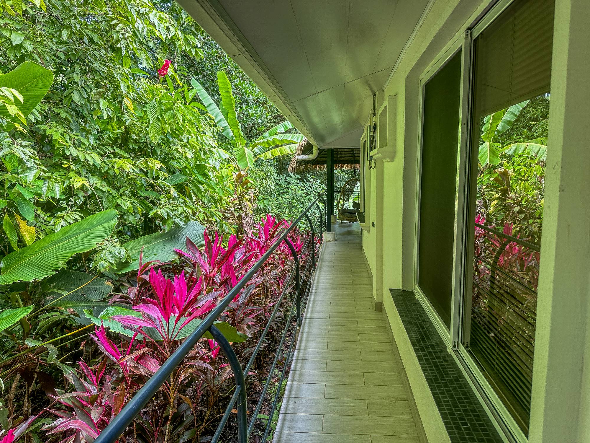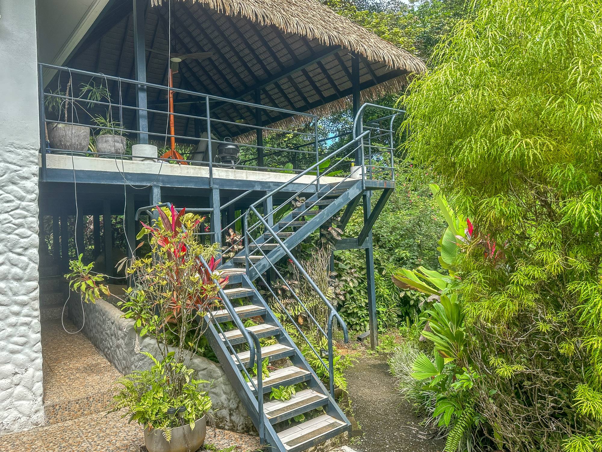 Al cruzar la elegante pasarela peatonal, se accede a una terraza techada que rodea gran parte de la casa principal. En el extremo opuesto, un espacioso rancho con techo de palma ofrece el lugar perfecto para el descanso, equipado con ventilador de techo, mesa de centro, cómodos asientos y dos hamacas colgantes. Desde aquí, se disfrutan vistas verdes en todas las direcciones, rodeadas completamente por naturaleza.