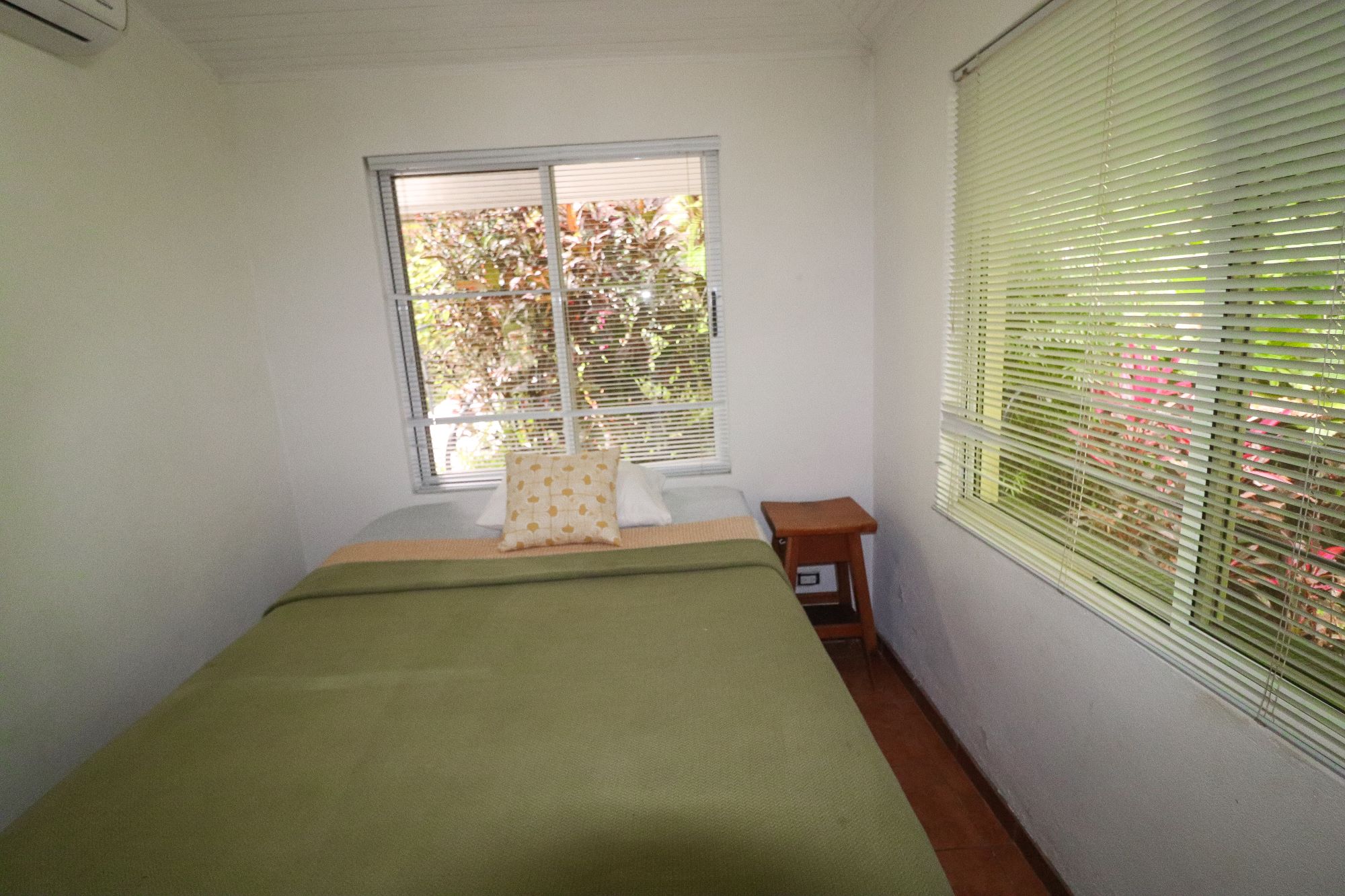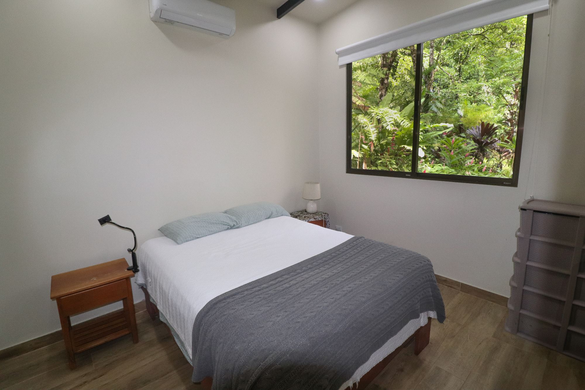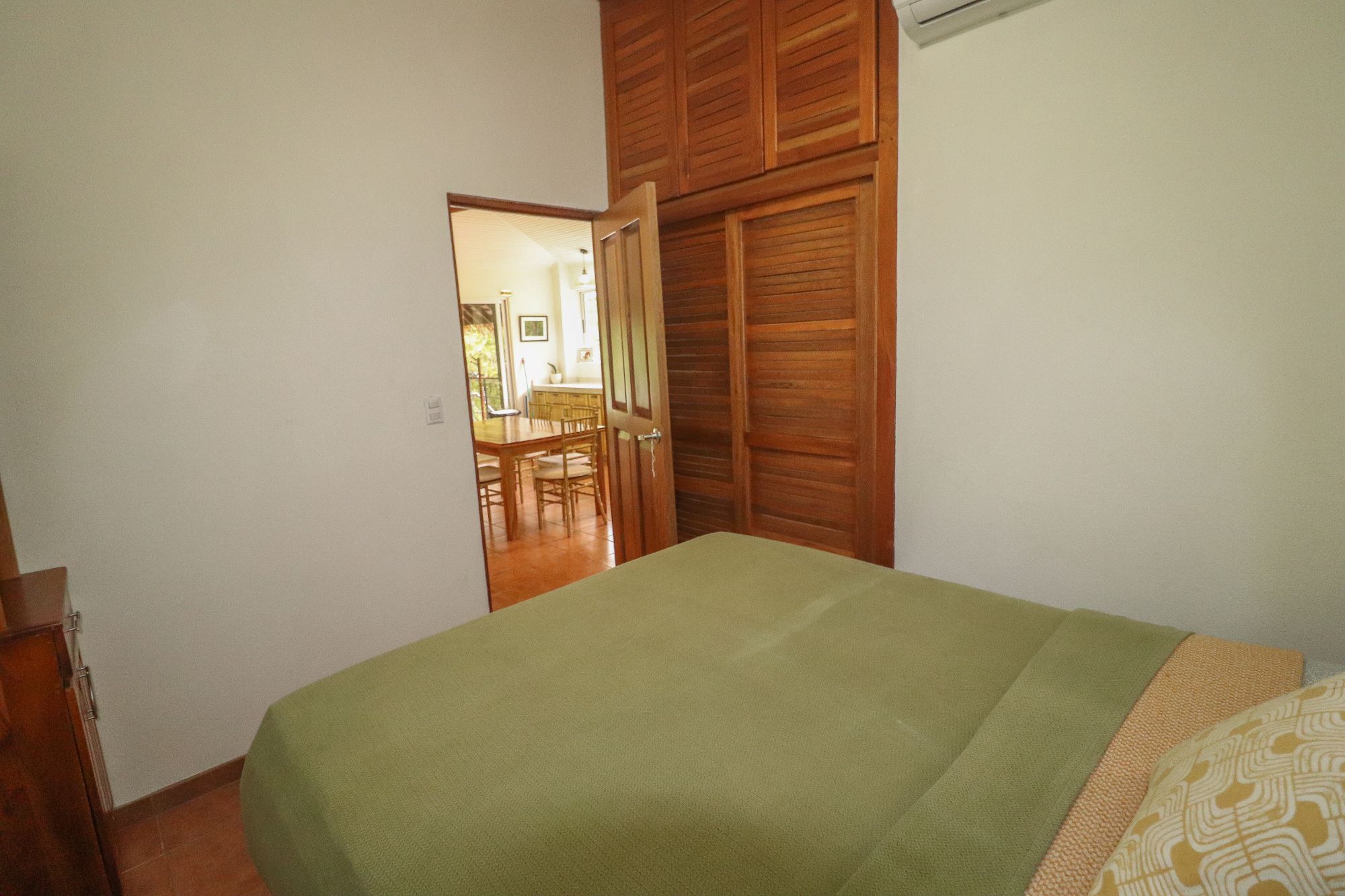 The upper floor offers two comfortable bedrooms, with large windows framing the natural landscape and plenty of storage space. Downstairs, the master bedroom suite opens through sliding doors to a path leading directly to the pool. The entire house is air-conditioned.