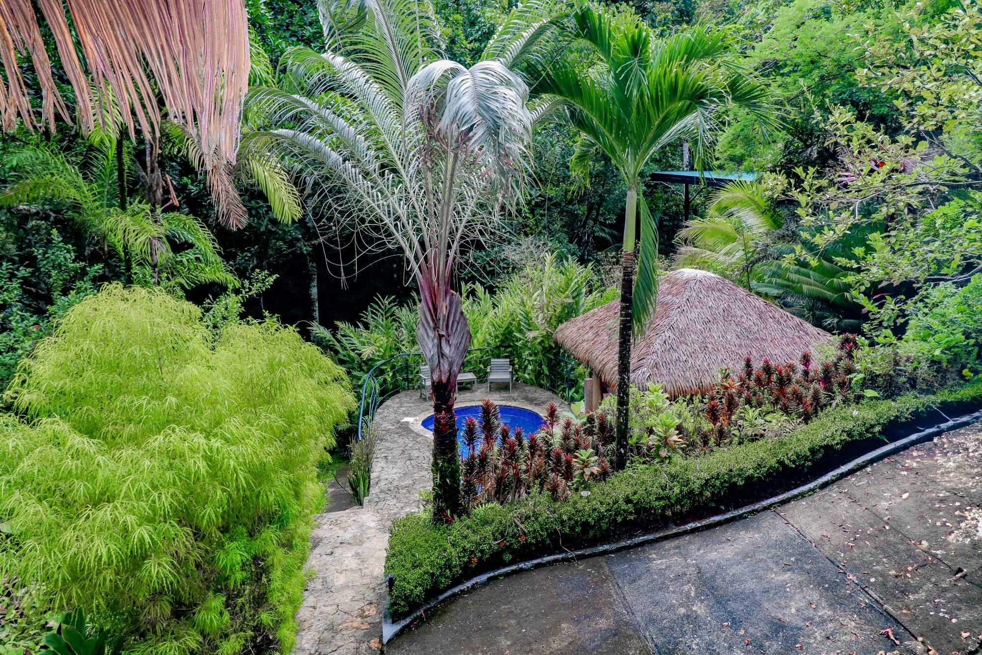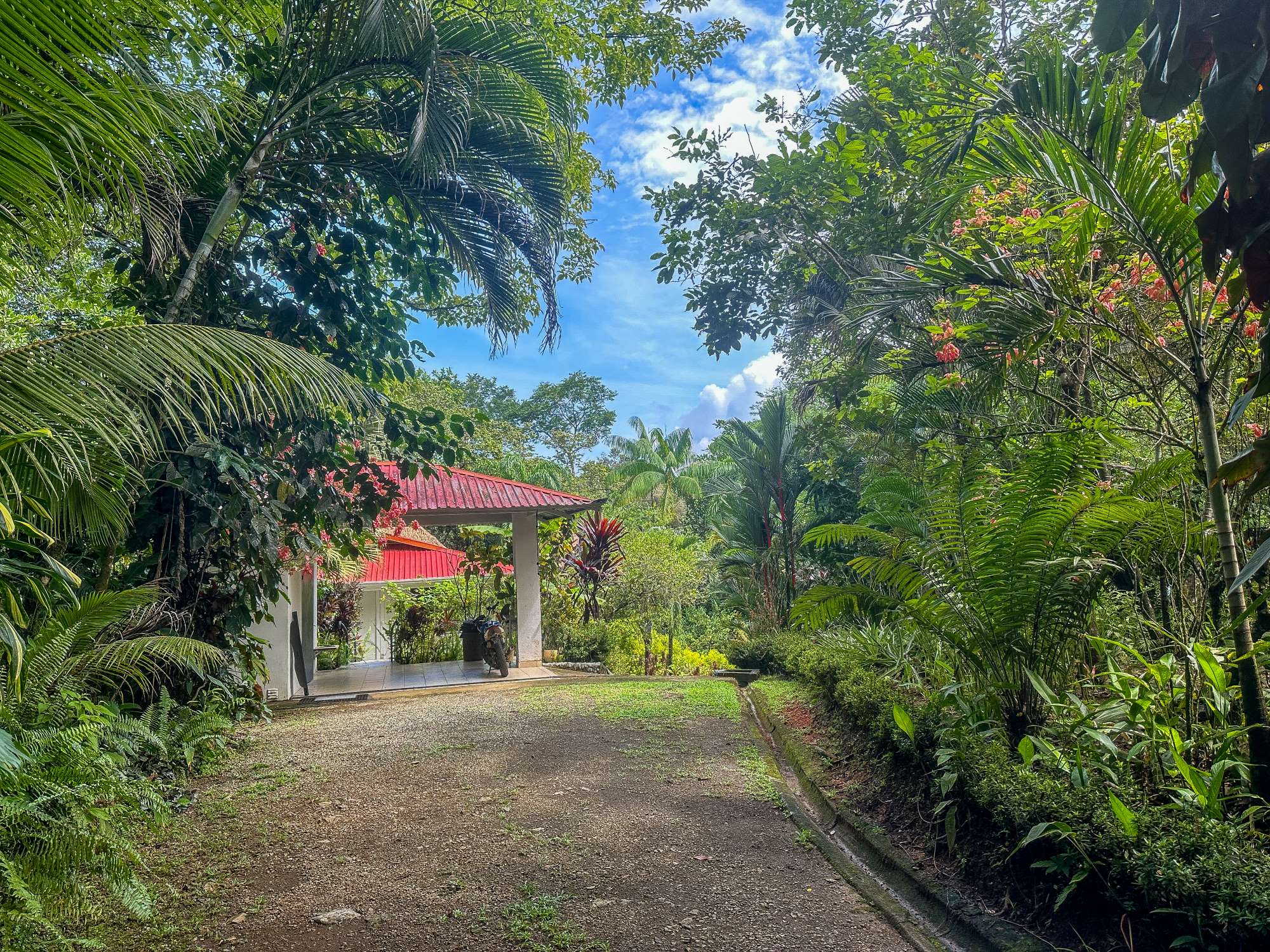 The property is protected by an electric gate that opens onto a private driveway lined with landscaped gardens and exotic plants. The driveway winds through the vegetation to reach the main residence, offering a visually stunning and serene drive.