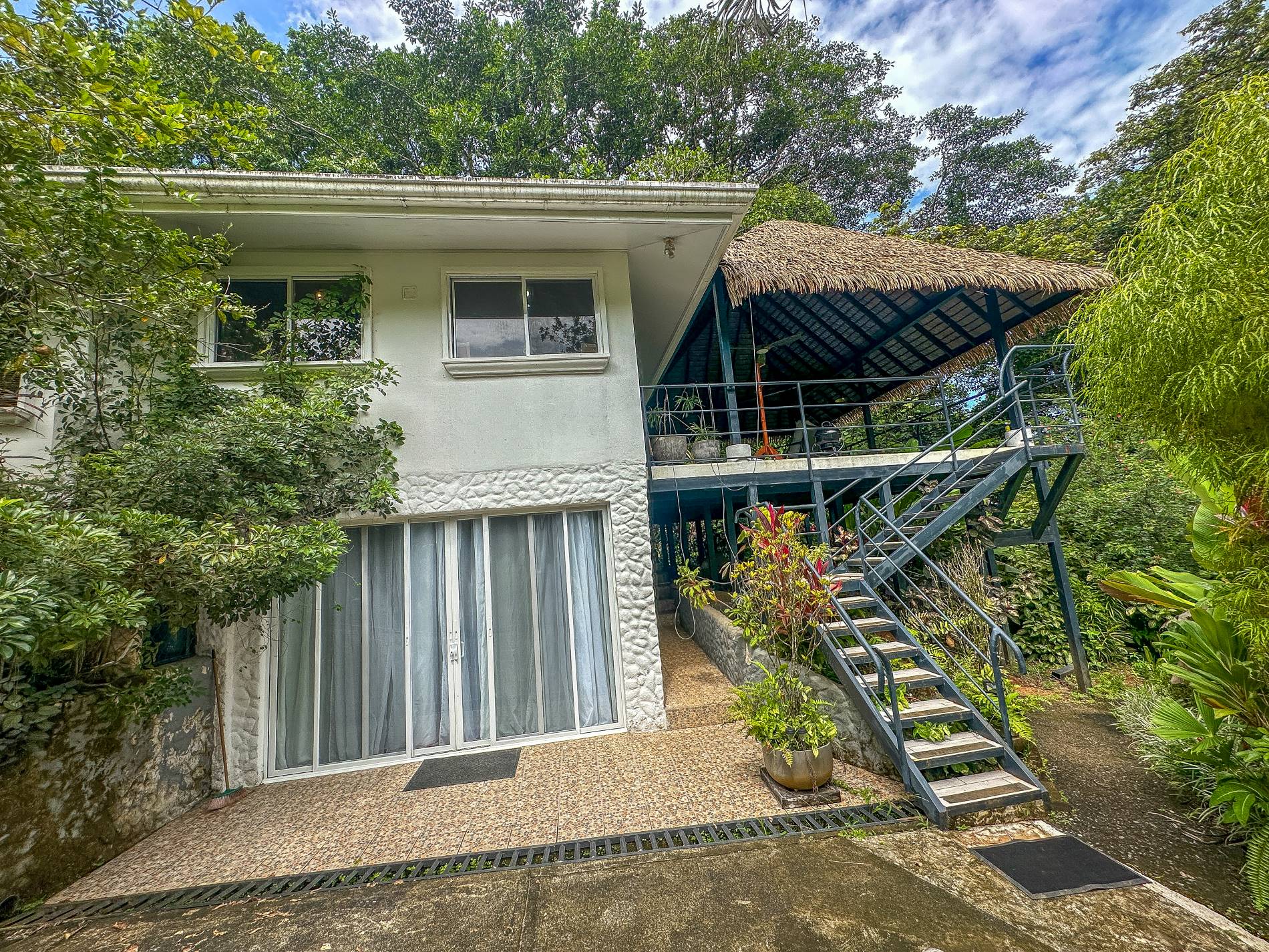 Upon arriving at this majestic property, you’ll park comfortably in the covered carport before crossing a charming arched walkway flanked by lush vegetation. This unique entrance leads to your elevated home, completely immersed in the jungle, where nature becomes the daily backdrop for your life.