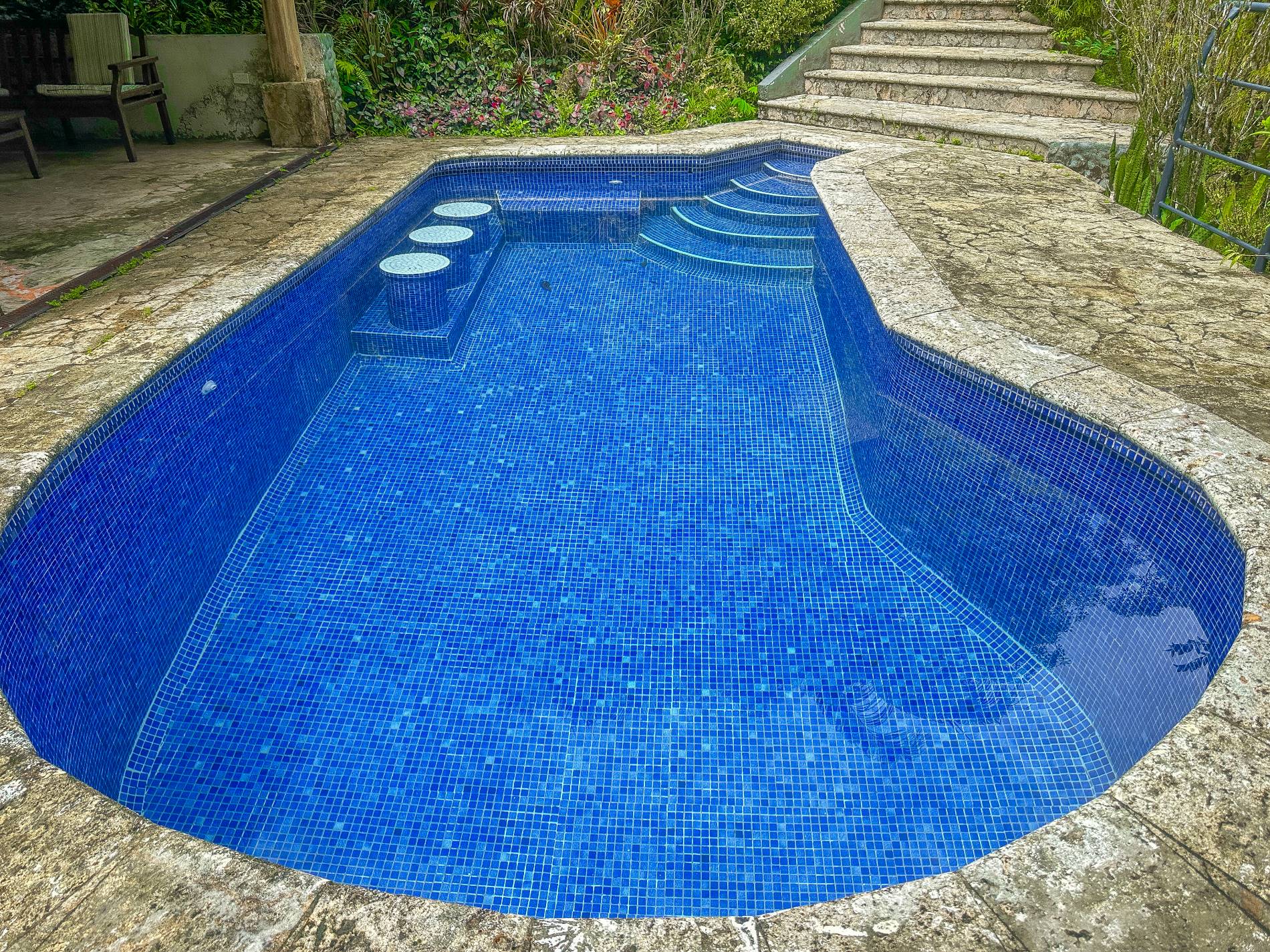 Tres asientos sumergidos dentro de la piscina invitan a disfrutar cómodamente de cócteles mientras se contempla la naturaleza circundante. Desde este punto elevado, se aprecian las copas de los árboles a nivel visual, creando una experiencia sensorial única.