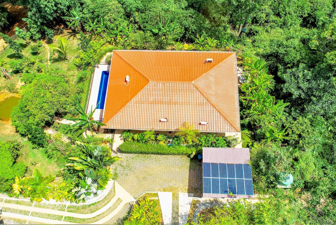 Situada a unos 220 metros sobre el nivel del mar, la propiedad disfruta de un clima más fresco y agradables brisas marinas y de montaña. La casa cuenta con amplios patios cubiertos, una piscina con vistas panorámicas al océano y las montañas, terrazas ideales para el descanso y espacios diseñados para disfrutar del entorno selvático.