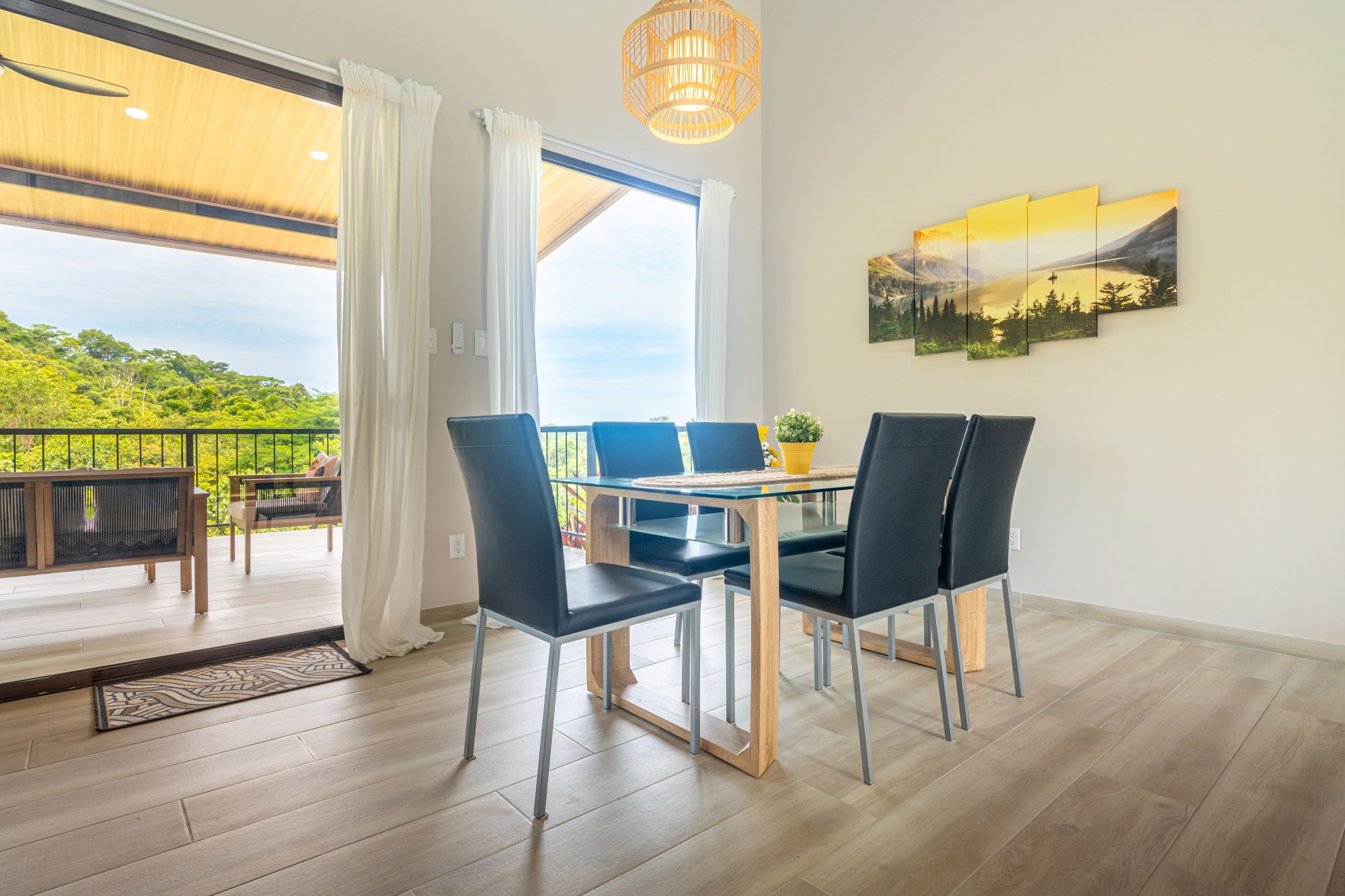 The living and dining rooms are filled with natural light, with sliding glass doors that open onto the terrace and nature.