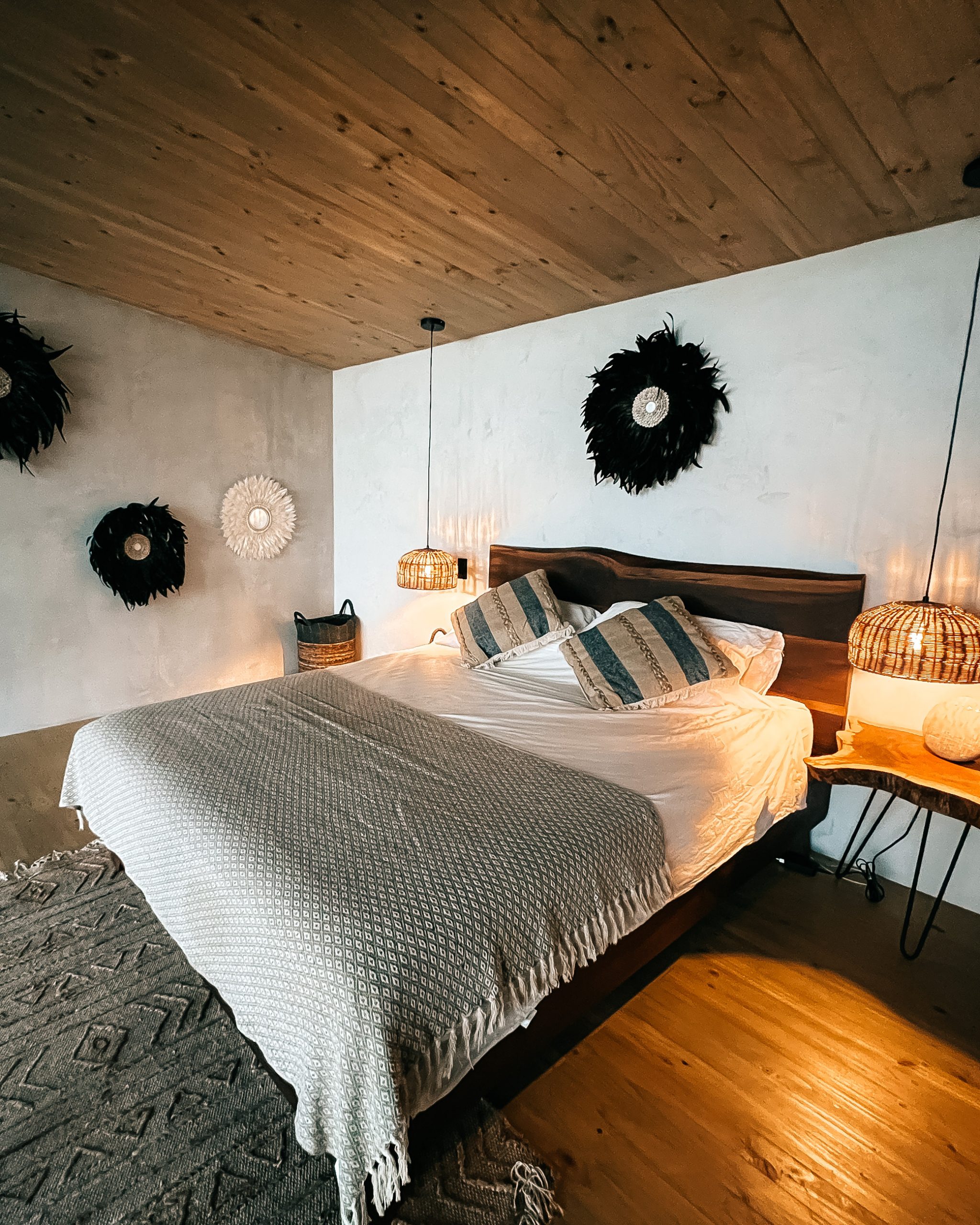 Loft-style bedroom with queen bed and memory foam mattress, facing the ocean