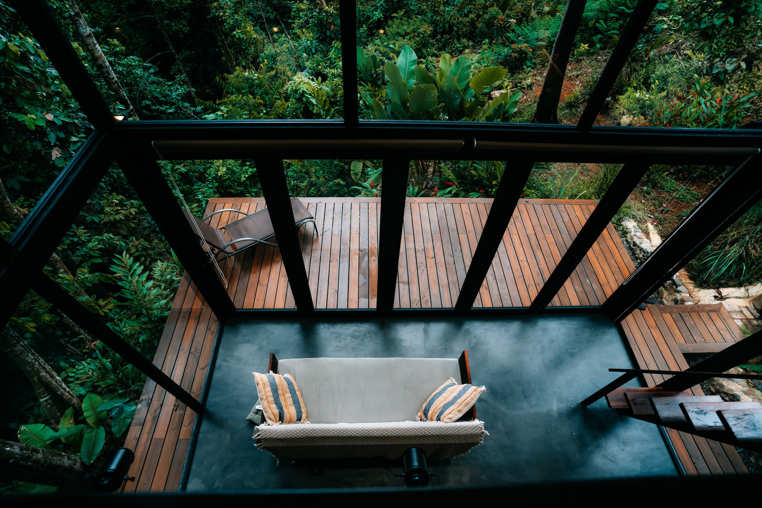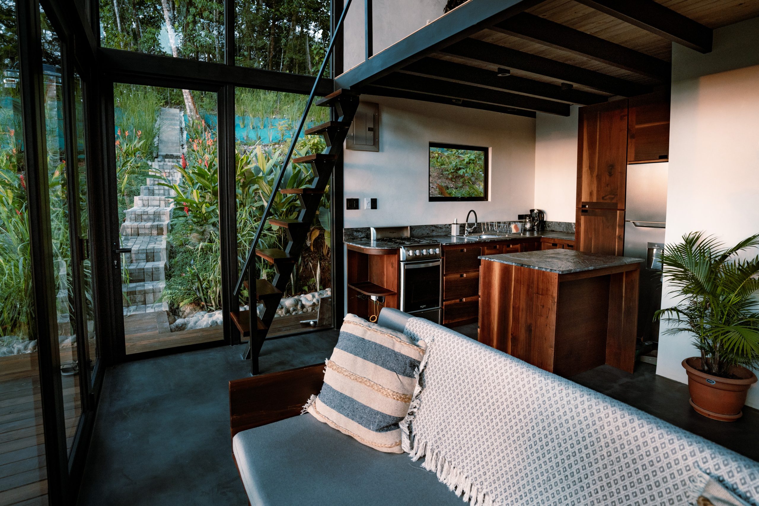Floor-to-ceiling glass doors that integrate the interior with the jungle and the sea breeze