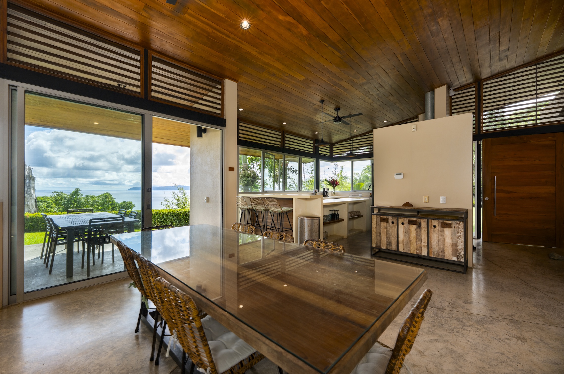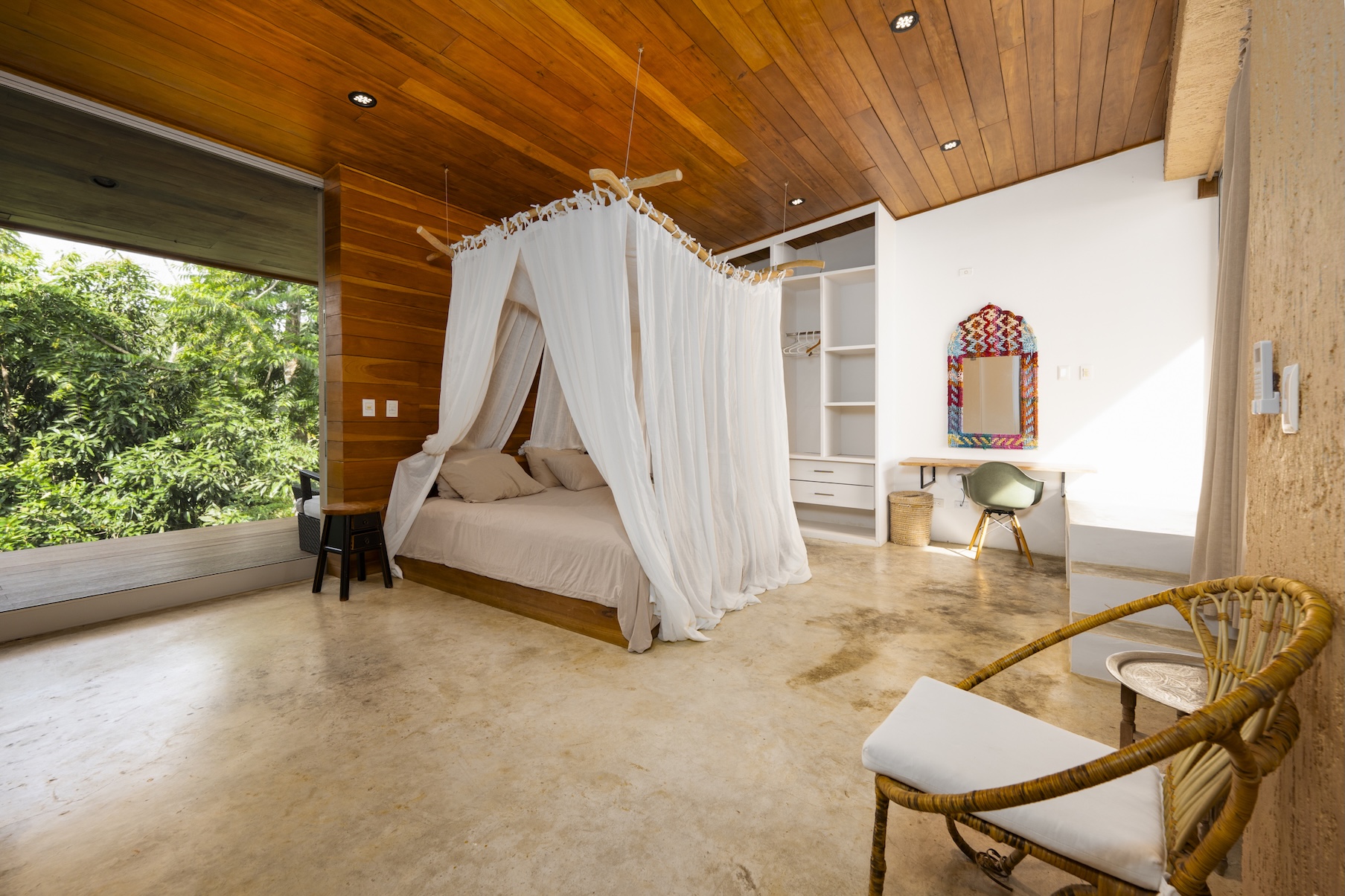 En el interior, la casa combina materiales naturales con un diseño moderno y minimalista. La madera local, la arquitectura abierta y los acabados contemporáneos crean un ambiente elegante y acogedor. Cada habitación garantiza privacidad y confort, con grandes ventanales que enmarcan vistas al océano y la exuberante vegetación de la selva.