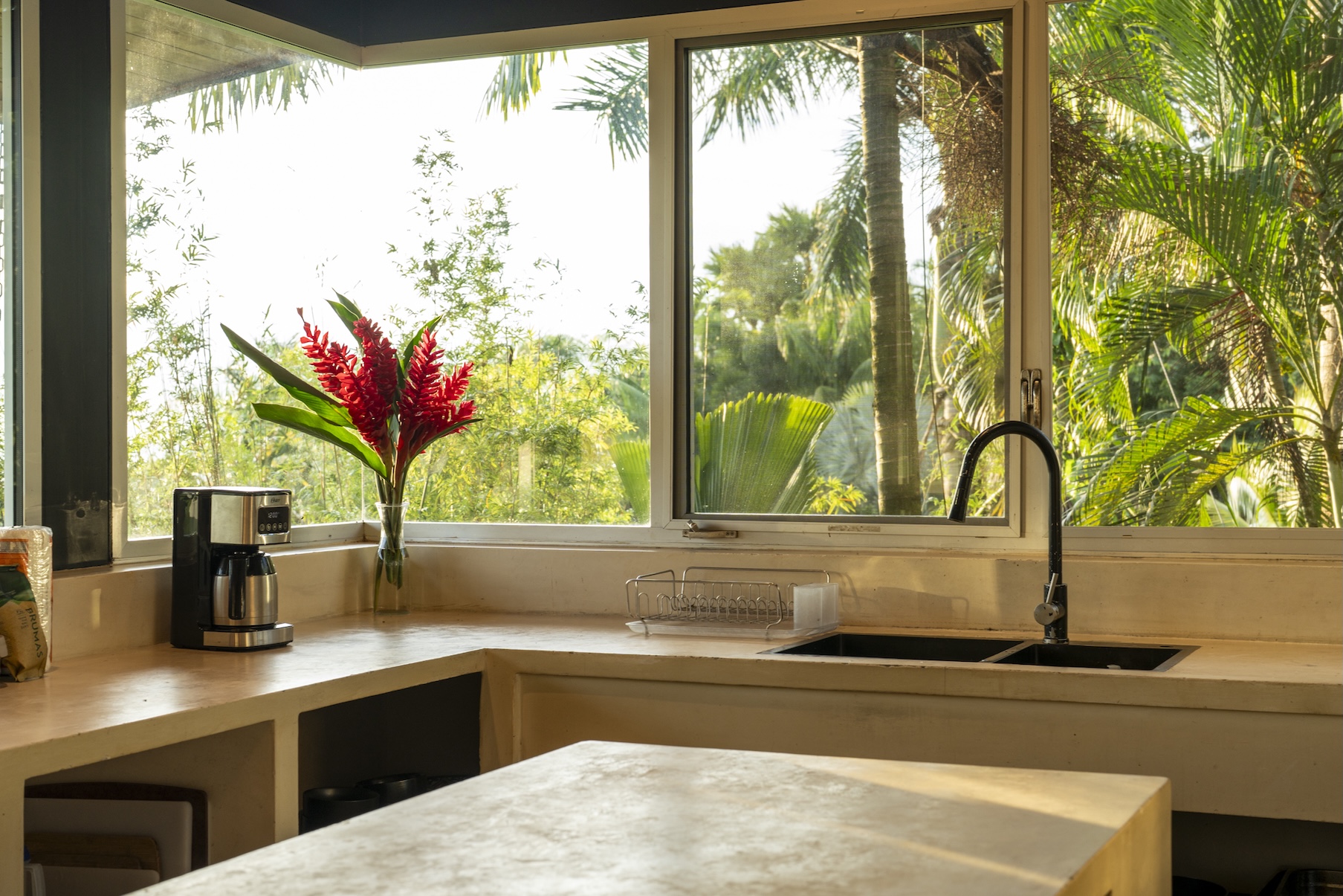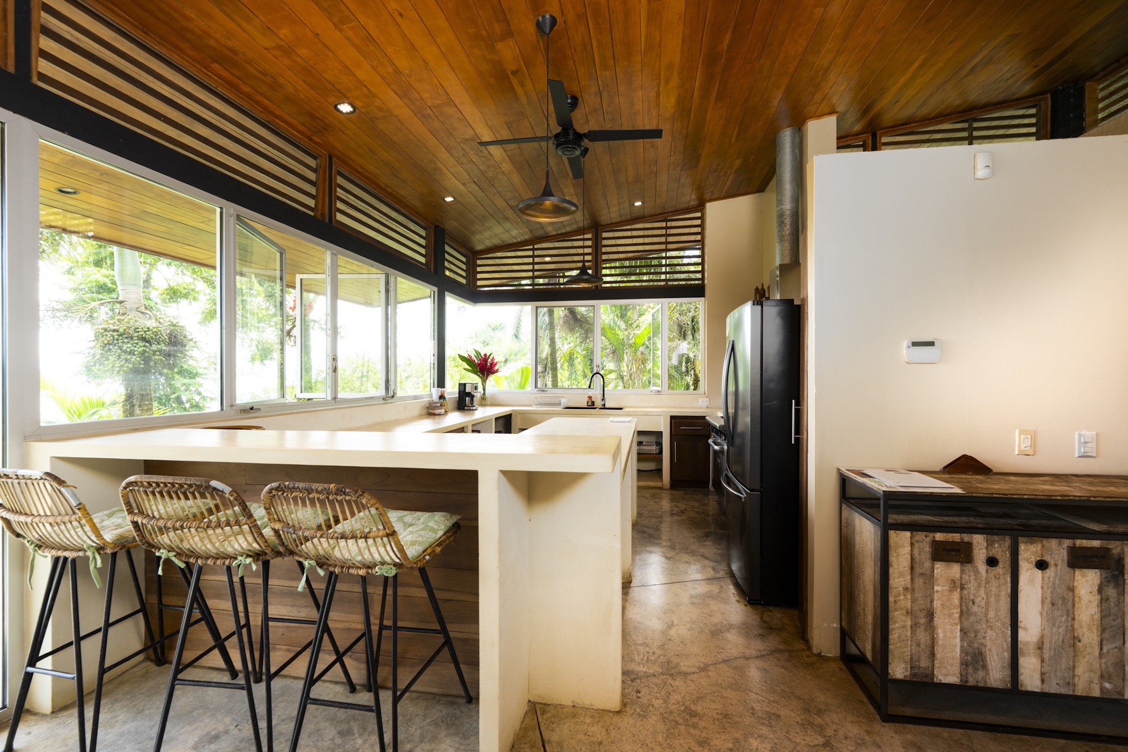 Inside, the house blends natural materials with a modern, minimalist design. Local wood, open architecture, and contemporary finishes create an elegant and inviting atmosphere. Each room offers privacy and comfort, with large windows framing views of the ocean and the lush jungle vegetation.