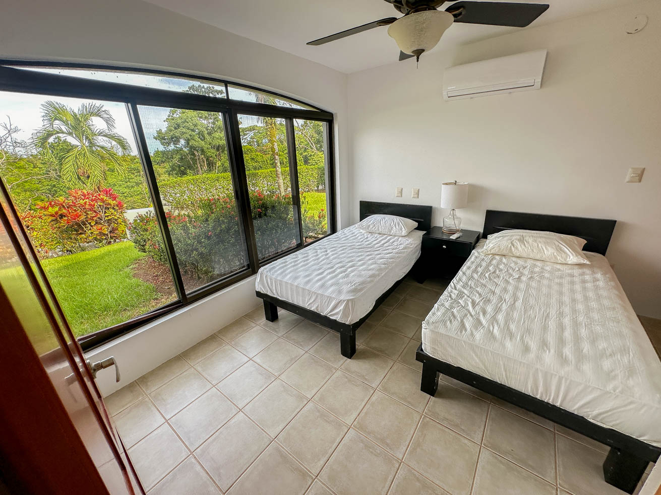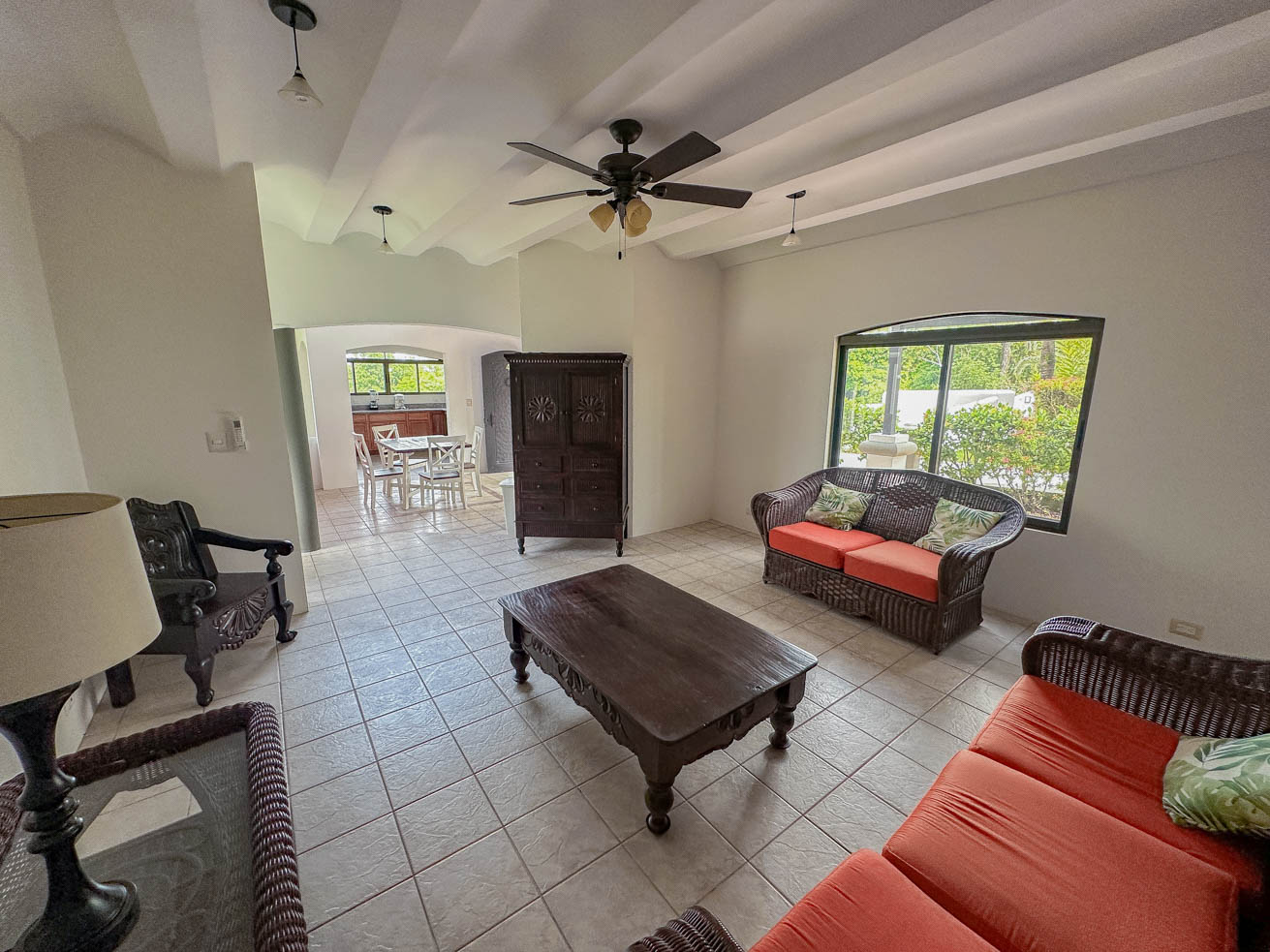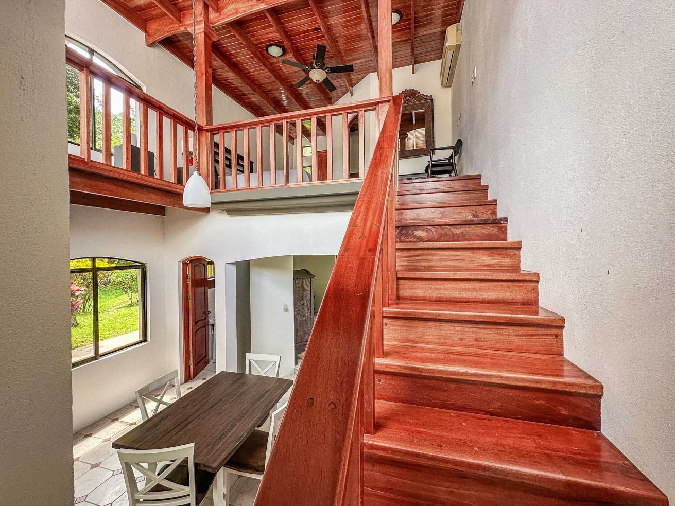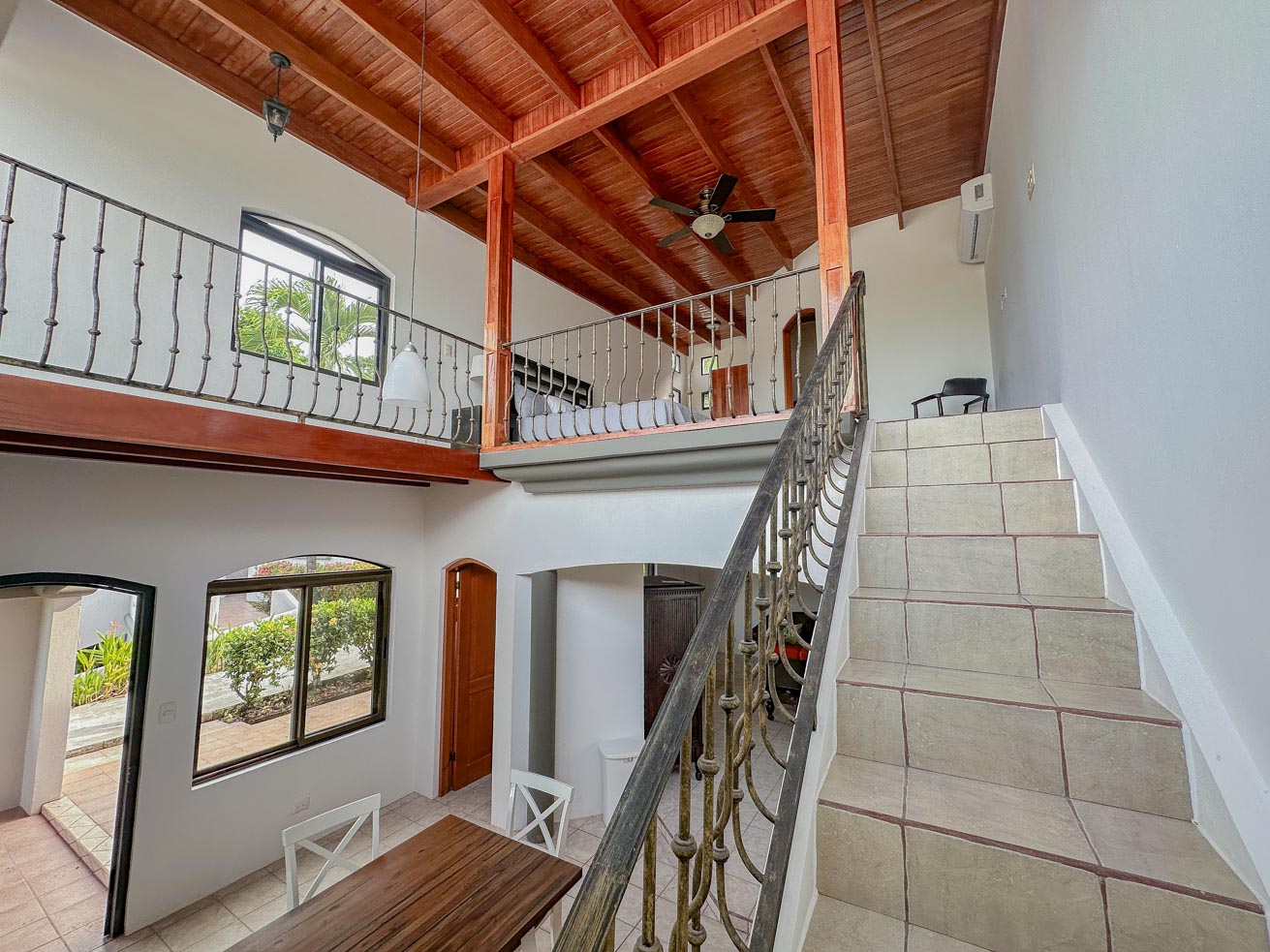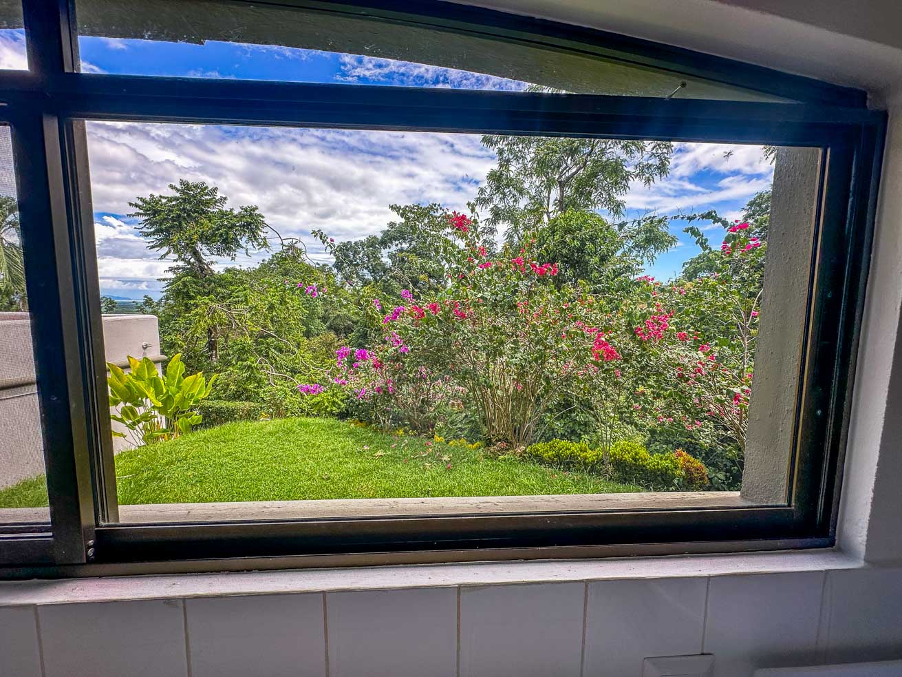 El interior combina paredes blancas, azulejos brillantes y detalles en madera que crean un ambiente cálido, elegante y acogedor. Las ventanas enmarcan vistas a la selva y los jardines, y el aire acondicionado en toda la casa asegura confort en todo momento.