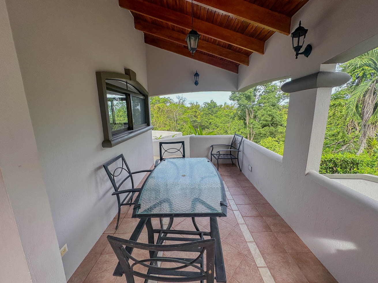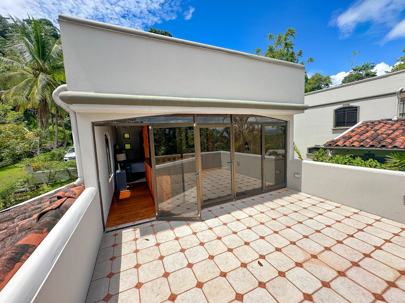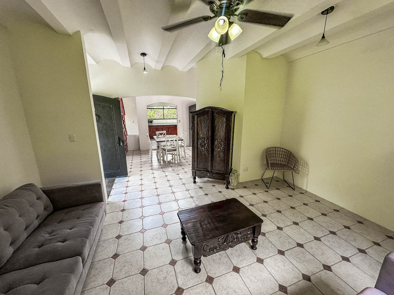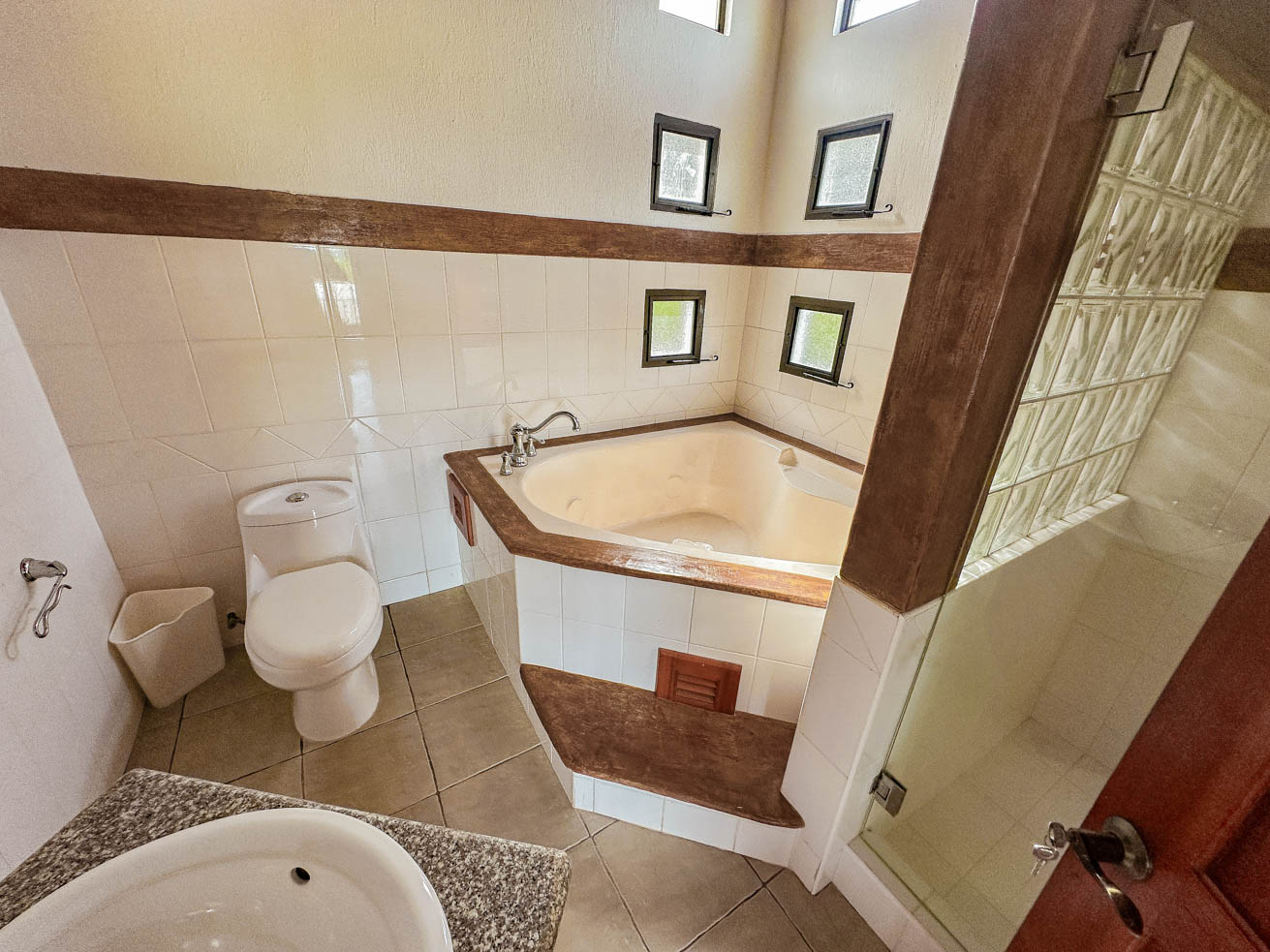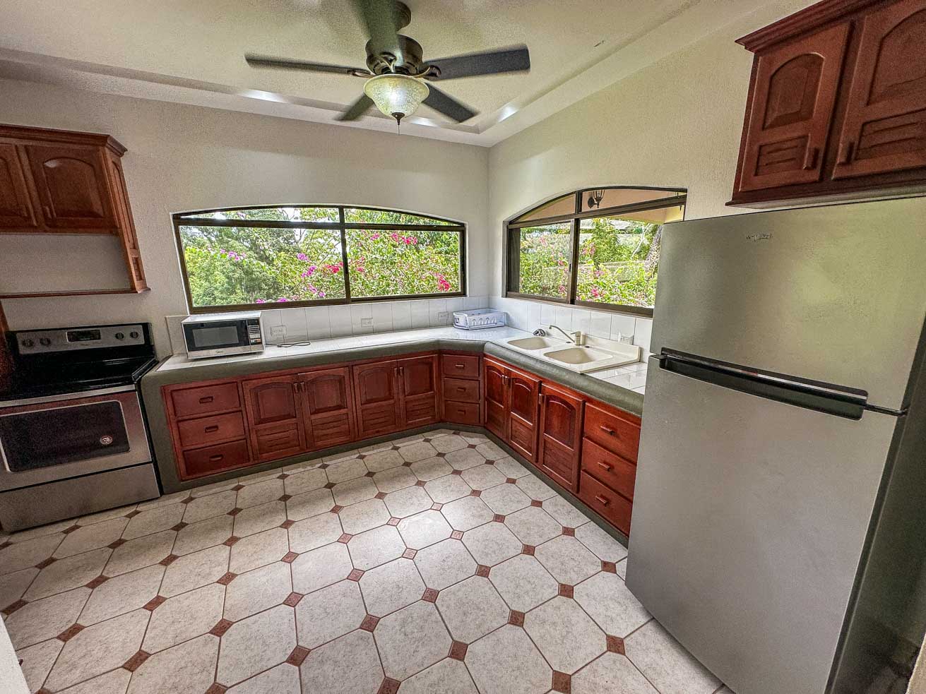 El interior combina paredes blancas, azulejos brillantes y detalles en madera que crean un ambiente cálido, elegante y acogedor. Las ventanas enmarcan vistas a la selva y los jardines, y el aire acondicionado en toda la casa asegura confort en todo momento.