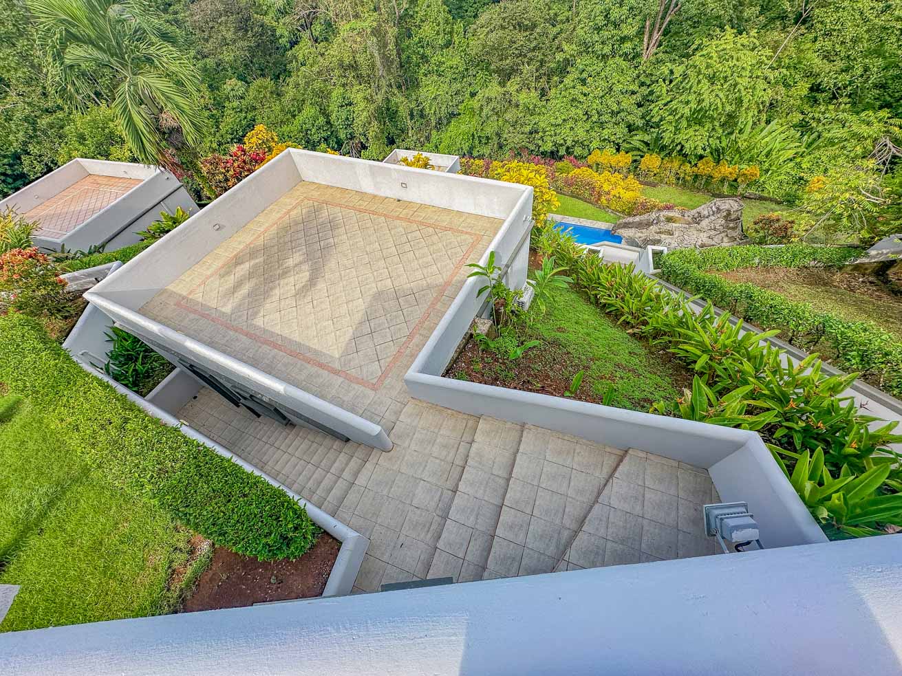The larger villas include a guesthouse connected by a private path surrounded by vegetation. This path divides: one part leads to the spectacular rooftop terrace, and the other leads down to the main entrance.
