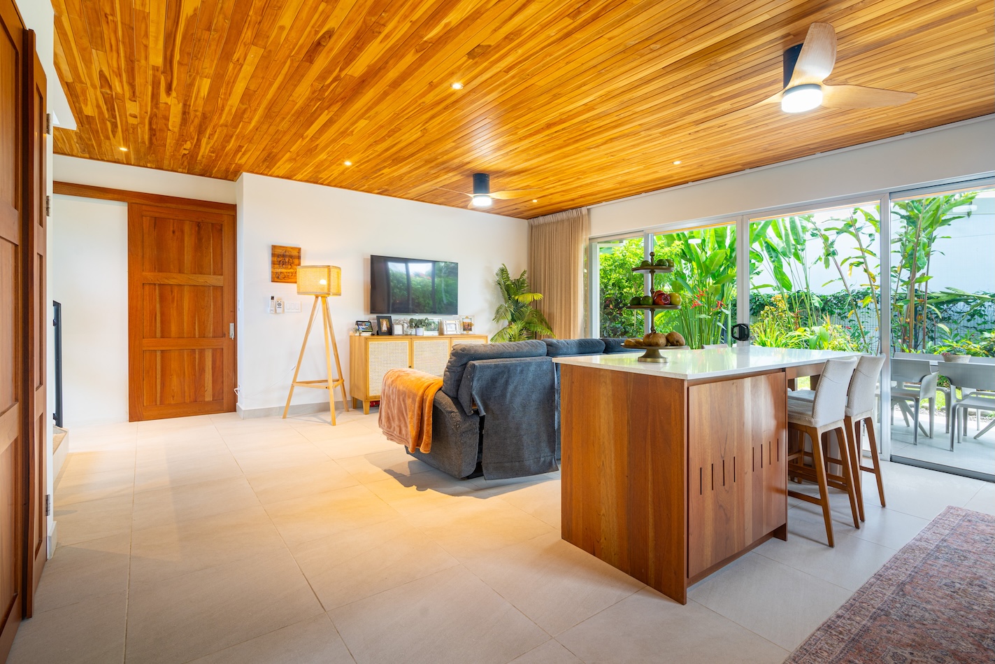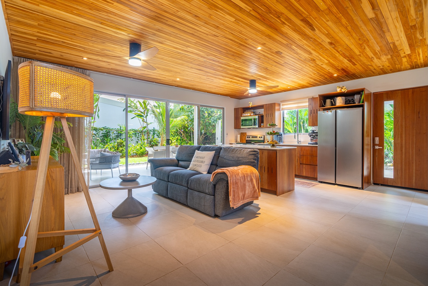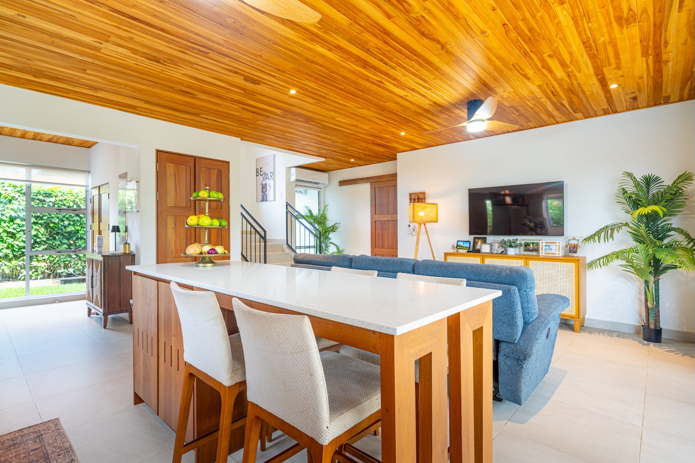 La cocina y sala de estar se integran perfectamente para momentos de relajación o entretenimiento, con aire acondicionado y ventiladores de techo distribuidos en toda la casa para garantizar confort durante todo el año.