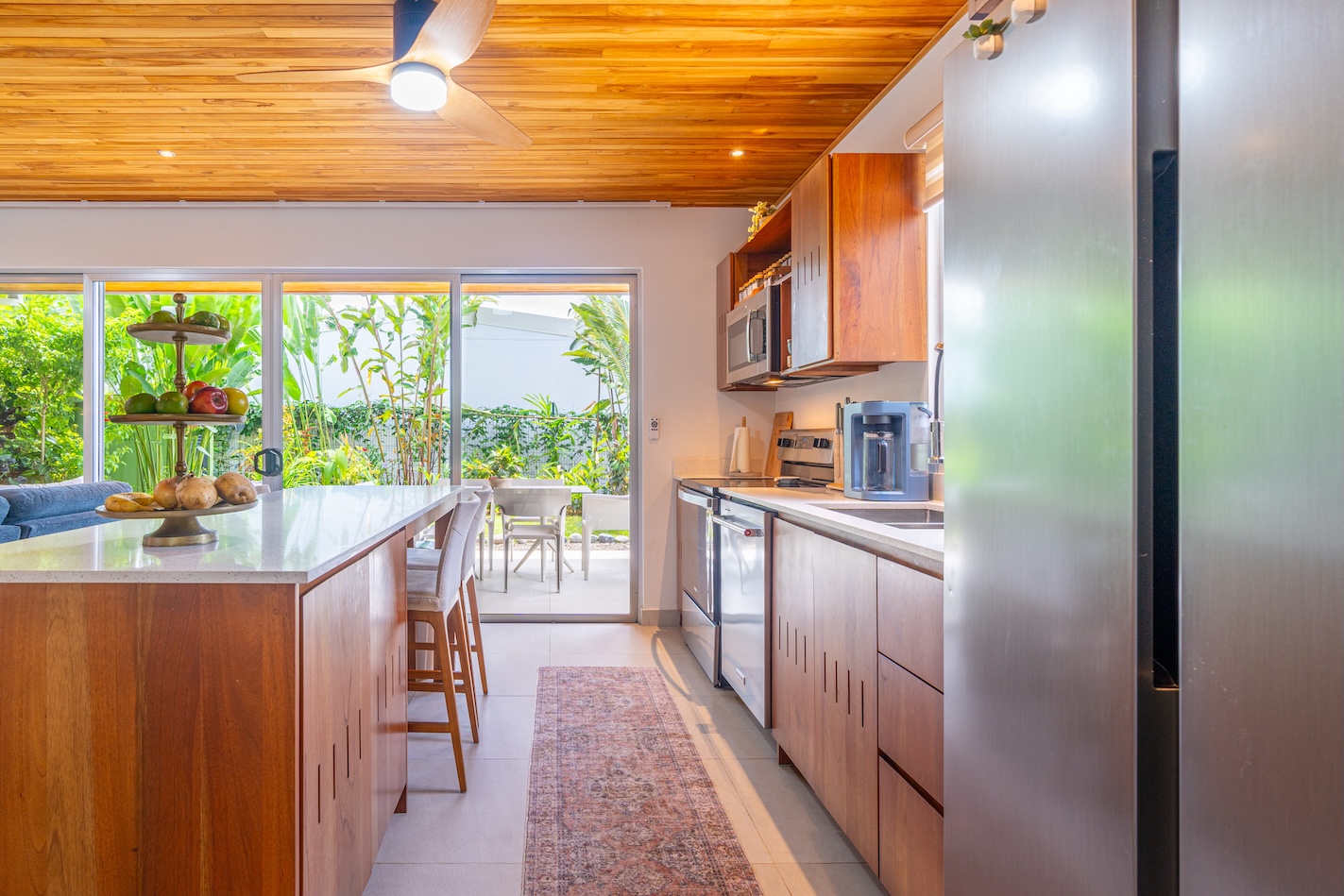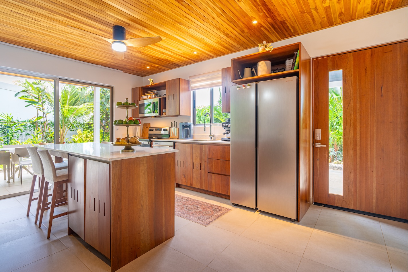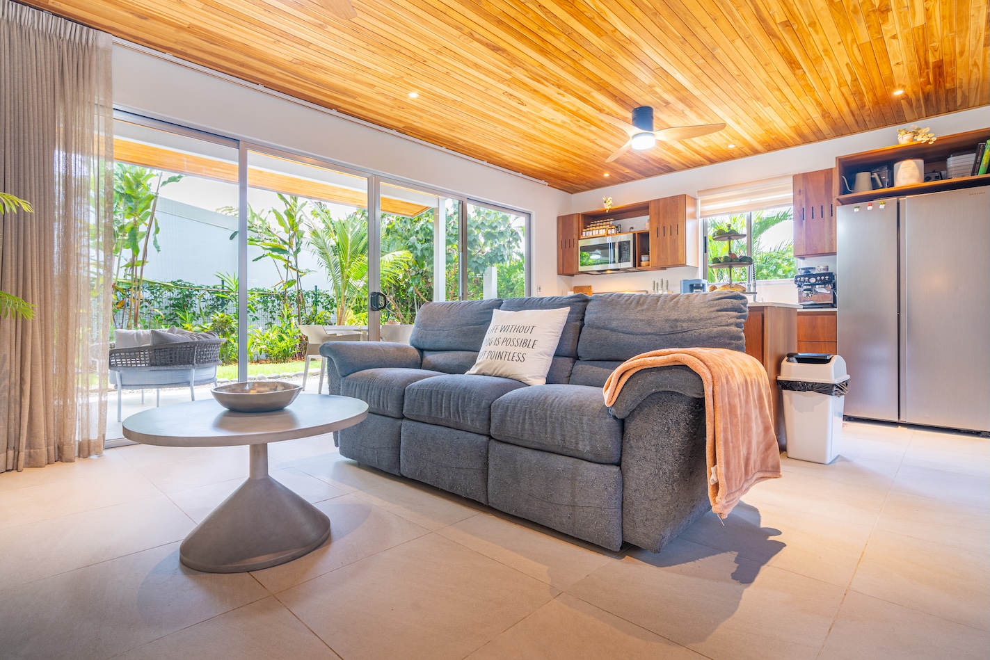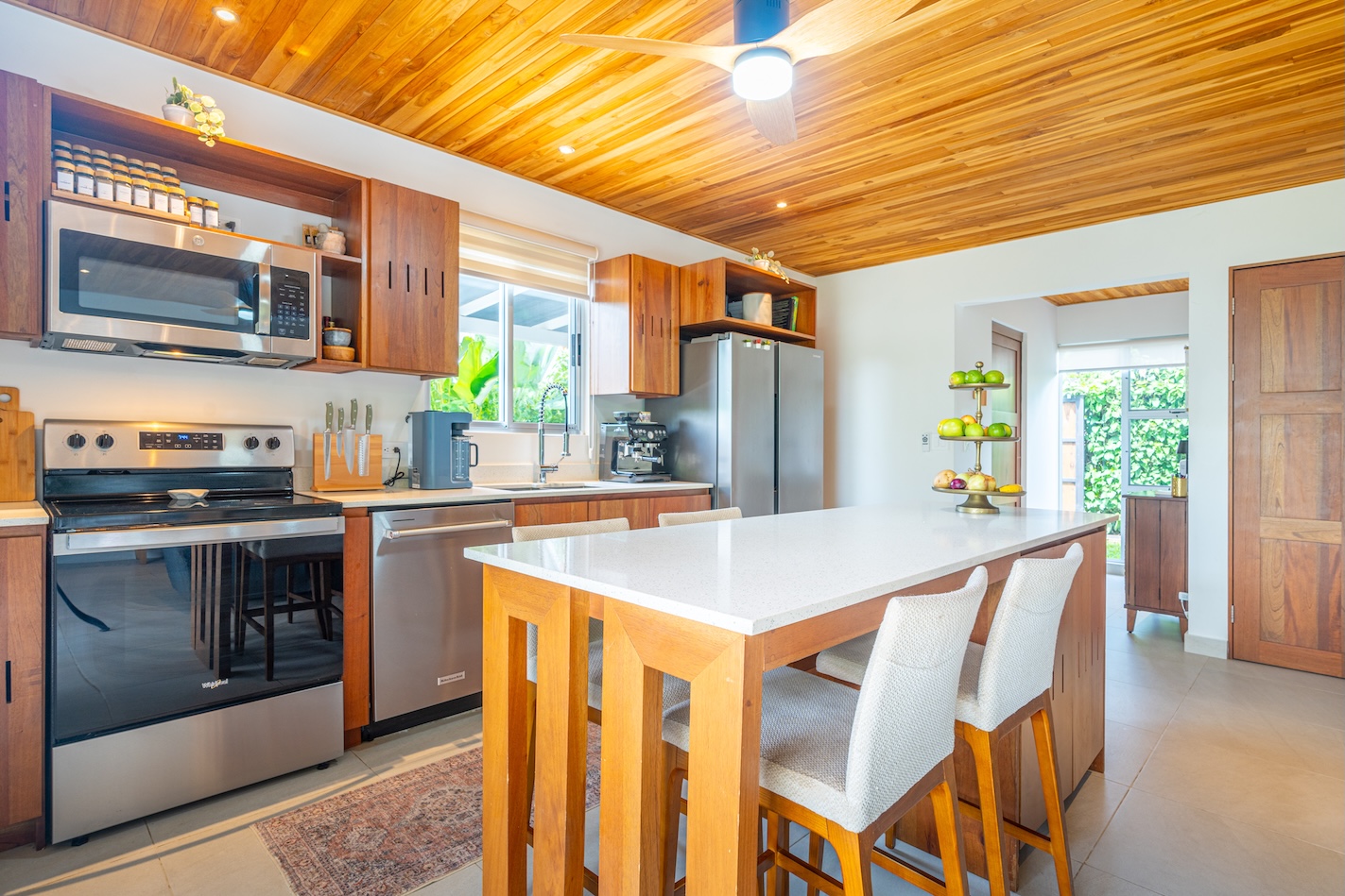 La cocina y sala de estar se integran perfectamente para momentos de relajación o entretenimiento, con aire acondicionado y ventiladores de techo distribuidos en toda la casa para garantizar confort durante todo el año.