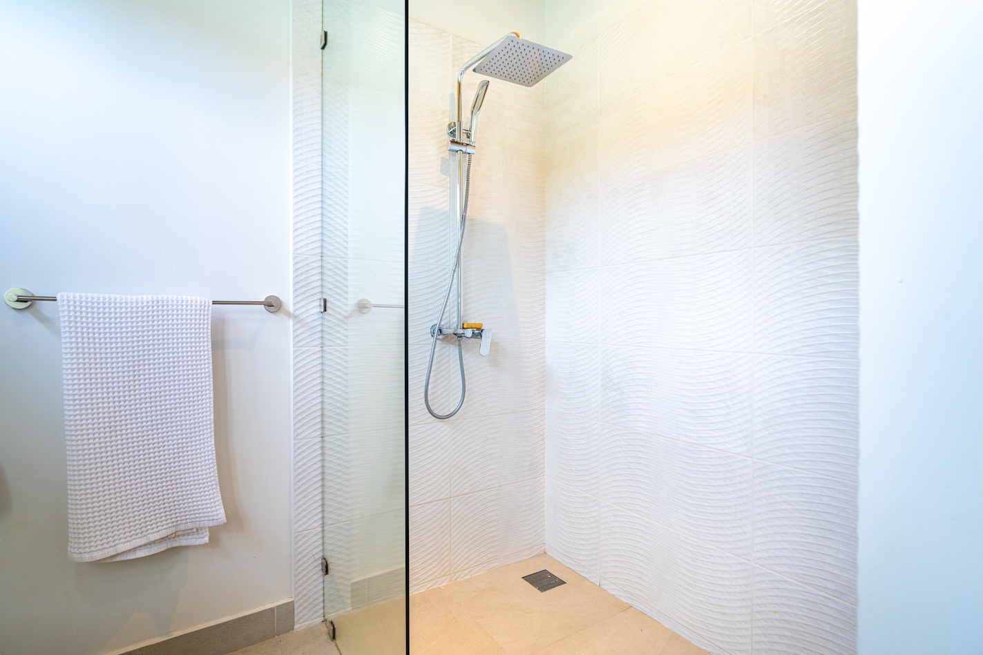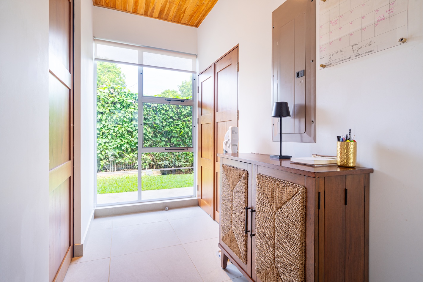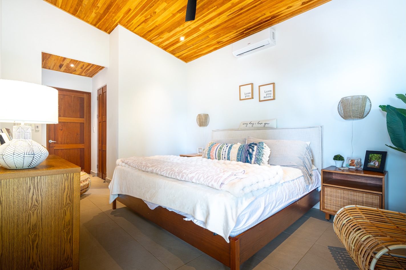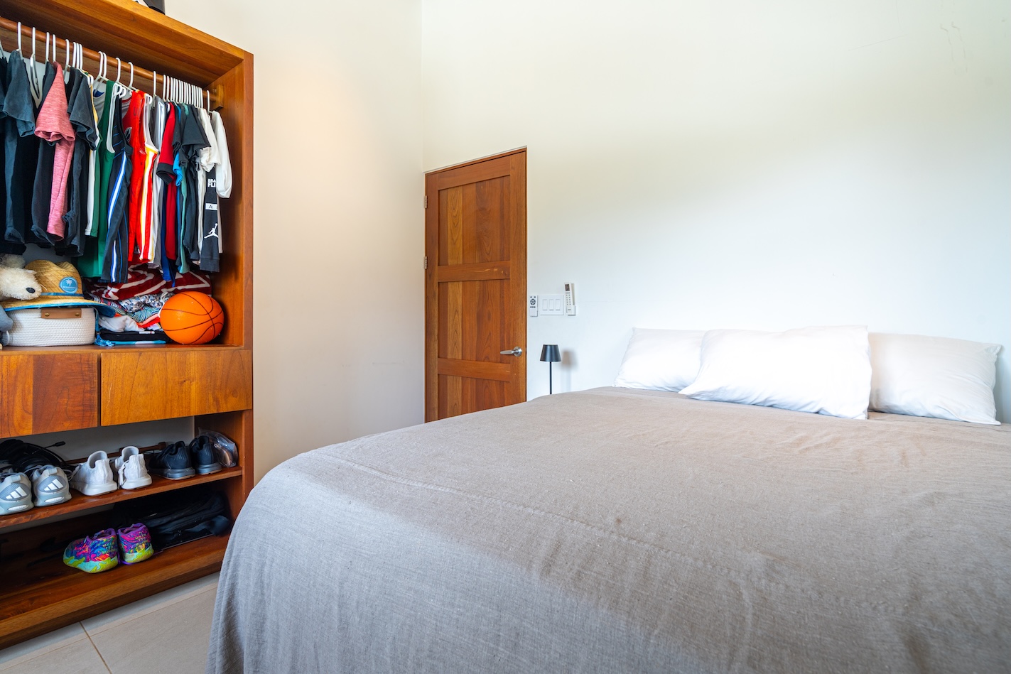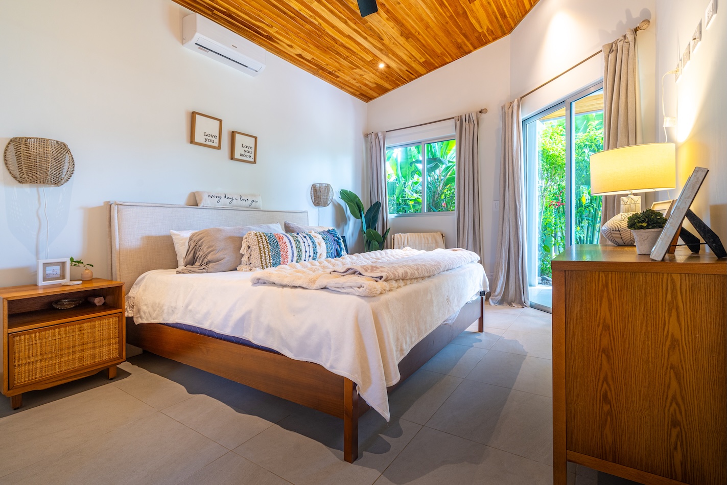 La suite principal está ubicada en la planta baja e incluye un espacioso walk-in closet/cuarto de secado, baño privado y acceso directo a la terraza y piscina a través de una gran puerta corrediza, perfecta para disfrutar de mañanas tranquilas o atardeceres relajantes.