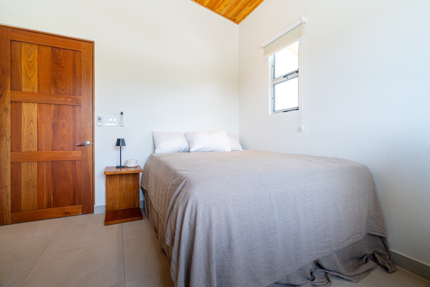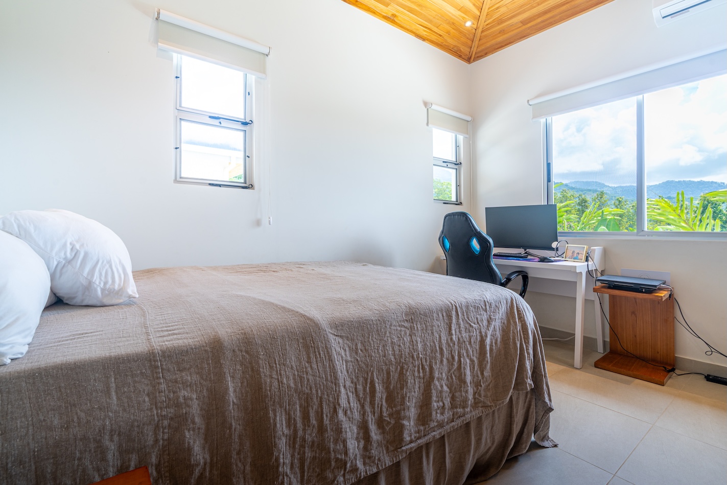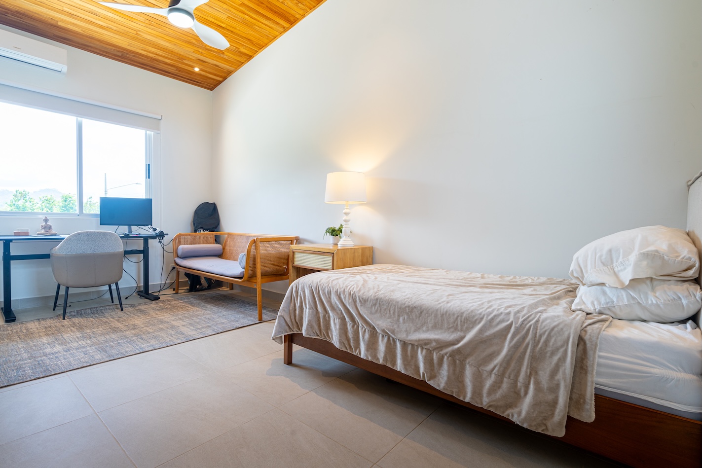 En la planta superior, dos dormitorios para invitados ofrecen impresionantes vistas a las montañas a través de grandes ventanales que enmarcan el paisaje como una pintura natural. Cada habitación cuenta con su propio aire acondicionado, asegurando la comodidad tanto para familiares como para visitas.