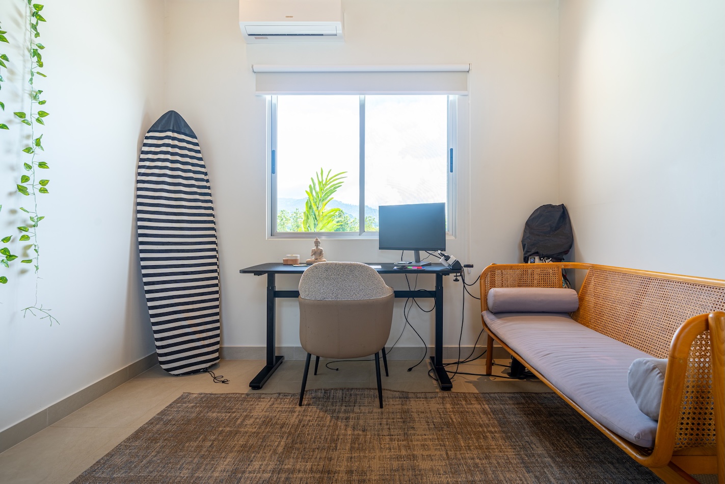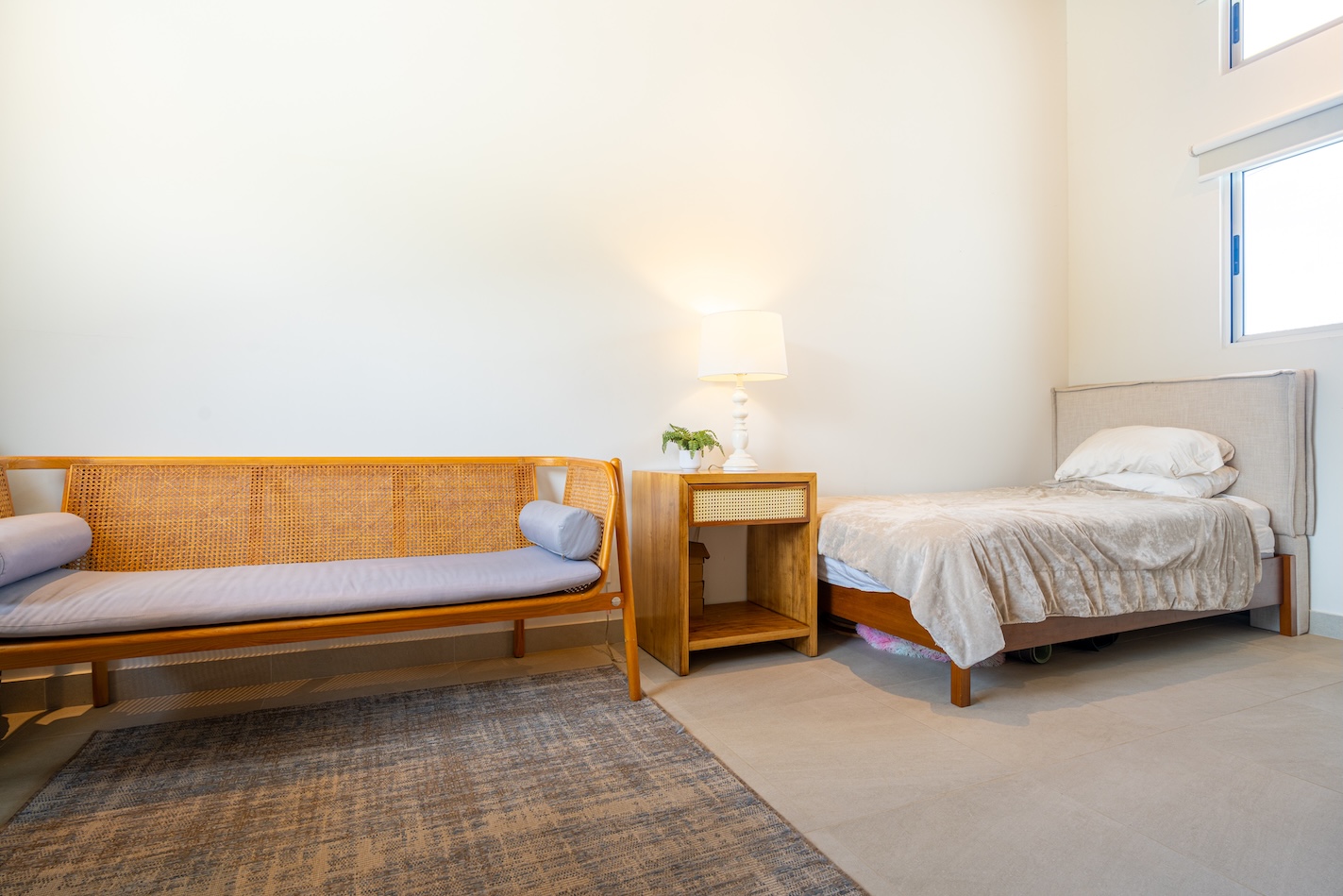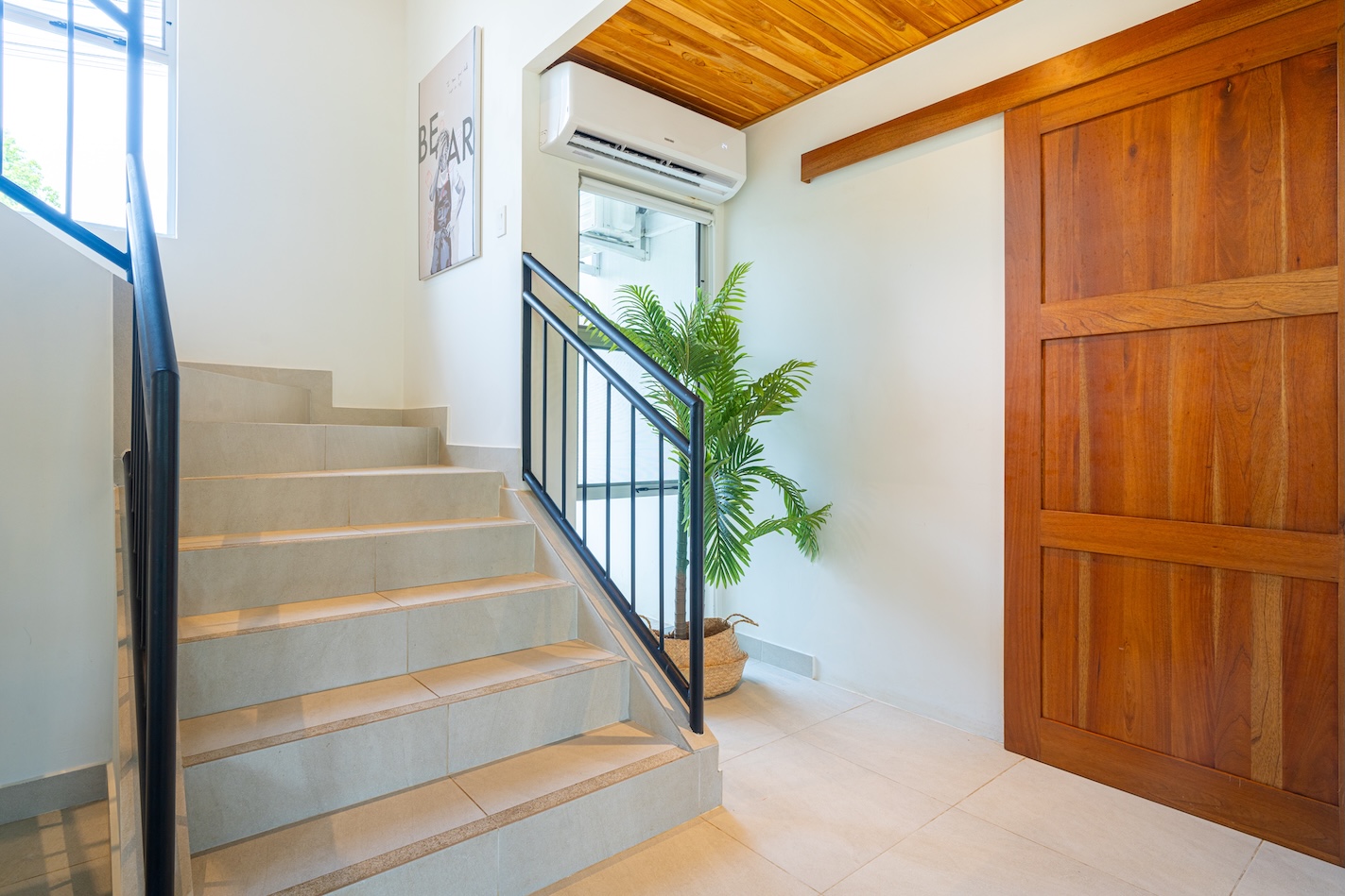 En la planta superior, dos dormitorios para invitados ofrecen impresionantes vistas a las montañas a través de grandes ventanales que enmarcan el paisaje como una pintura natural. Cada habitación cuenta con su propio aire acondicionado, asegurando la comodidad tanto para familiares como para visitas.