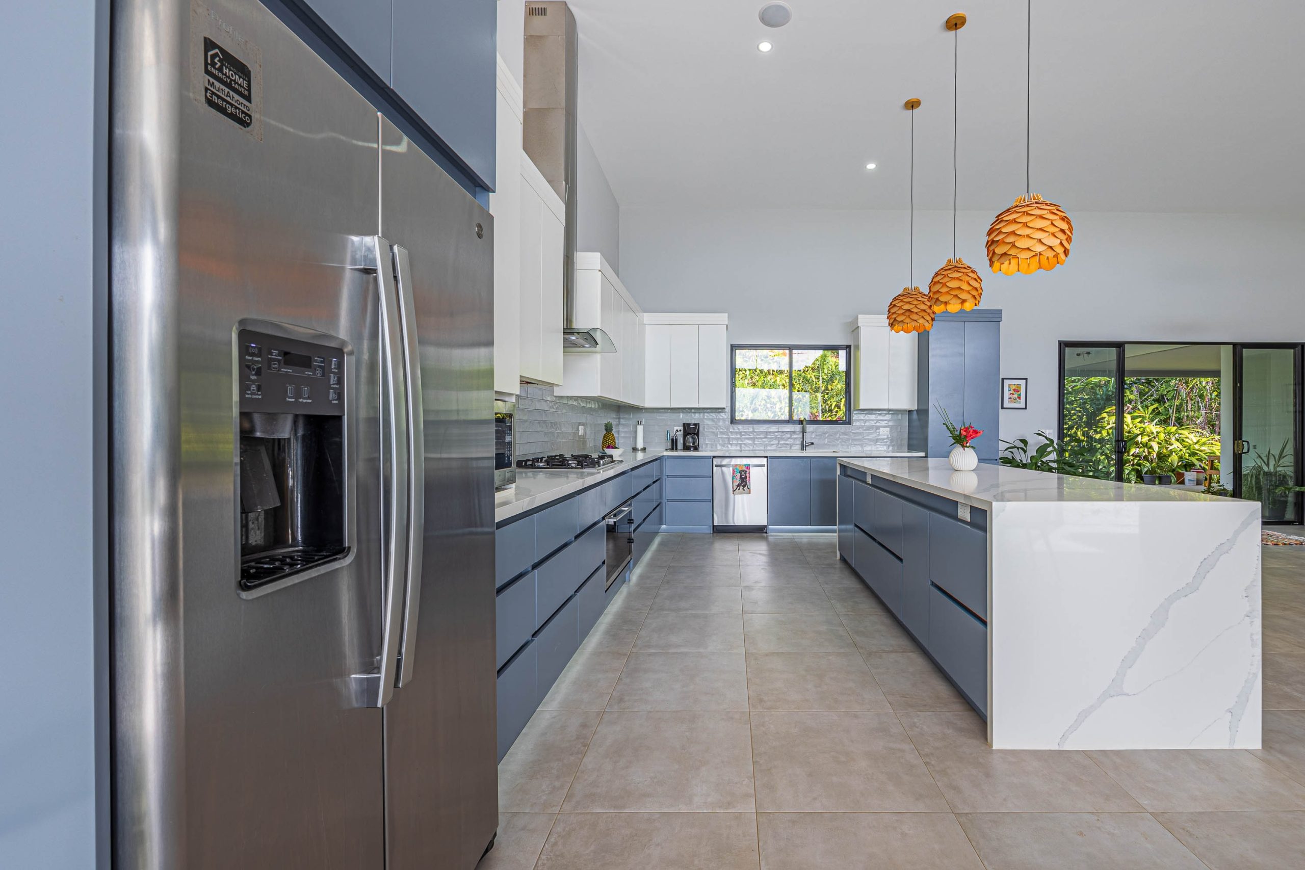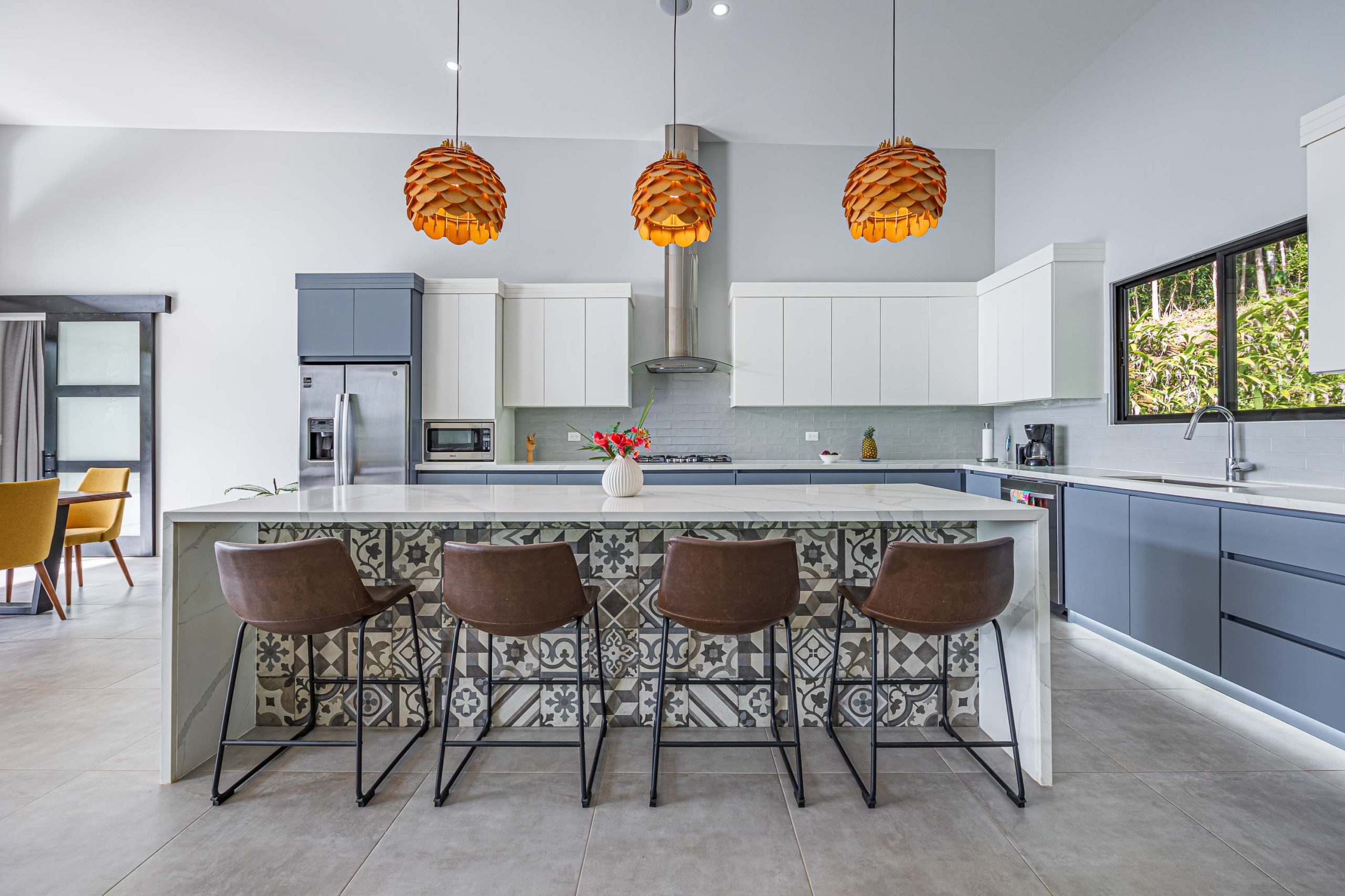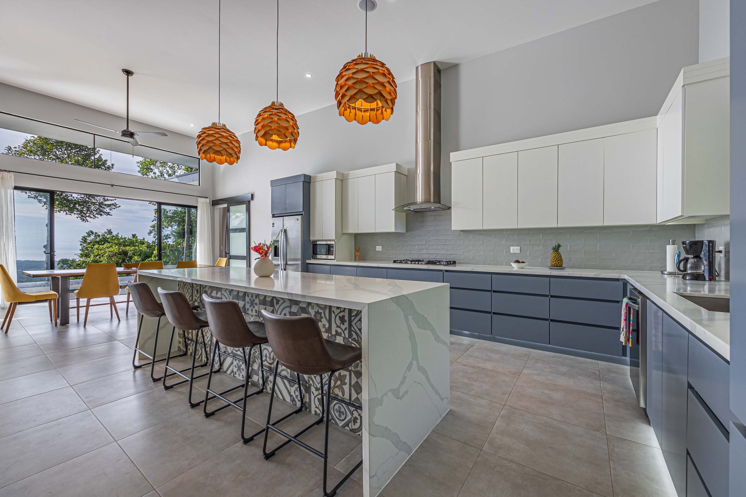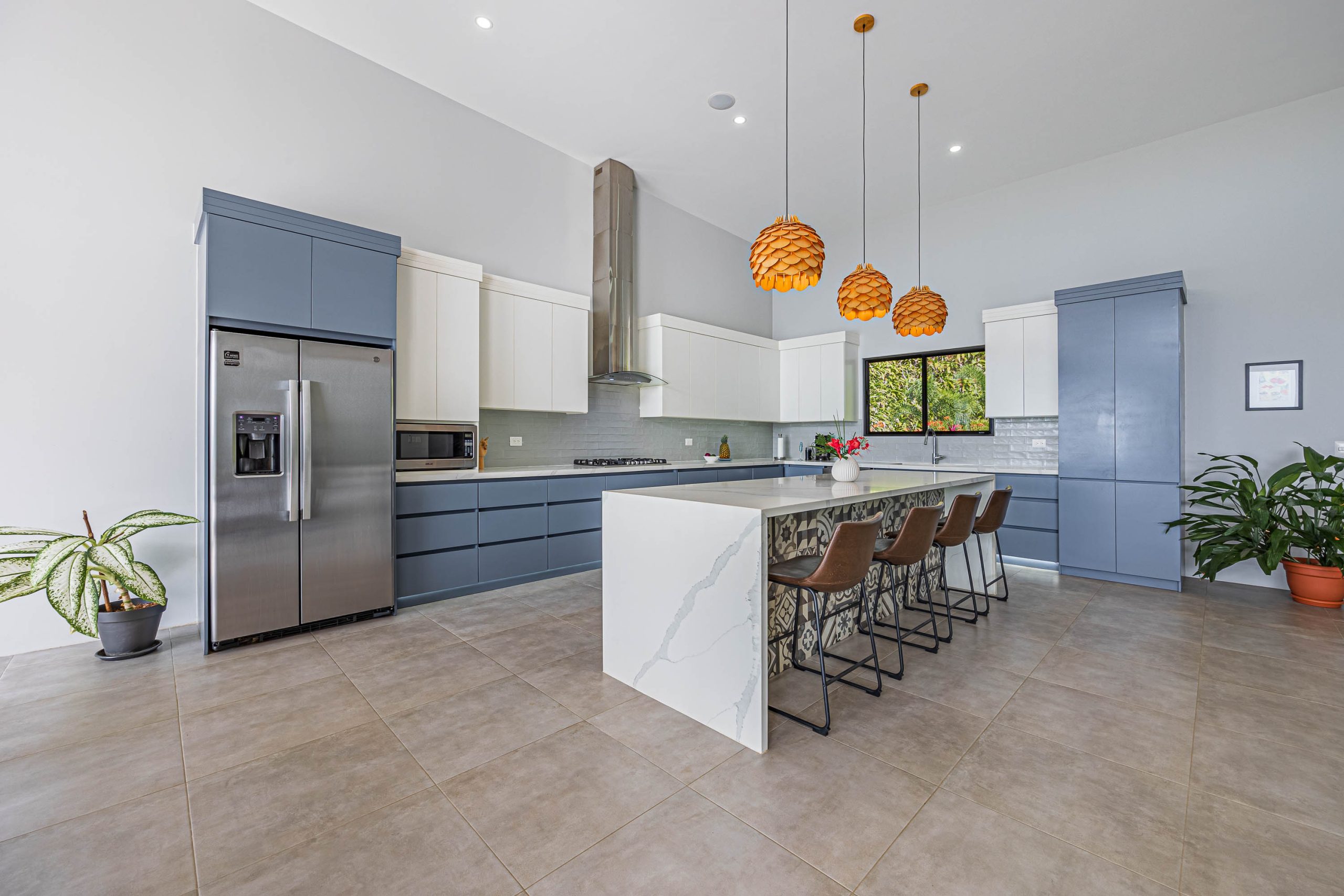 Construida en 2022, esta elegante casa de un solo nivel es ideal tanto para una familia amplia como para una pareja que busca un refugio tranquilo para disfrutar de la jubilación. El diseño de concepto abierto integra a la perfección el lujo contemporáneo con el entorno natural. Como una de las propiedades más destacadas de lujo en Parrita, la amplia sala principal está equipada con electrodomésticos de alta gama: horno de convección eléctrico, cocina de propano de cinco quemadores, refrigerador de 28 pies cúbicos con dispensador de hielo, lavavajillas y triturador de basura. Todo ello se enmarca en muebles de cocina a medida y elegantes encimeras de cuarzo importadas de Italia.