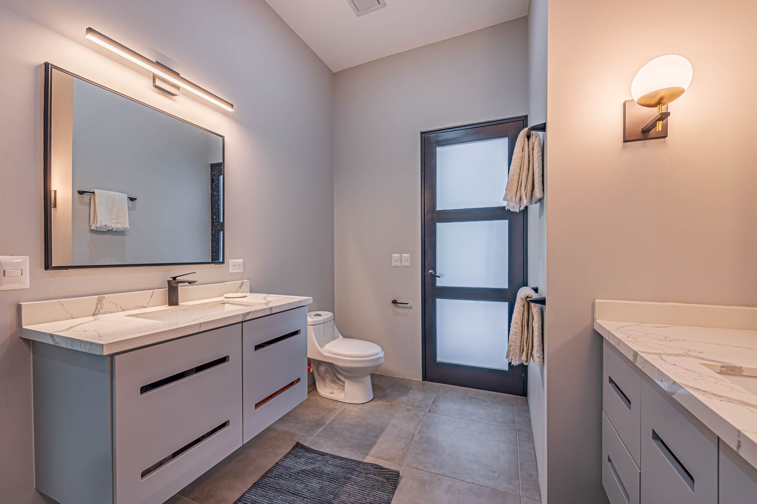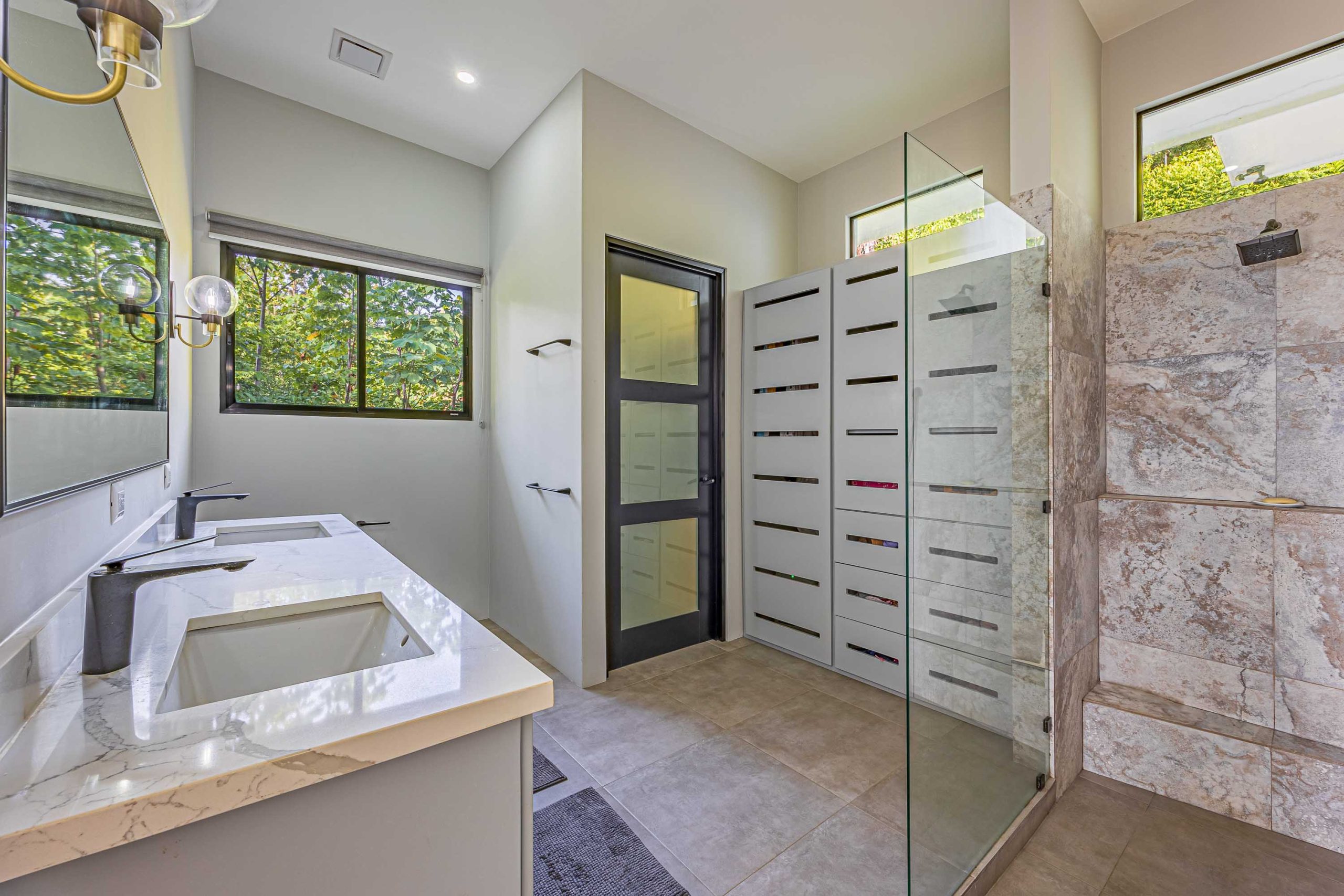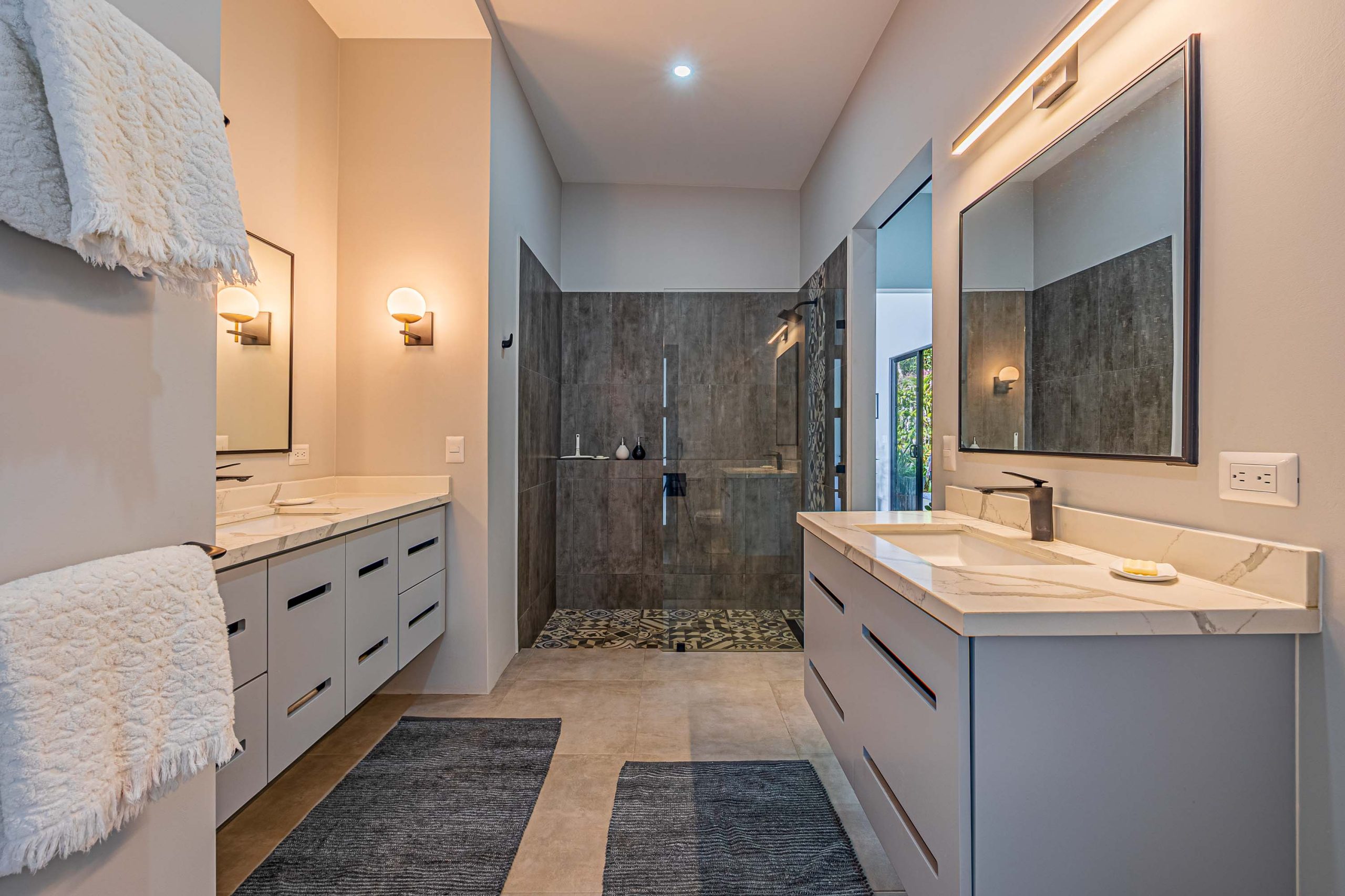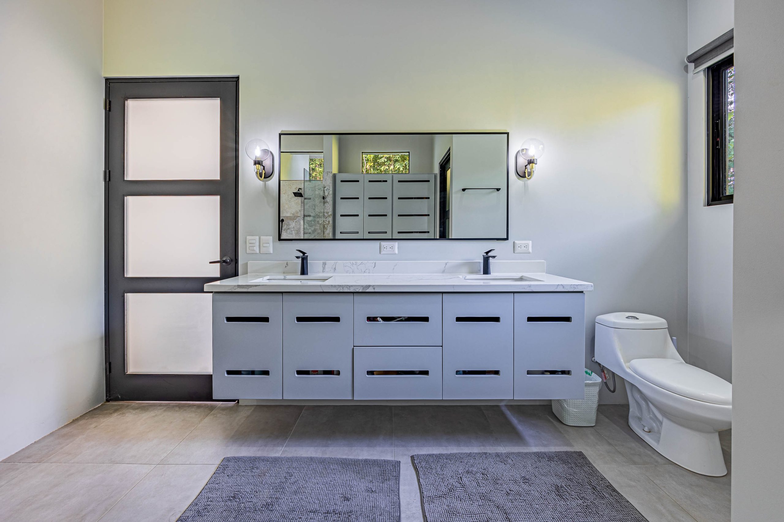 Construida en 2022, esta elegante casa de un solo nivel es ideal tanto para una familia amplia como para una pareja que busca un refugio tranquilo para disfrutar de la jubilación. El diseño de concepto abierto integra a la perfección el lujo contemporáneo con el entorno natural. Como una de las propiedades más destacadas de lujo en Parrita, la amplia sala principal está equipada con electrodomésticos de alta gama: horno de convección eléctrico, cocina de propano de cinco quemadores, refrigerador de 28 pies cúbicos con dispensador de hielo, lavavajillas y triturador de basura. Todo ello se enmarca en muebles de cocina a medida y elegantes encimeras de cuarzo importadas de Italia.