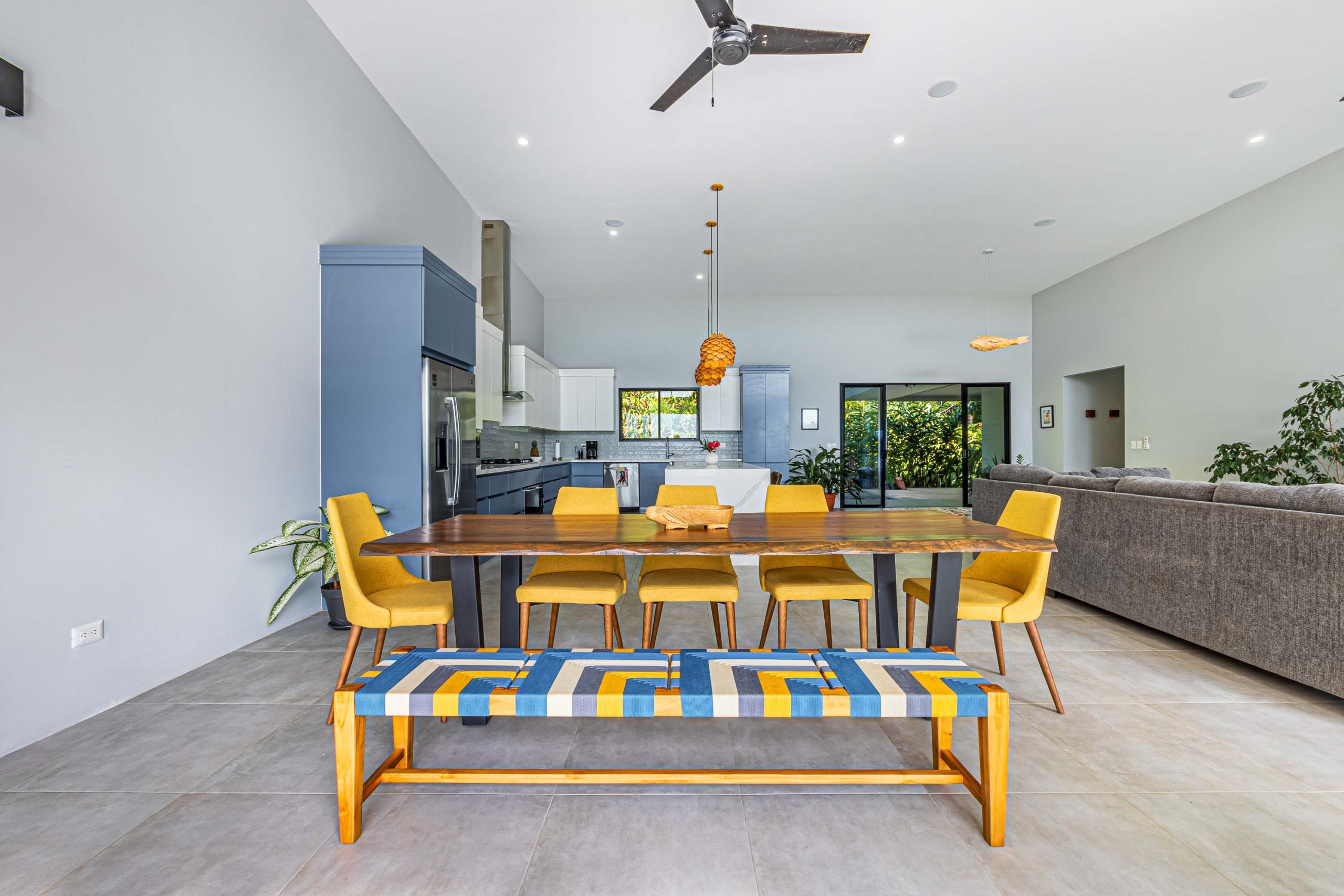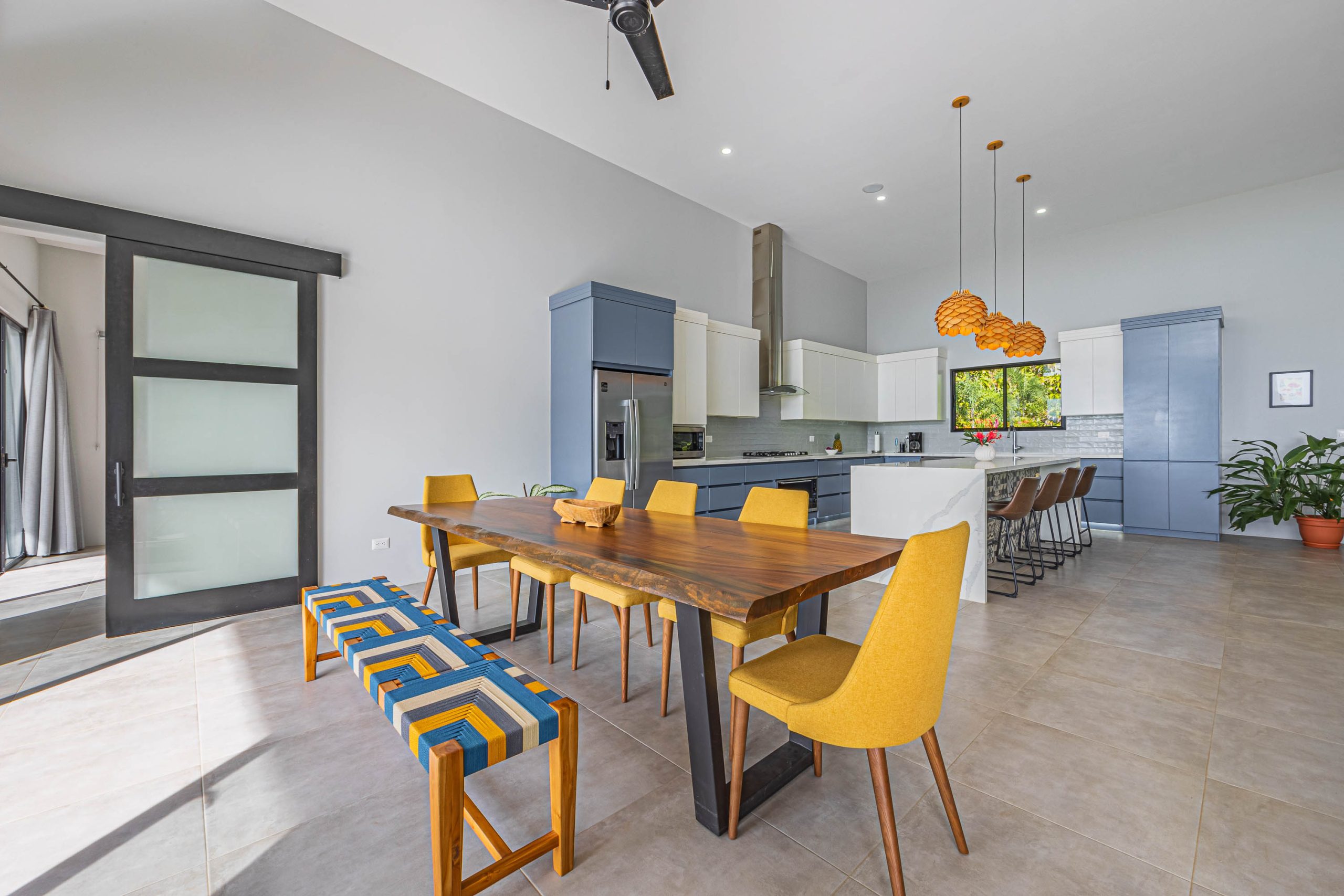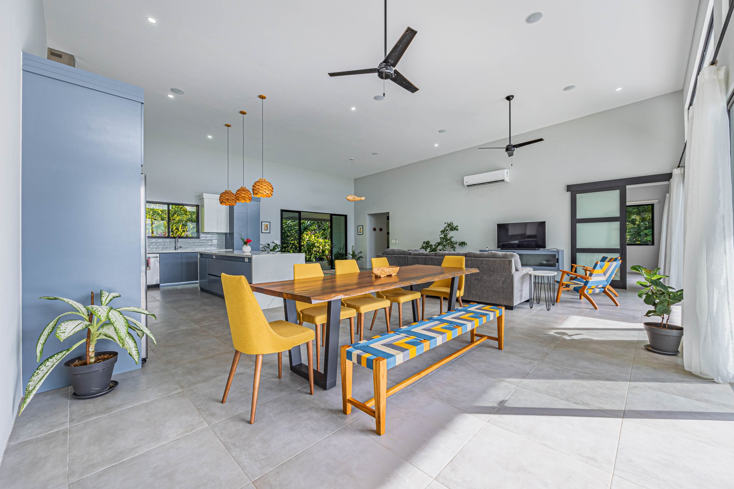 La propiedad se vende completamente amueblada, con piezas excepcionales como una mesa de comedor de Guanacaste maciza para ocho personas, además de sillas y bancas artesanales de tela Masaya tejida a mano. Dos de los tres dormitorios cuentan con camas king y ropa de cama premium, mientras que el tercero dispone de una cama queen y una cama individual, ambas elaboradas en madera de Guanacaste.
