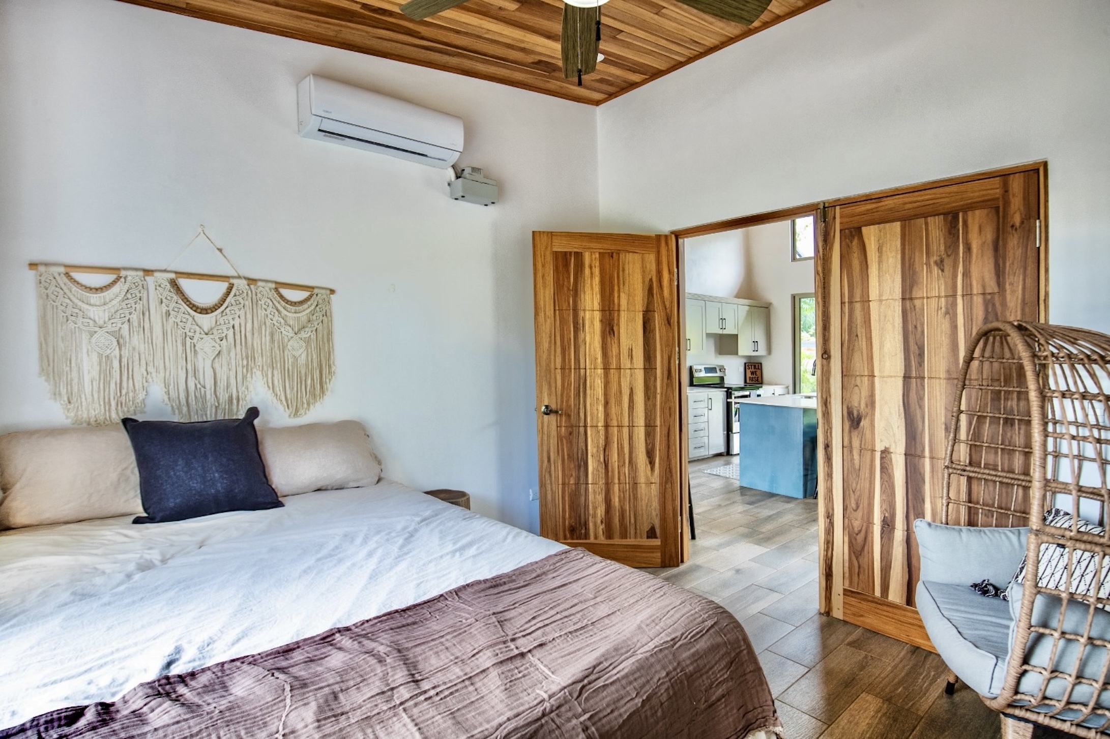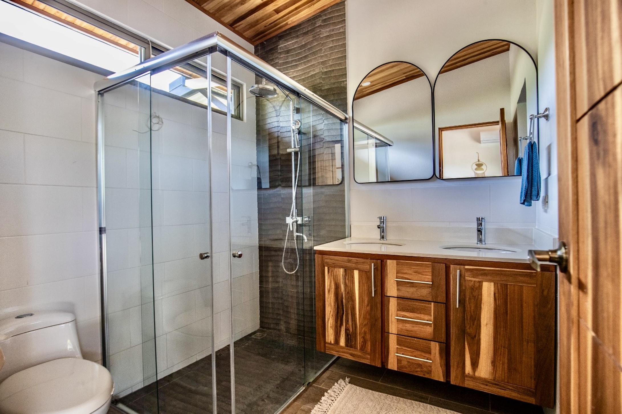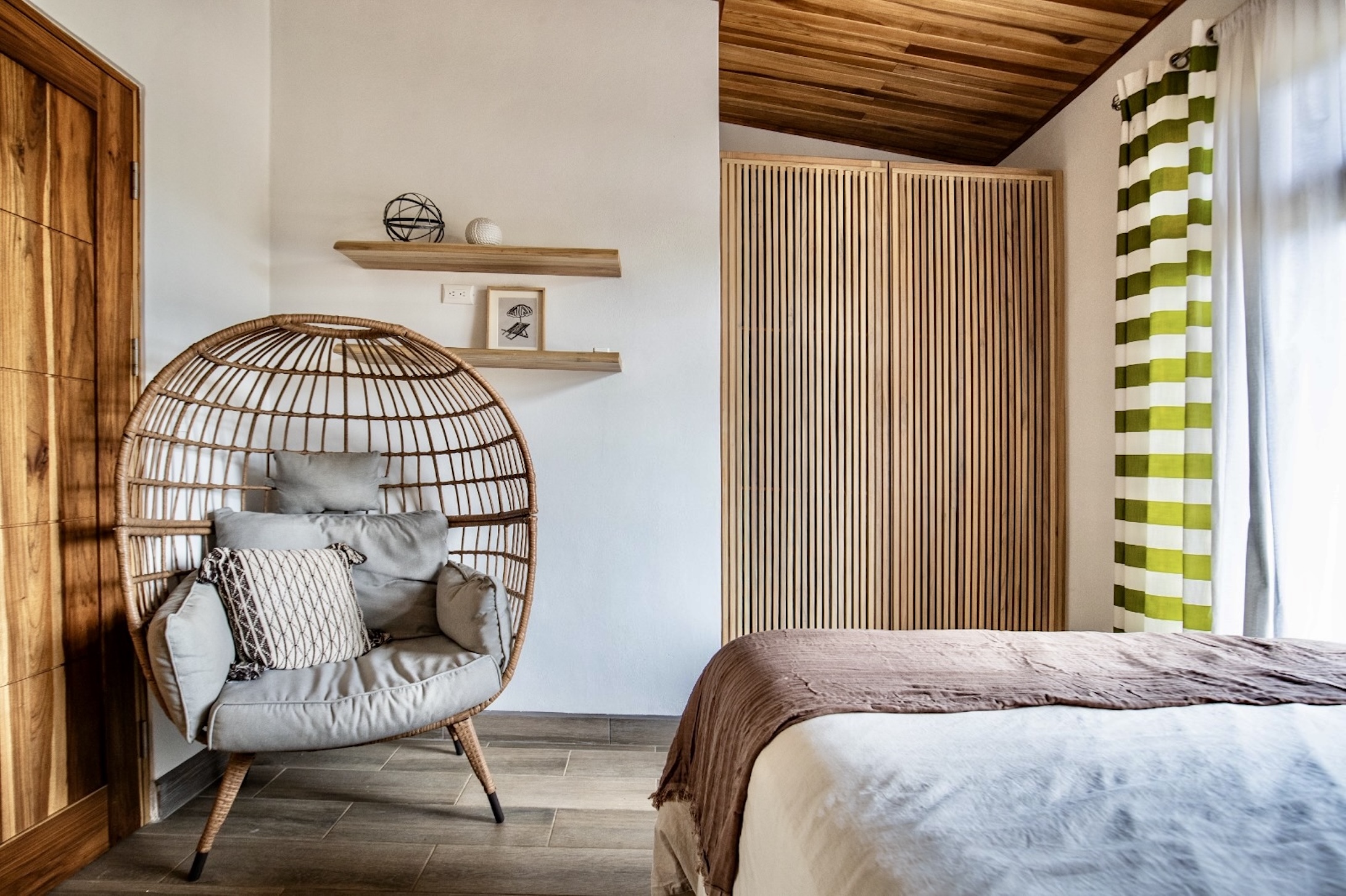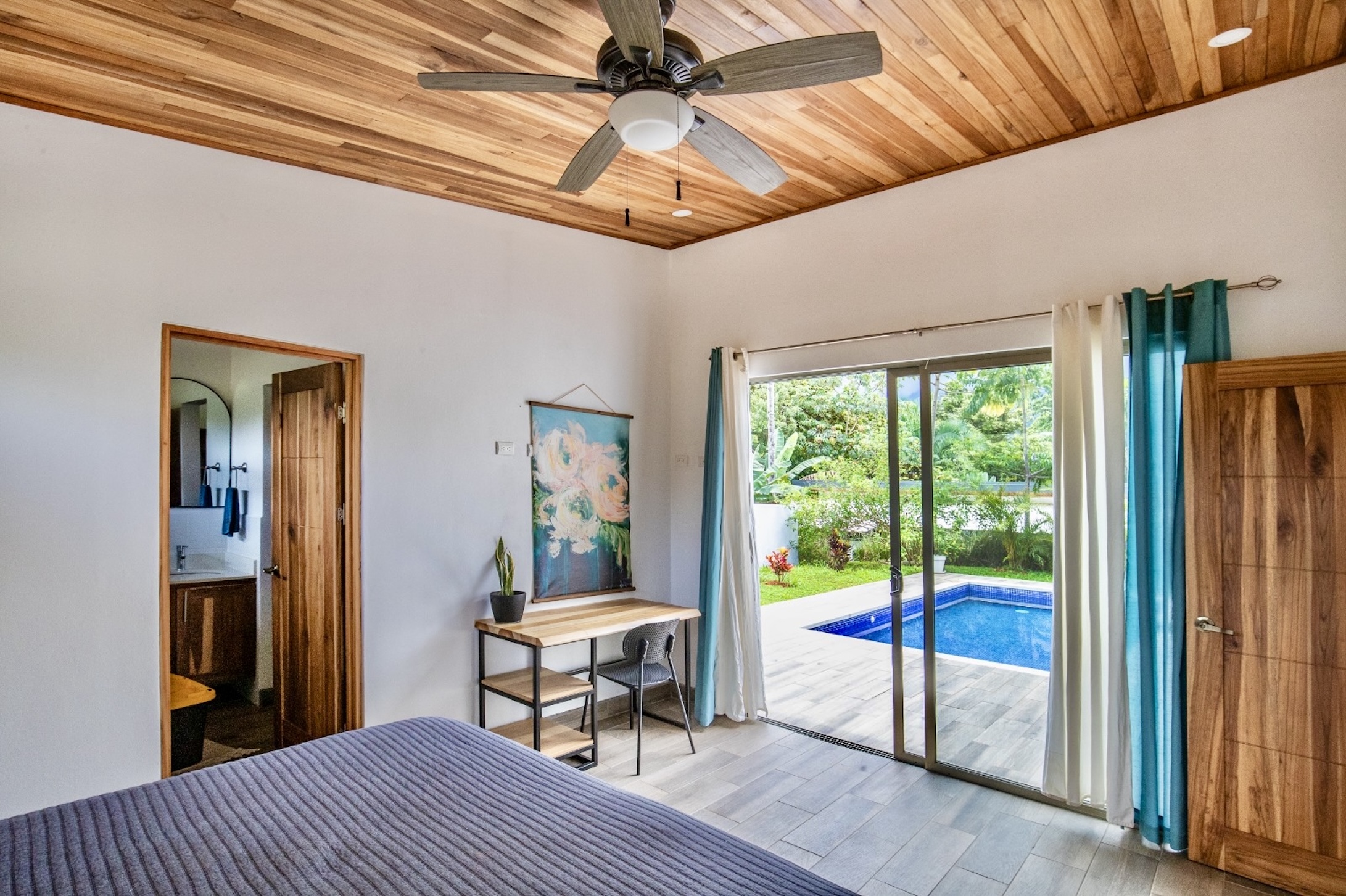 La suite principal está diseñada para brindar comodidad y privacidad, con baño en suite, vestidor y vistas a la piscina y a las montañas. Los dos dormitorios adicionales cuentan con armarios empotrados y comparten un baño completo. Ambos baños están equipados con sistemas de ventilación que mejoran el confort y la frescura en el clima tropical.