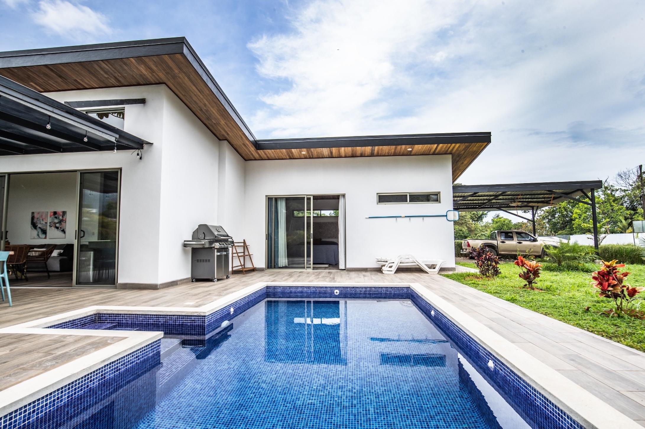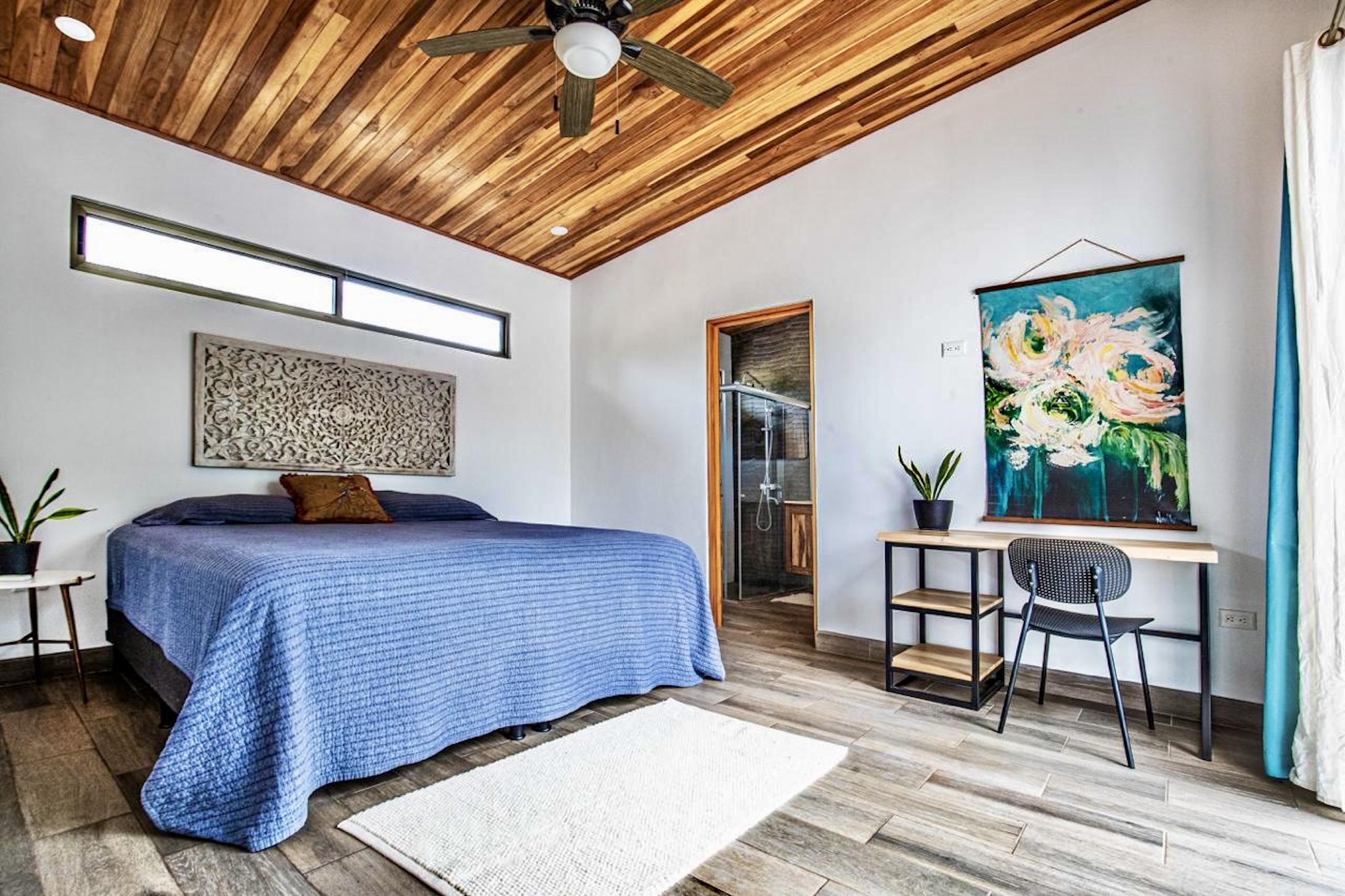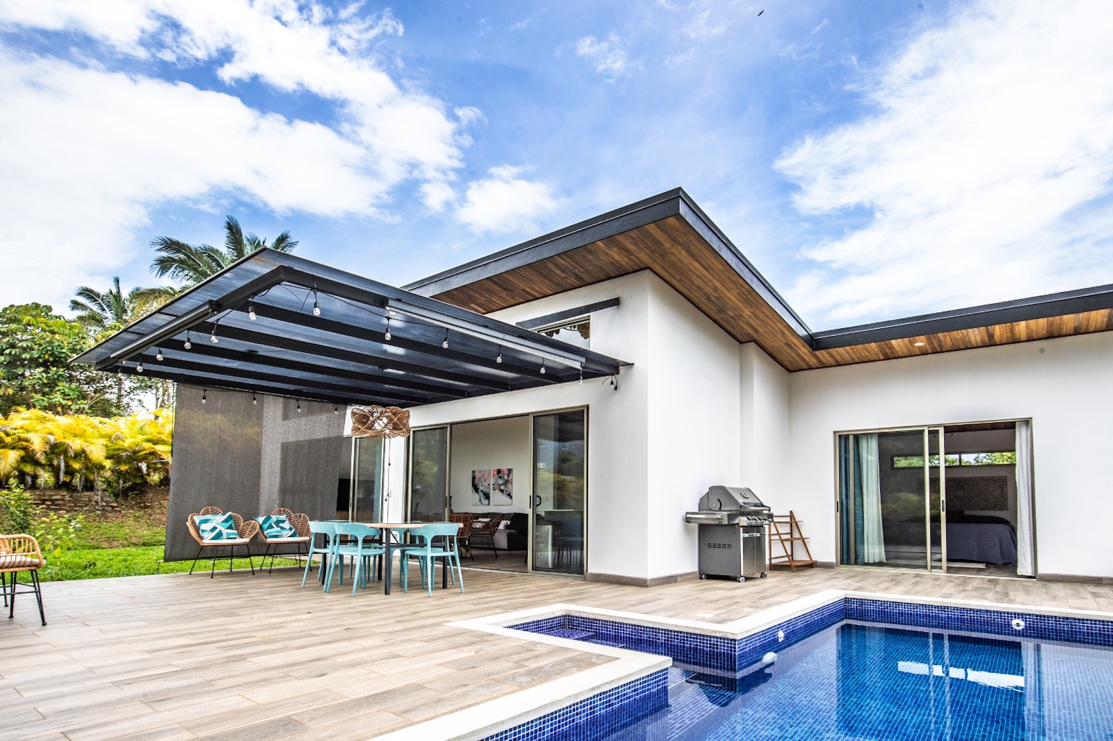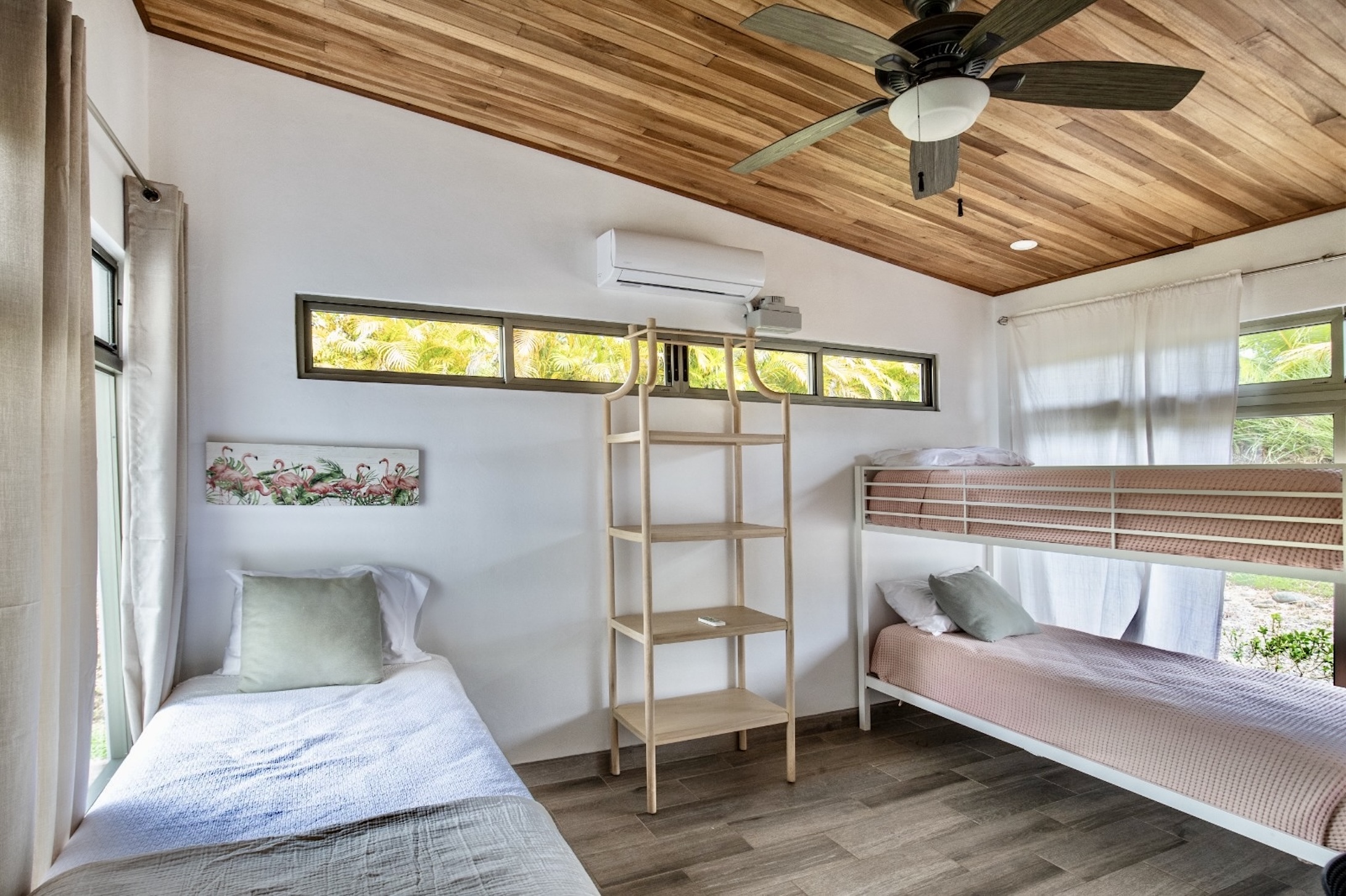 La suite principal está diseñada para brindar comodidad y privacidad, con baño en suite, vestidor y vistas a la piscina y a las montañas. Los dos dormitorios adicionales cuentan con armarios empotrados y comparten un baño completo. Ambos baños están equipados con sistemas de ventilación que mejoran el confort y la frescura en el clima tropical.