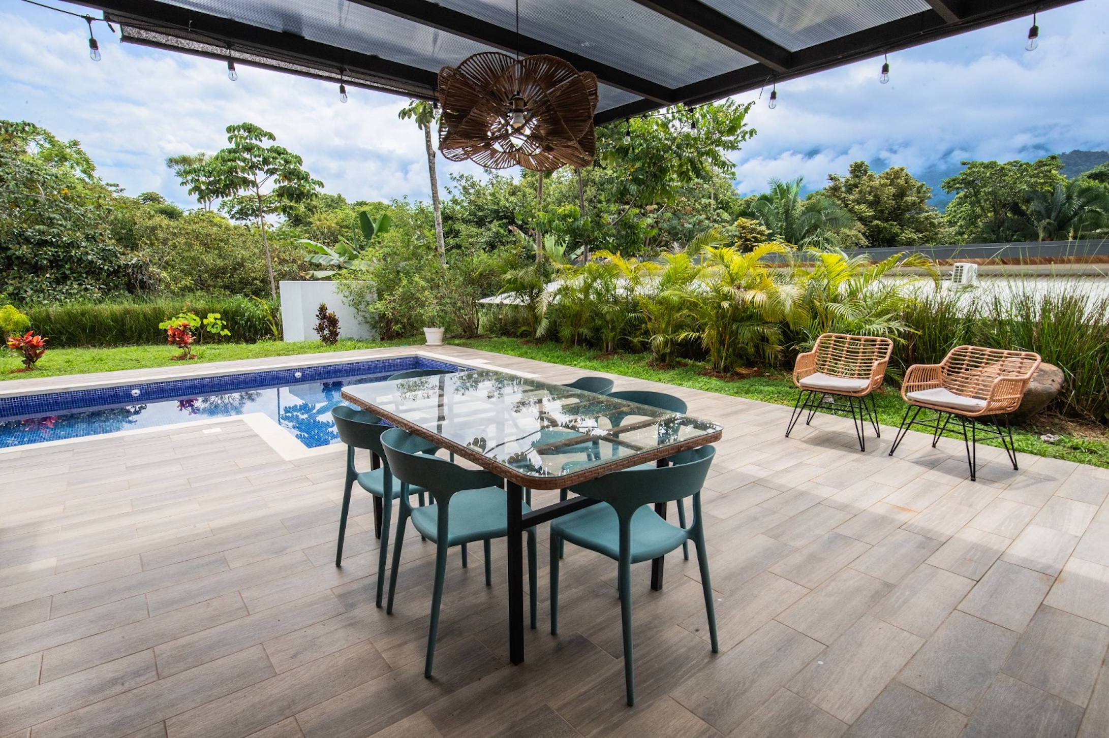 The primary suite is designed to provide comfort and privacy, featuring an en-suite bathroom, a walk-in closet, and views of both the pool and the mountains. The two additional bedrooms include built-in closets and share a full bathroom. Both bathrooms are equipped with ventilation systems that enhance comfort and freshness in the tropical climate.