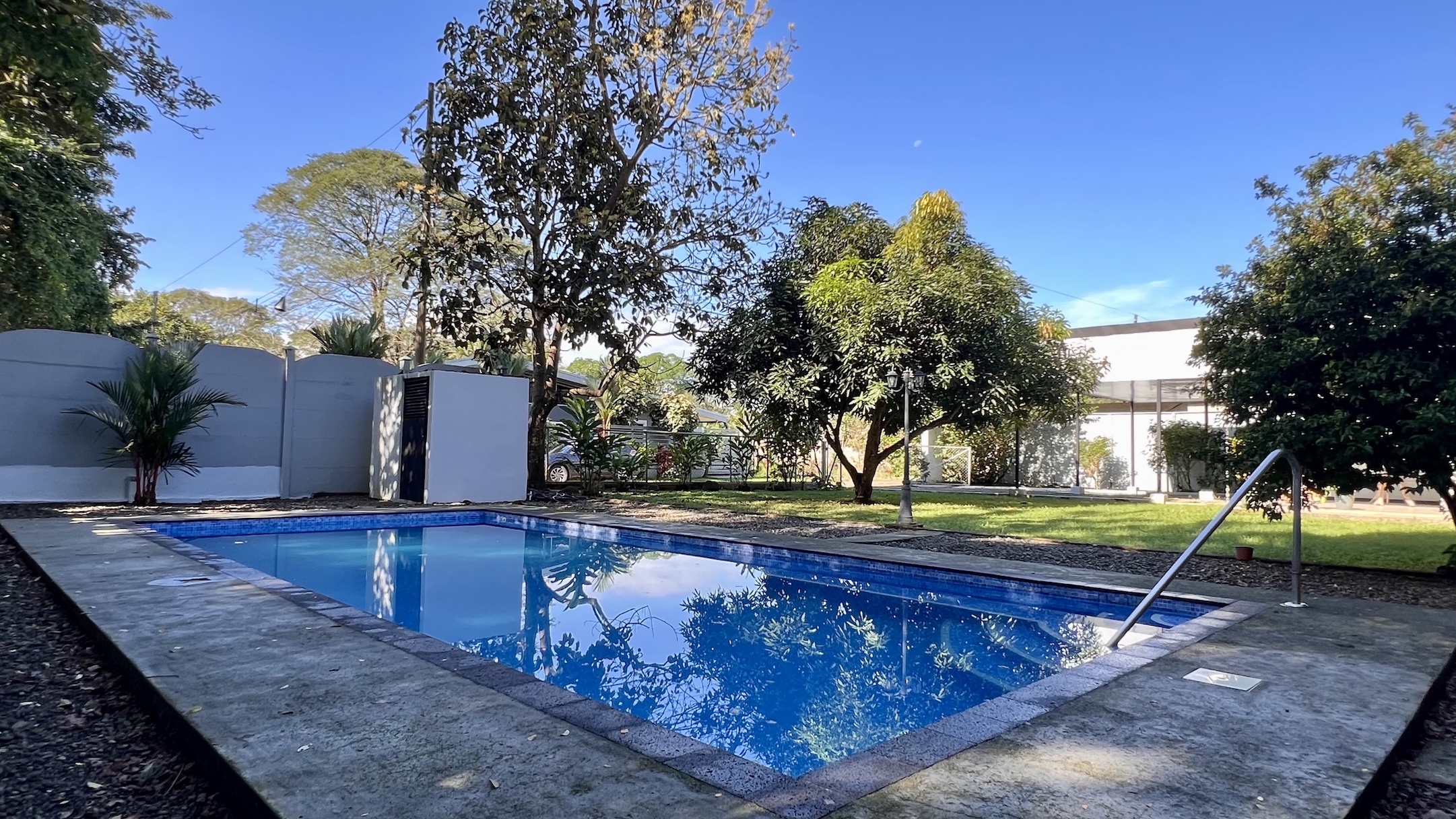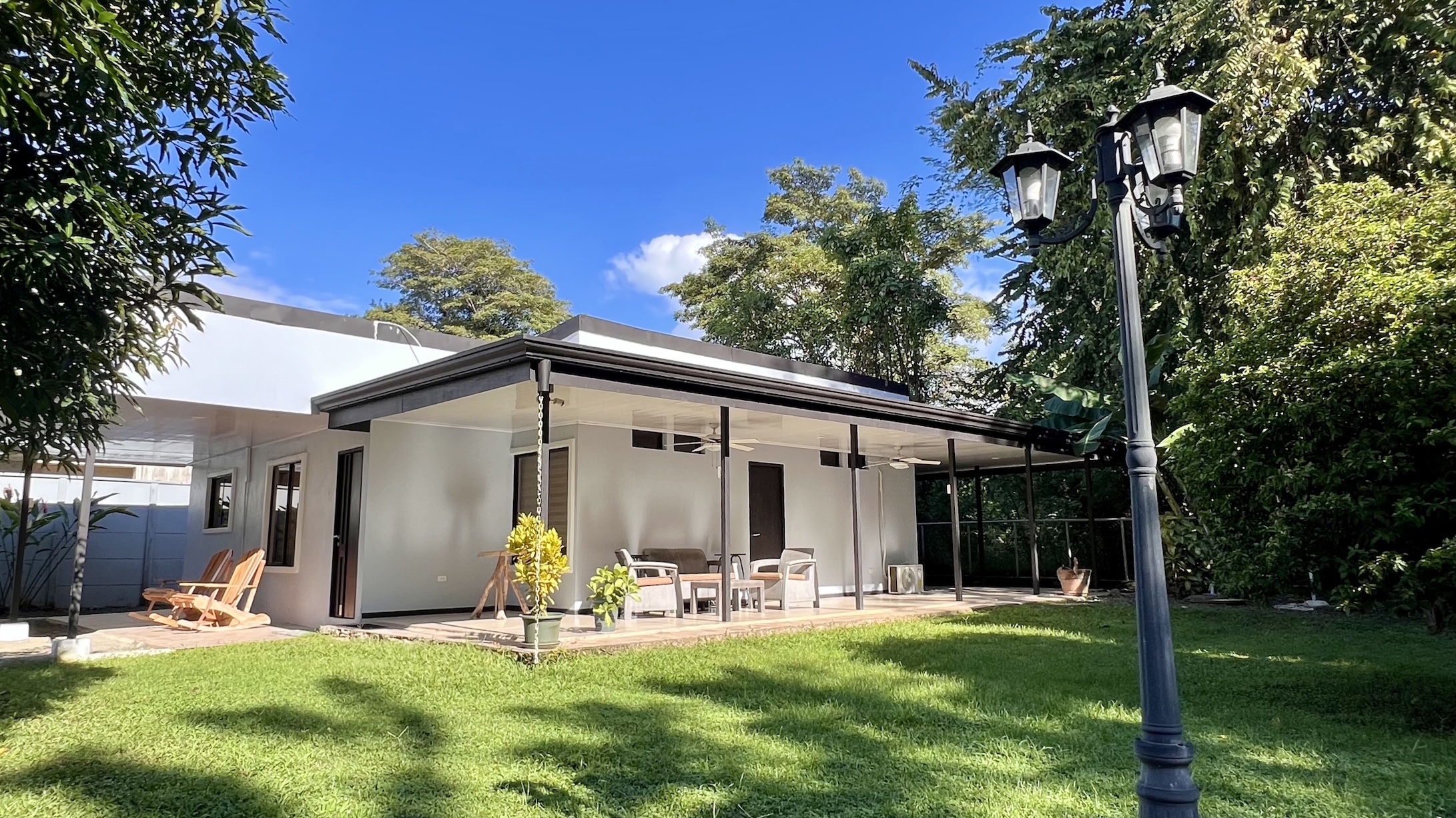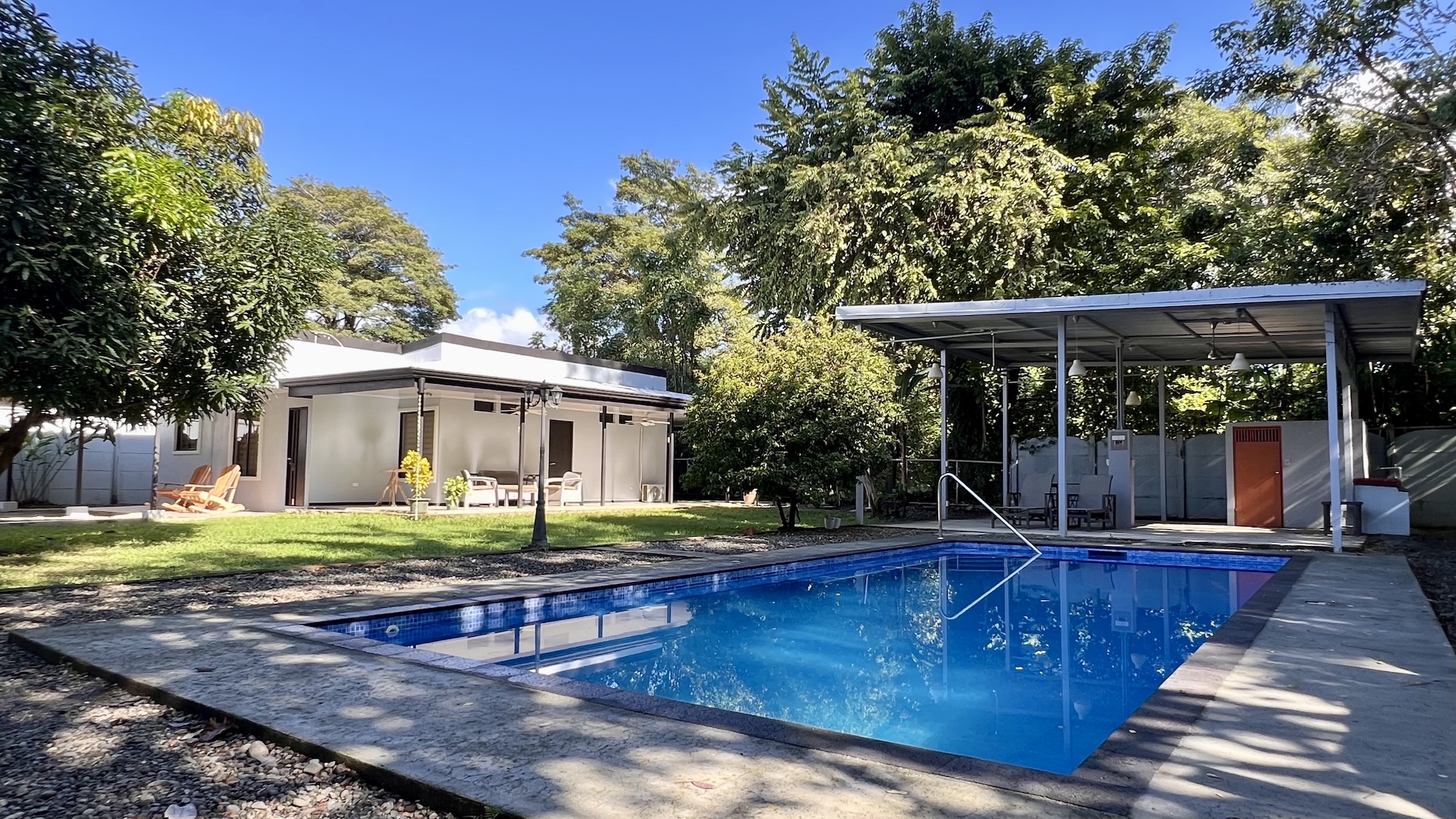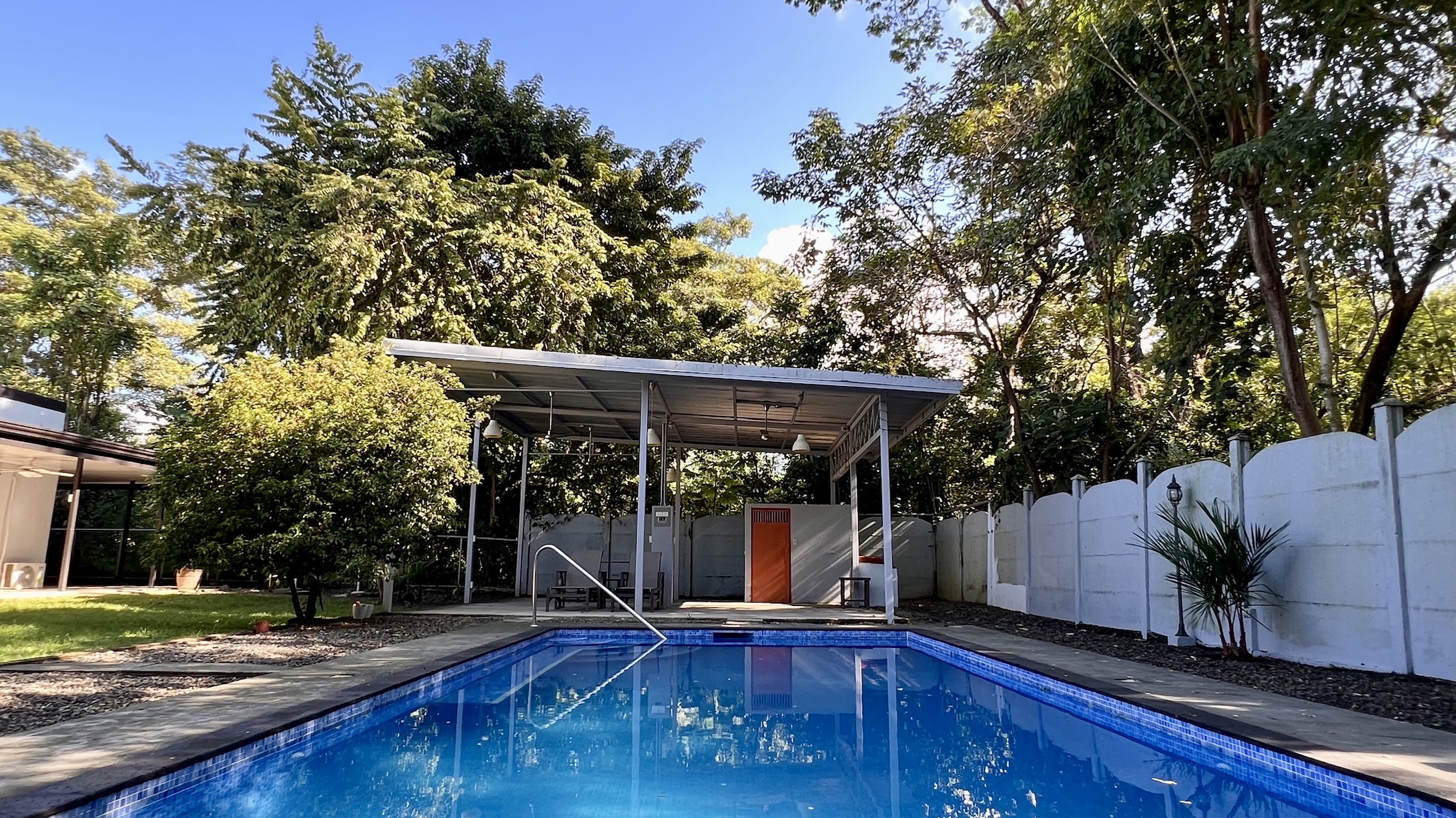 The property spans two lots totaling 781 m², offering more outdoor space than many other homes in the area. A beautiful 4 x 9 m (13 x 30 ft) swimming pool, elegantly illuminated at night, becomes the centerpiece of outdoor living. The spacious rancho, meticulously maintained garden, and covered terrace—bathed in warm morning sunlight—create the perfect setting to enjoy the tropical lifestyle. Mature trees provide natural shade, while the adjacent creek adds a touch of serenity.