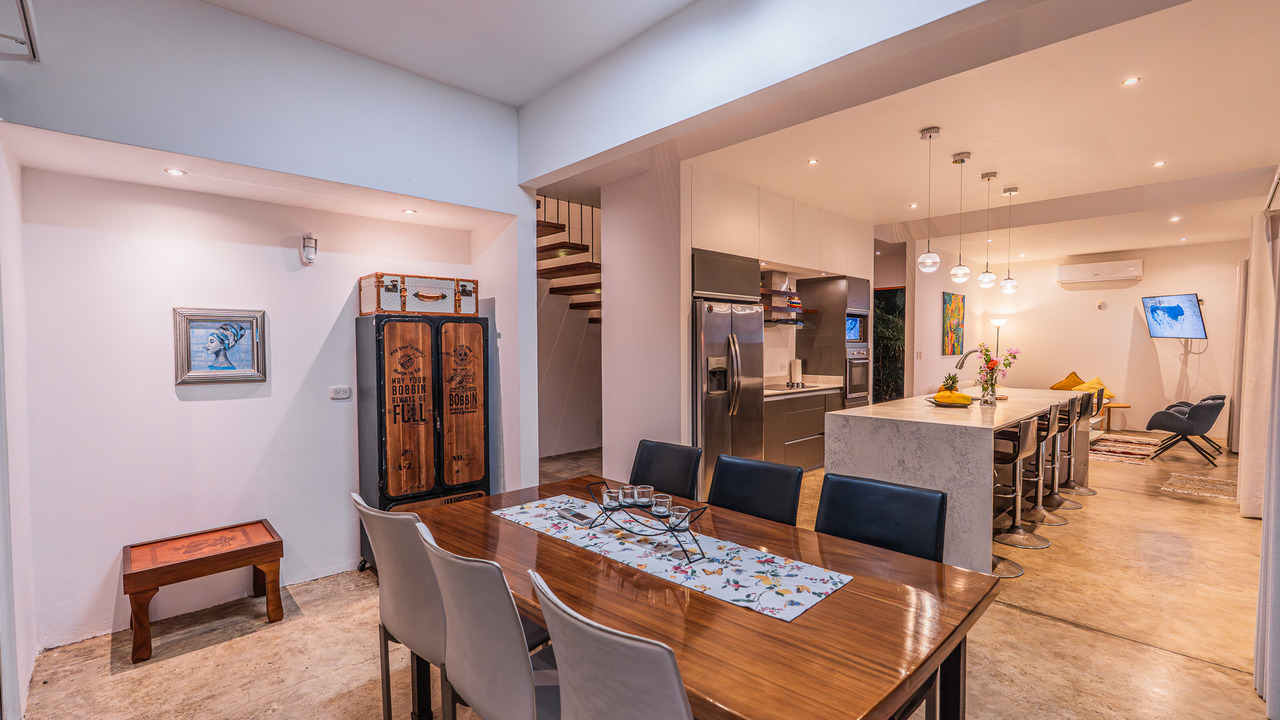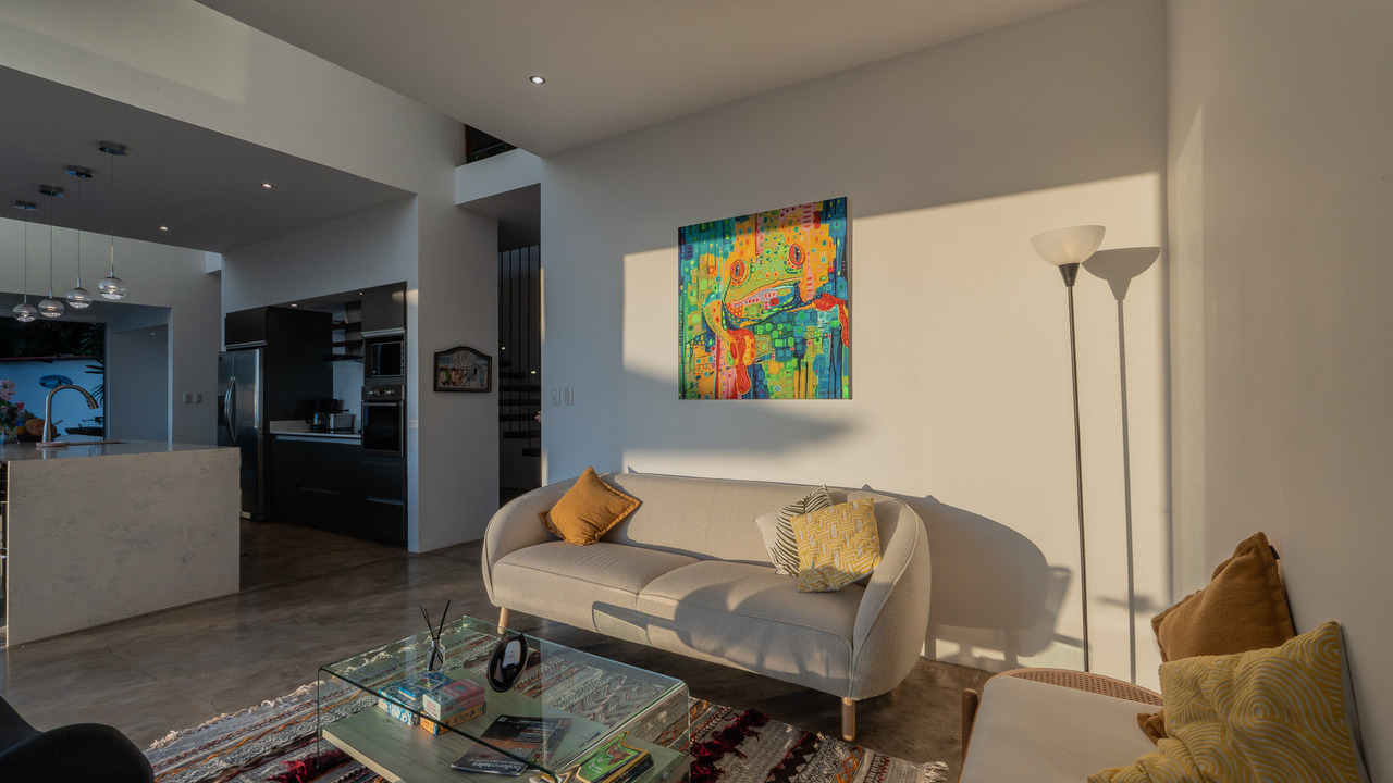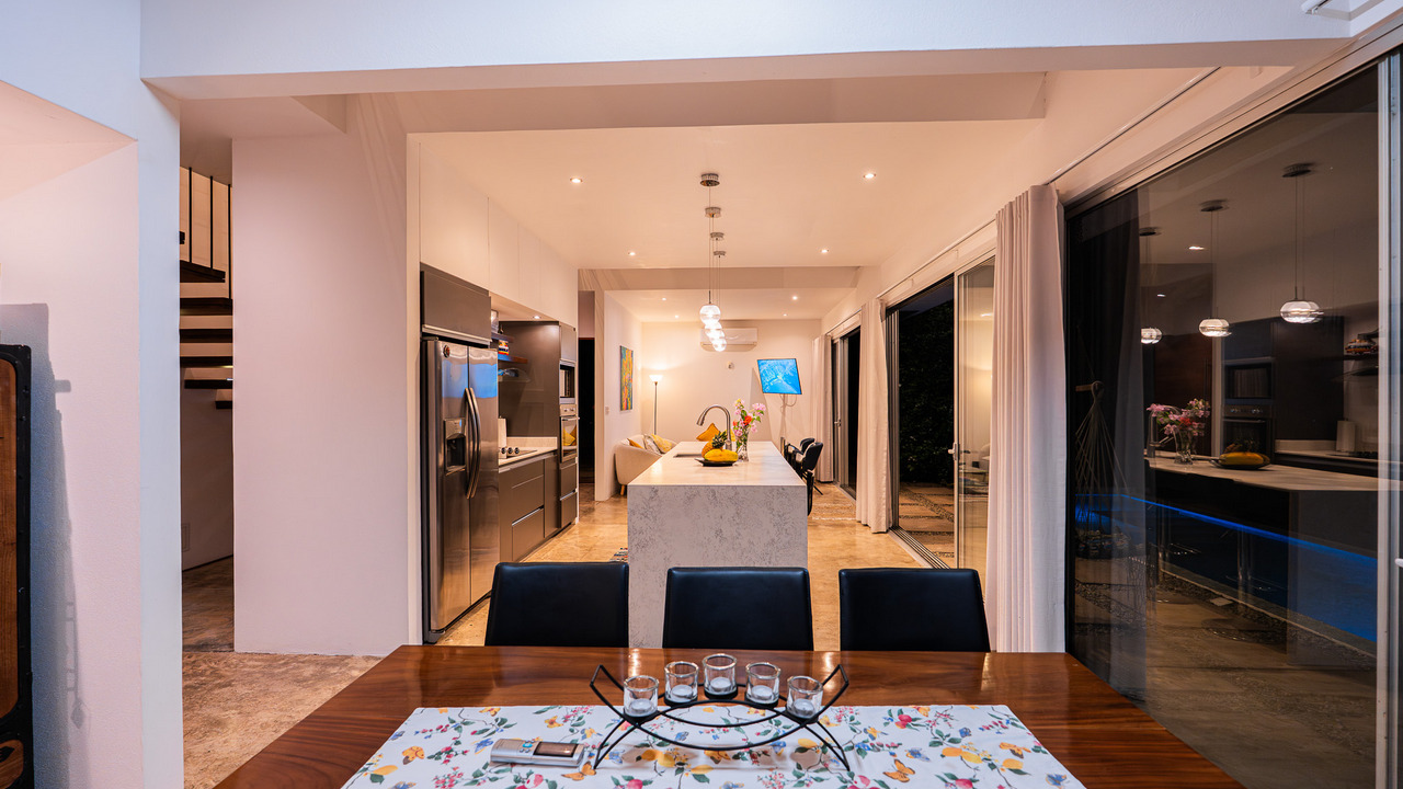 Al ingresar, le recibe una amplia área social con aire acondicionado que integra sala, comedor y una moderna cocina totalmente equipada. Las encimeras de cuarzo, los gabinetes a medida y las grandes puertas de vidrio permiten que la luz natural y las vistas al mar se conviertan en protagonistas. Este nivel también cuenta con un medio baño.