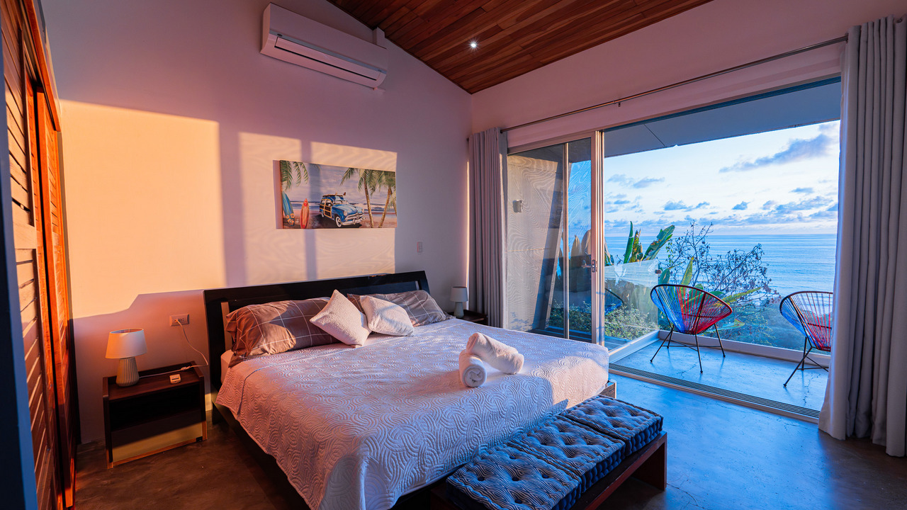 Una elegante escalera de madera conduce a tres dormitorios con aire acondicionado, cada uno con balcón privado y espectaculares vistas al océano.